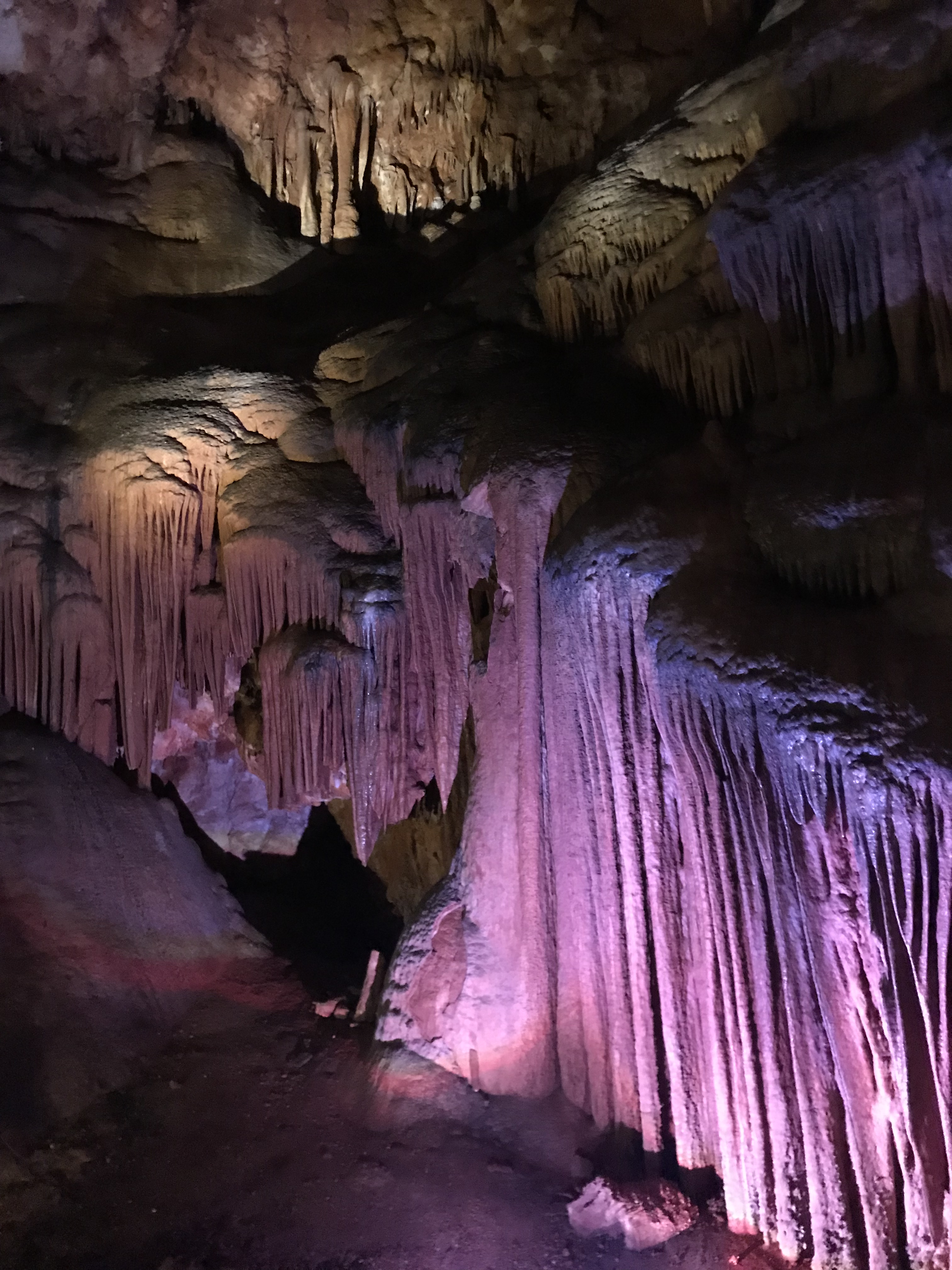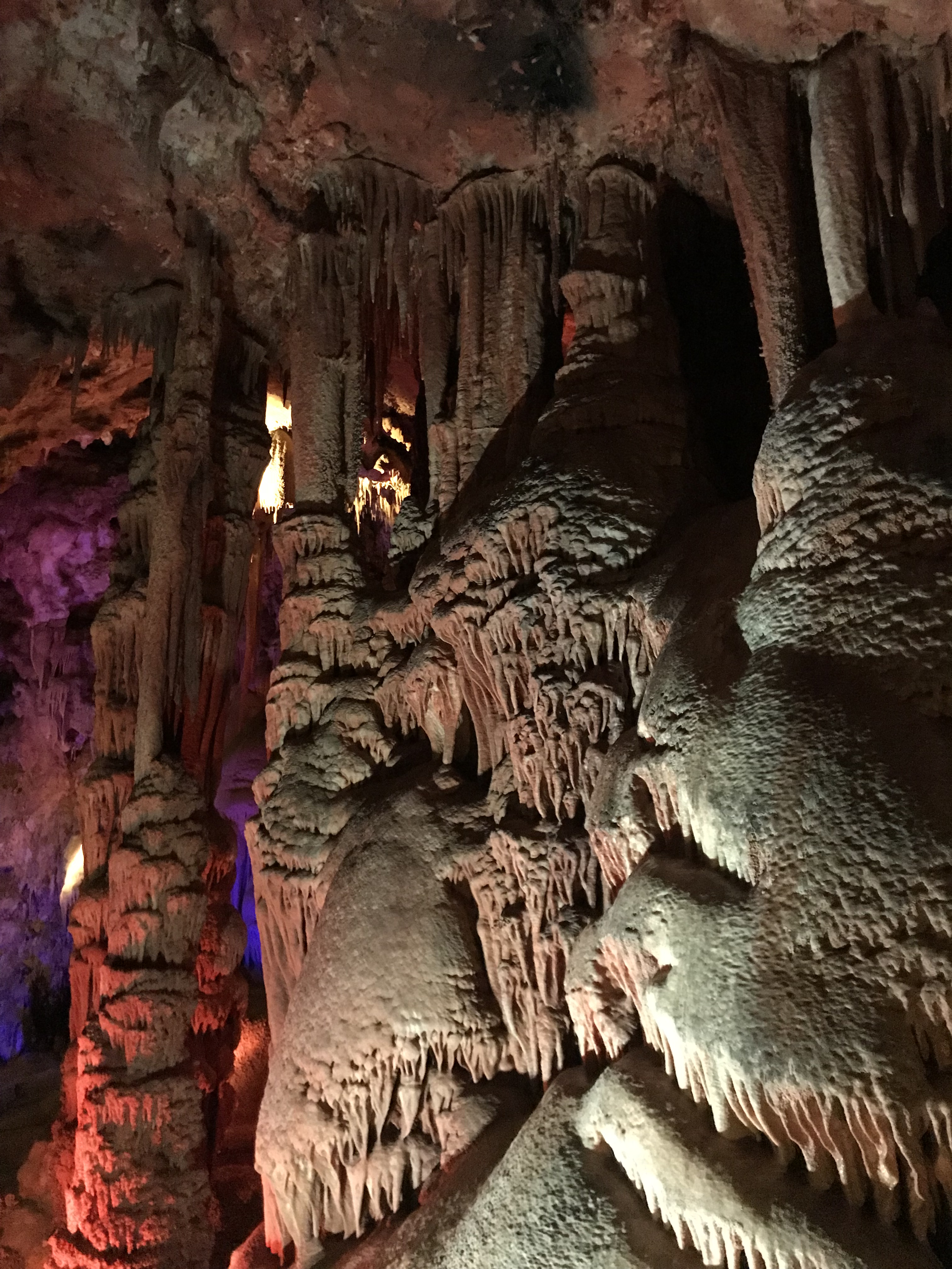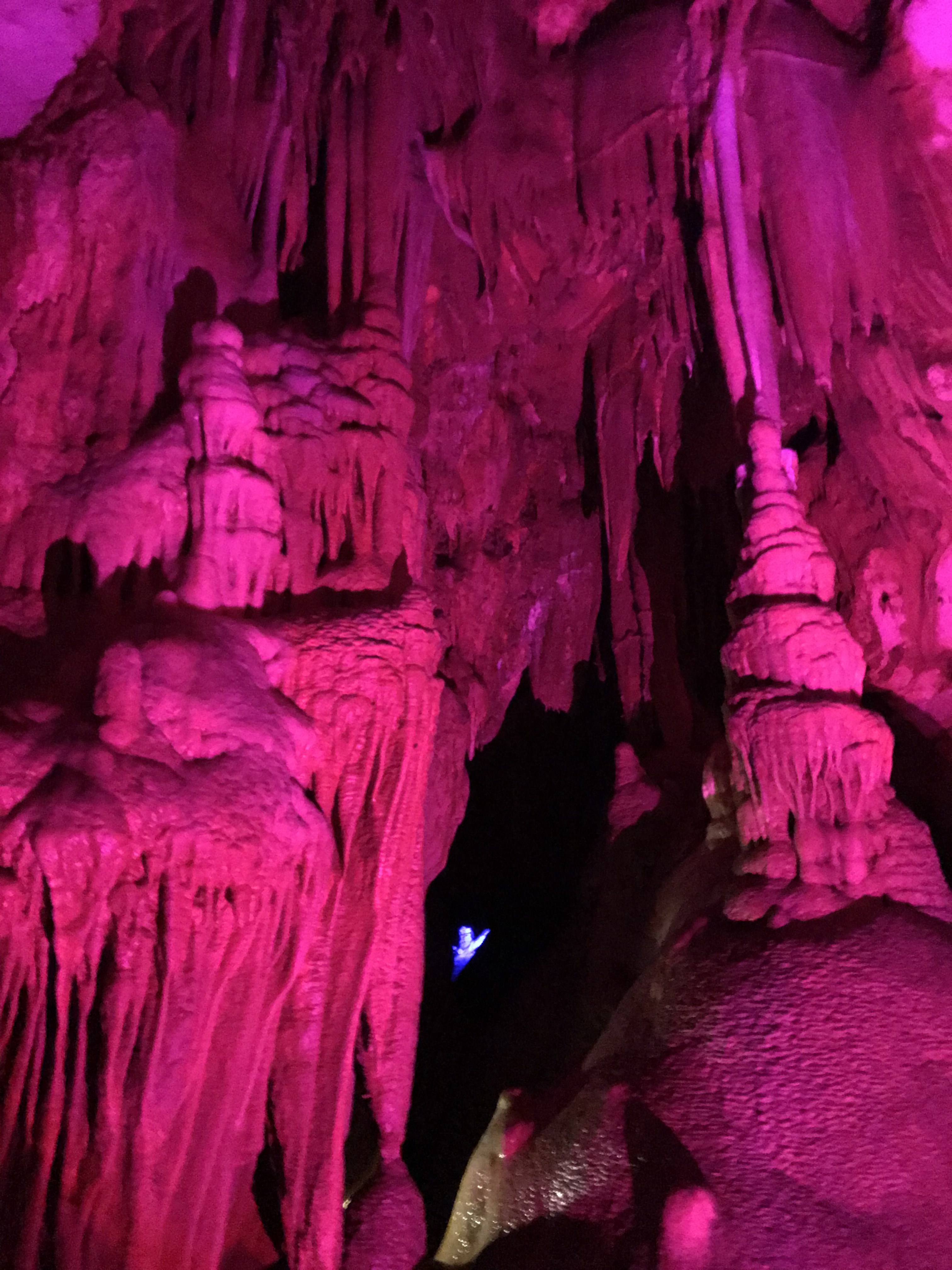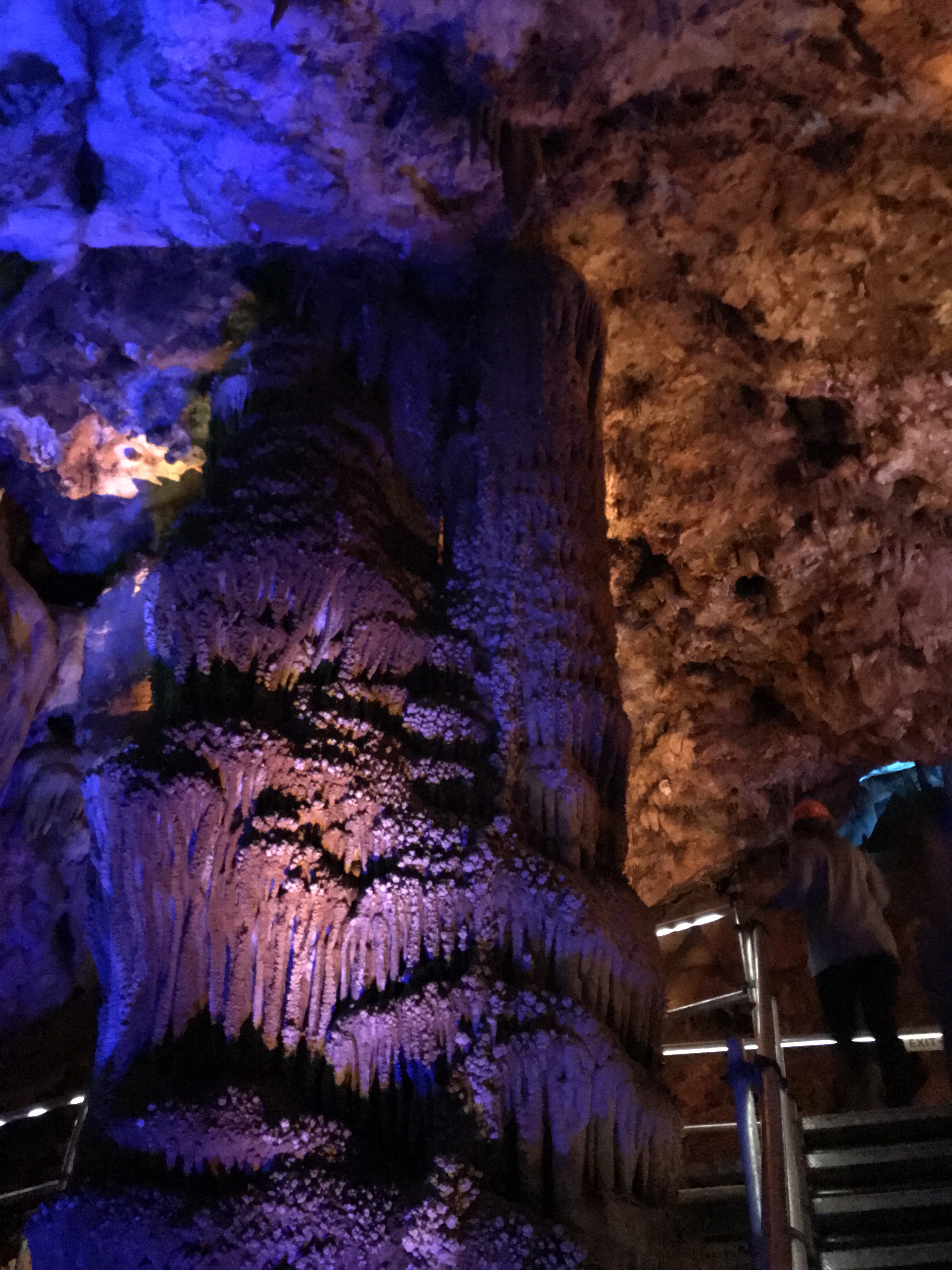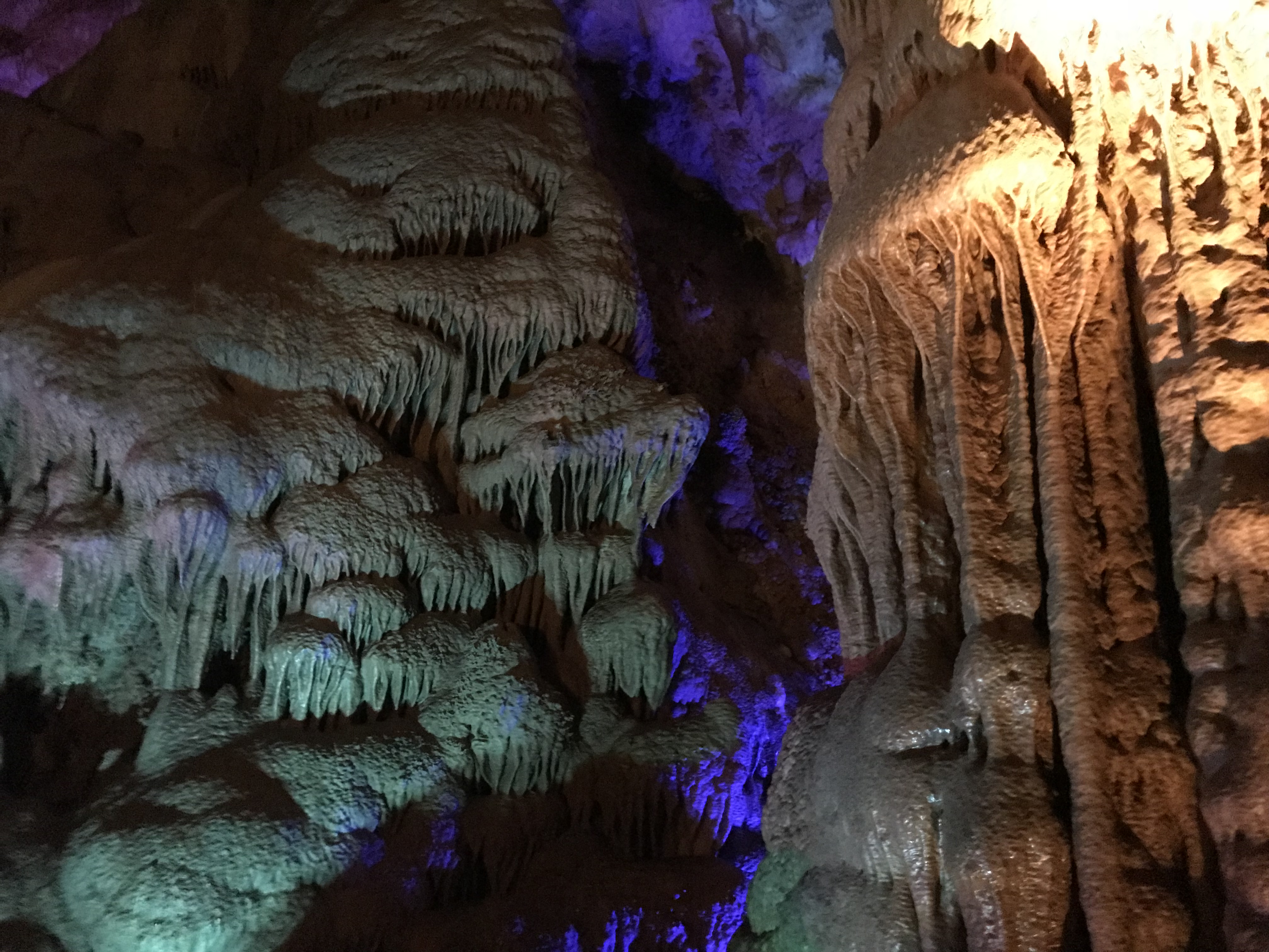 We stayed at the fortress for over an hour before heading back to our car. Next, we headed over the mountain and ended up at a cave at the foot of the mountain. There was some confusion between our tour guide and the people running the cave, as they did not want to take a group of less than 15, and we were 4 total. But the tour guide convinced them to let us in, and two more English speakers joined us. We had to put on hard hats, as some of the stairs were very close to stalactites and other rock formations within the cave. The cave was found in the late 20th century and only opened to the public in 2015, so the natural rock formations are still very well preserved. They had added walkways, stairs, and changing-colored lights, and it was absolutely beautiful.