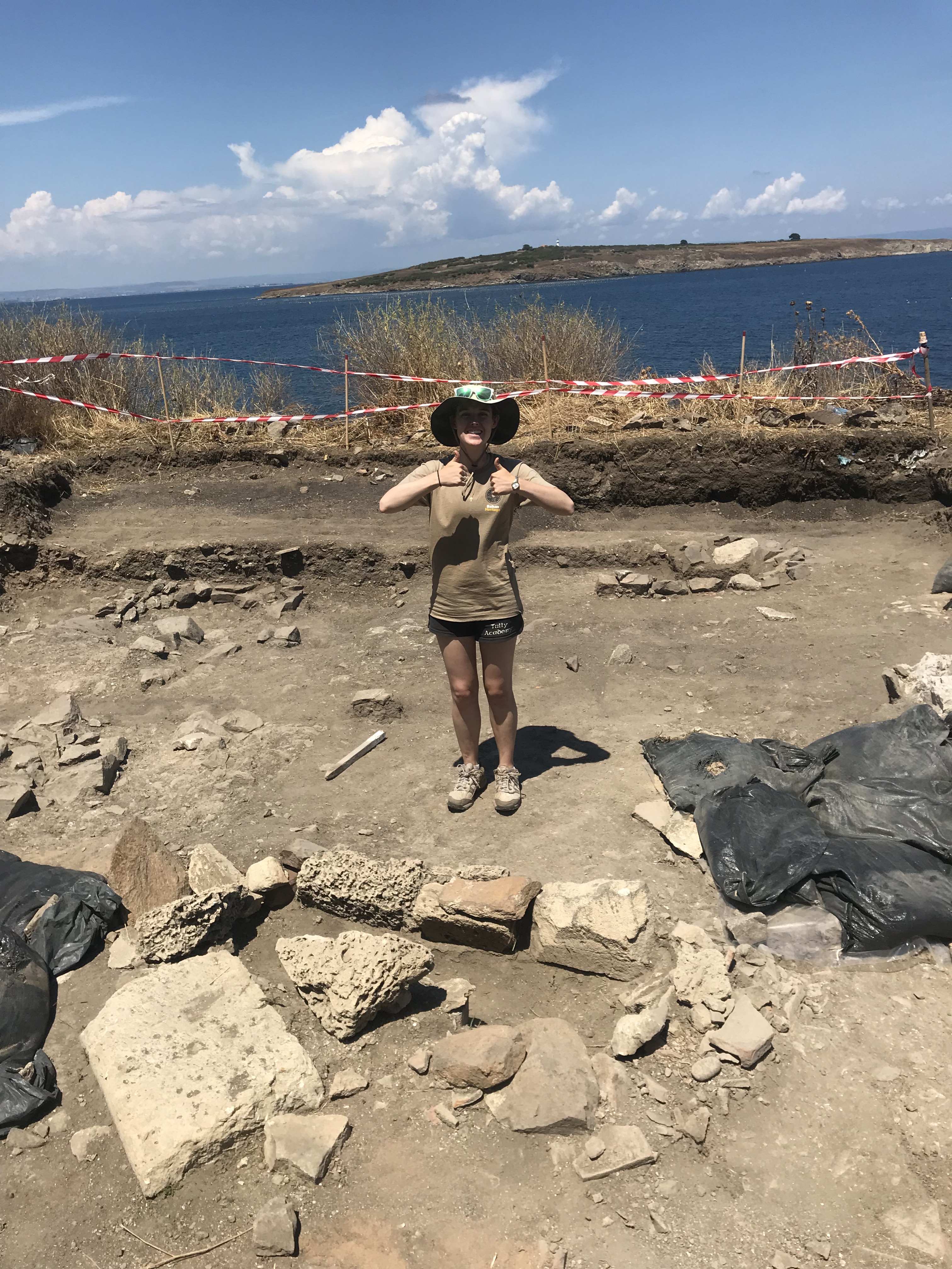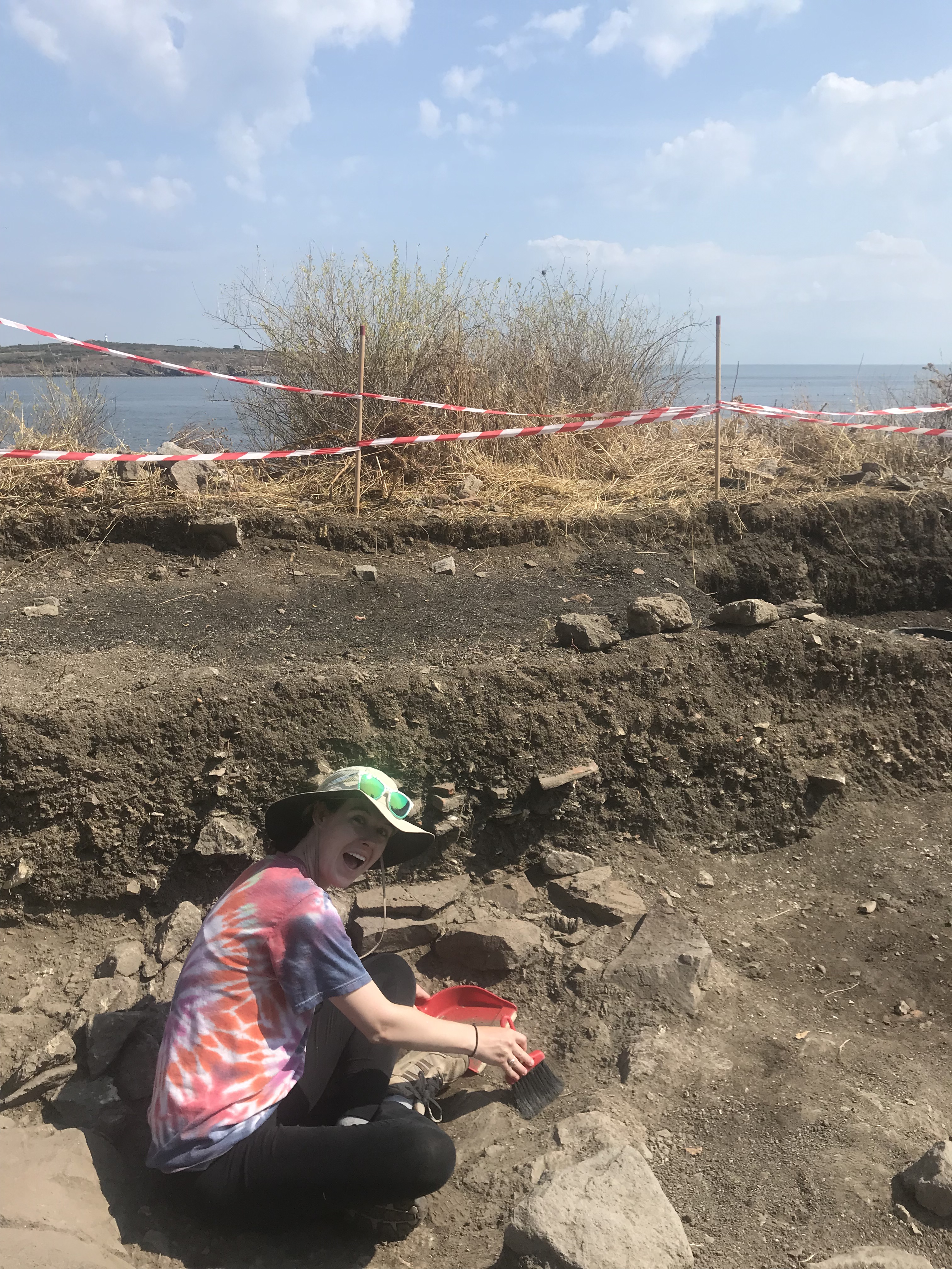 Then, it was the last day of the dig. On the final day, the girls I’d been working with and I brought the rest of the bulk down so that it was level with a pit nearby. Then we sorted all the pottery we’d found from the newly-leveled area. Finally, everybody presented what they’d been working on in their pit and what they’d found. The supervisor showed us some of the most special finds, and then we got a mug and a certificate that said we’d officially completed the course. It was emotional knowing that after two short weeks, we’d all be leaving and the site wouldn’t be touched again until next year. But alums to the program get a discount, so who knows? I’m certainly going on a dig again, and I liked the history of Apollonia enough that I could see myself coming back at some point.