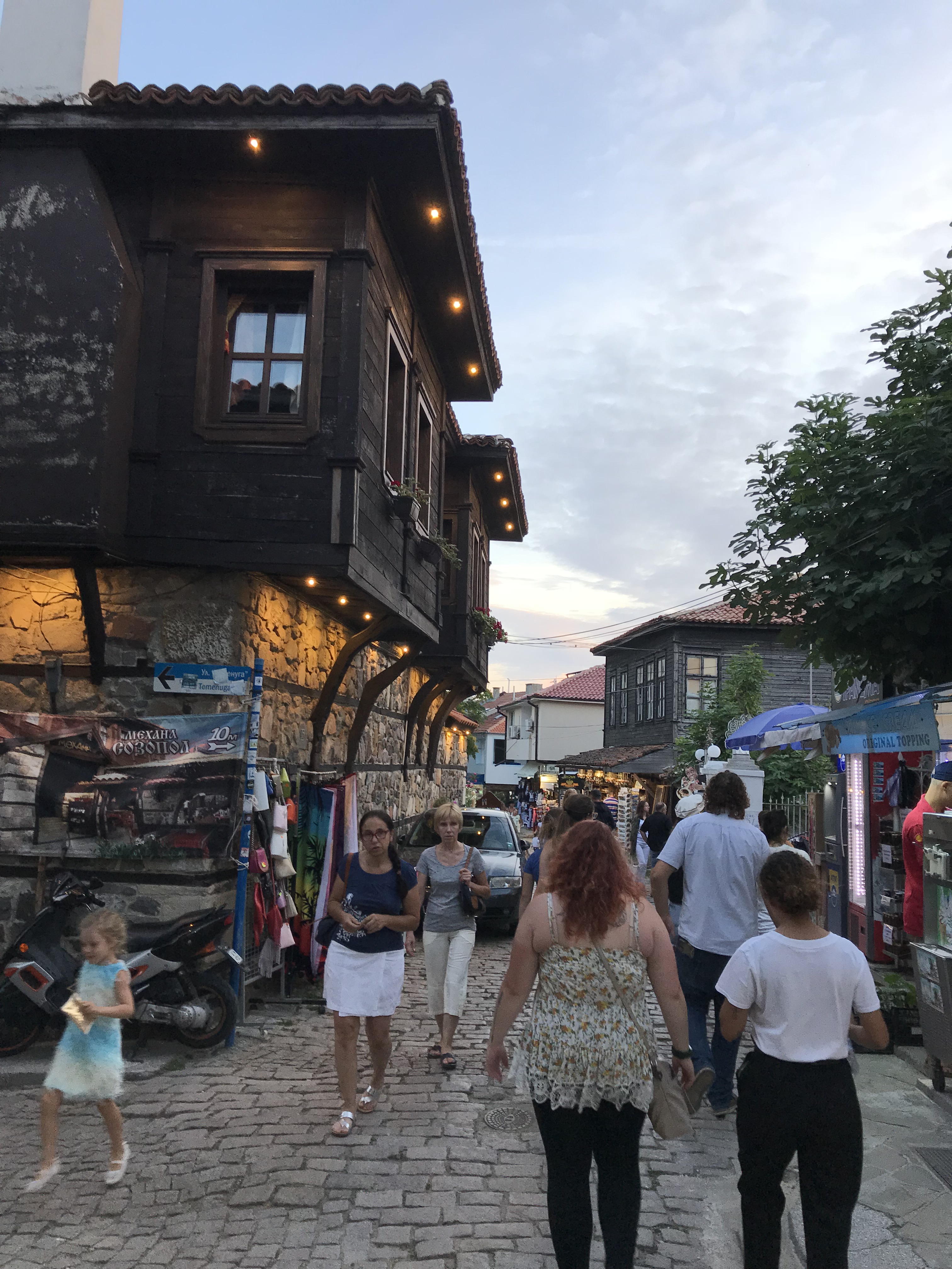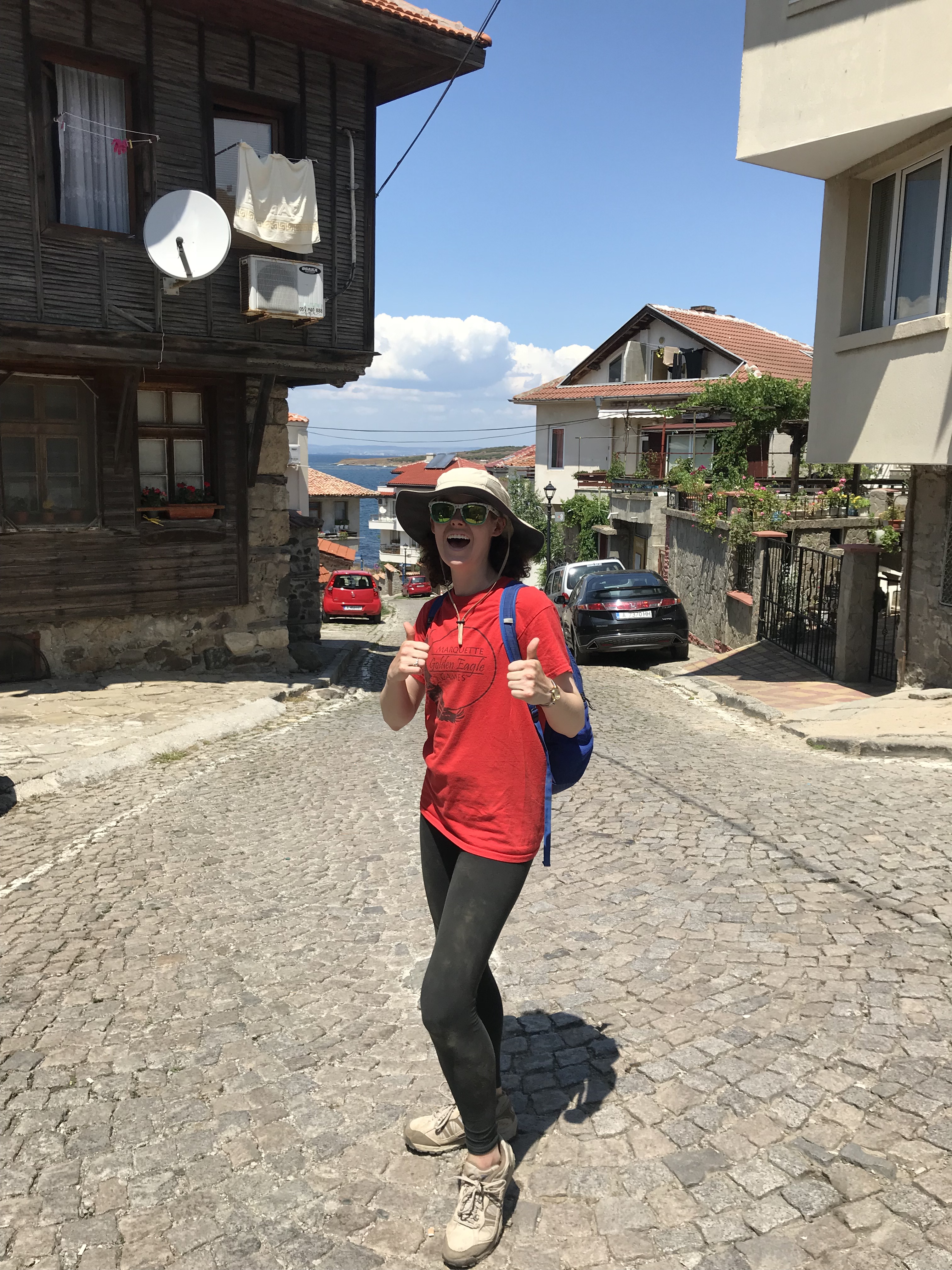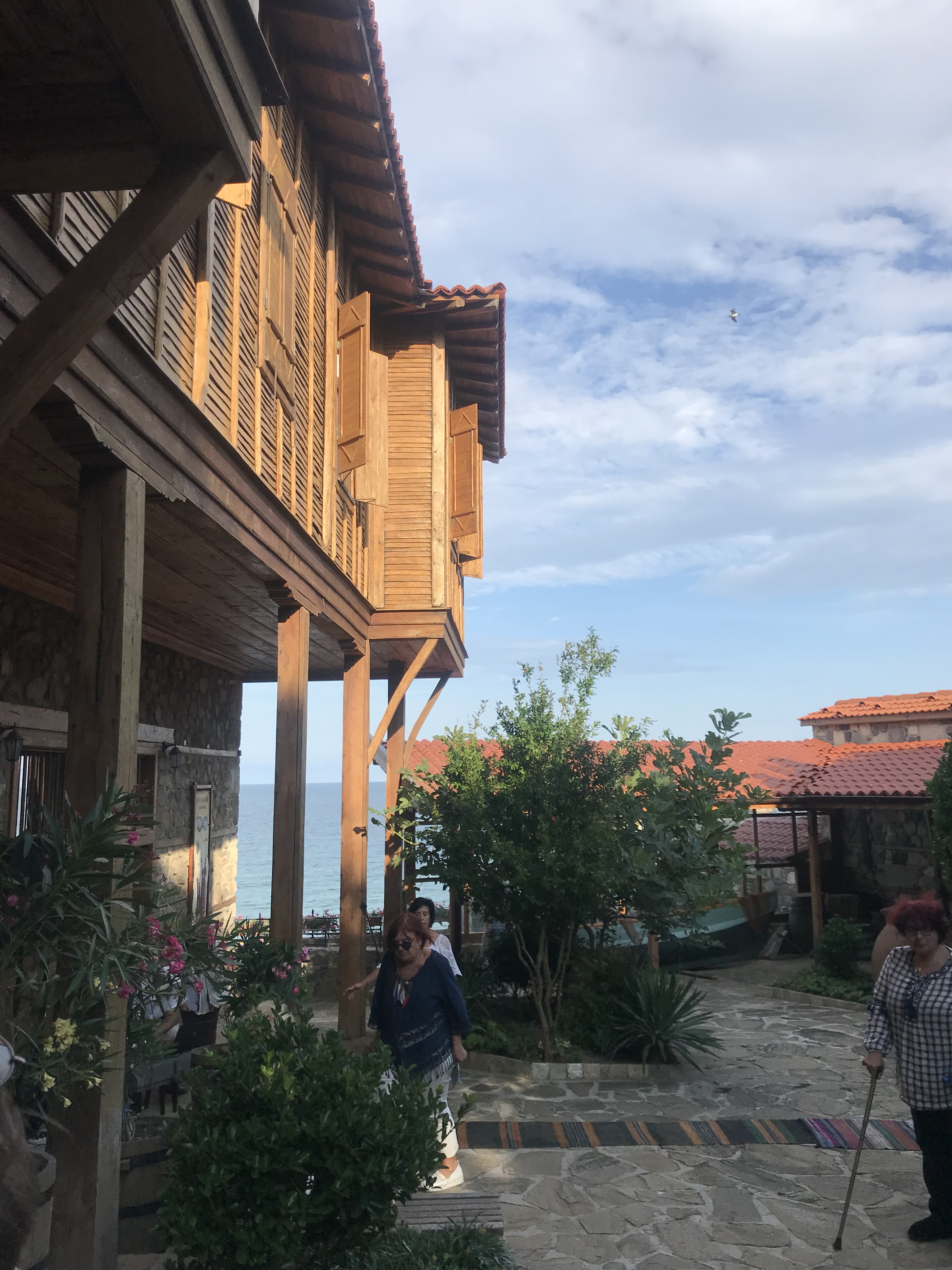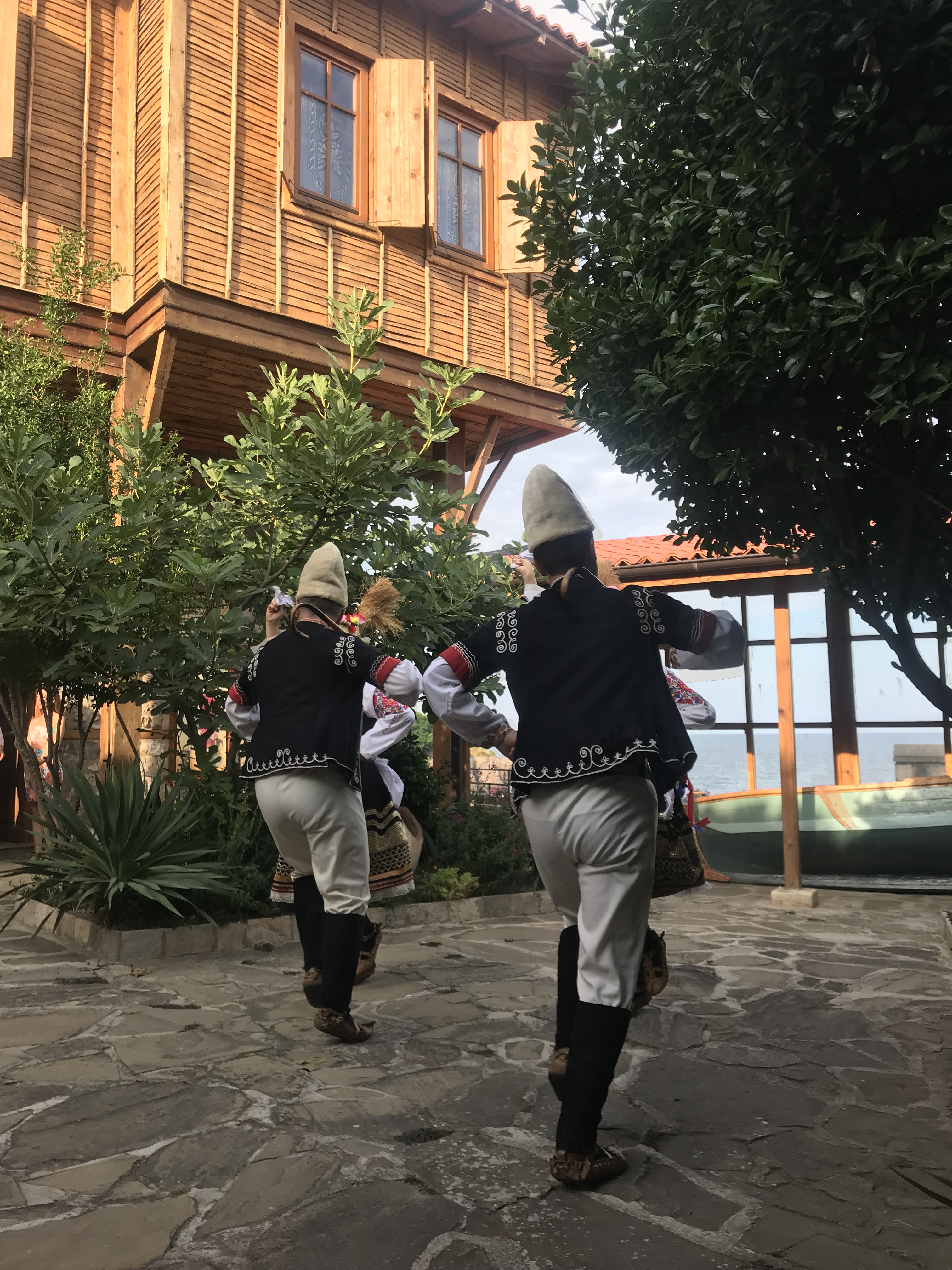 Then, after lunch, my roommate and I relaxed until it was time for our goodbye dinner. We walked through the old town to eat dinner at a traditional restaurant with a windmill overlooking the water. We were served the traditional salad, a chicken and creme dish, and homemade ice cream with green fig. It was a delicious meal, and we got to see and participate in more traditional dance. It was an amazing way to end my time in Sozopol.