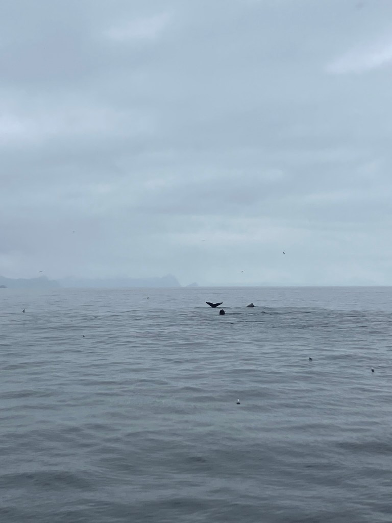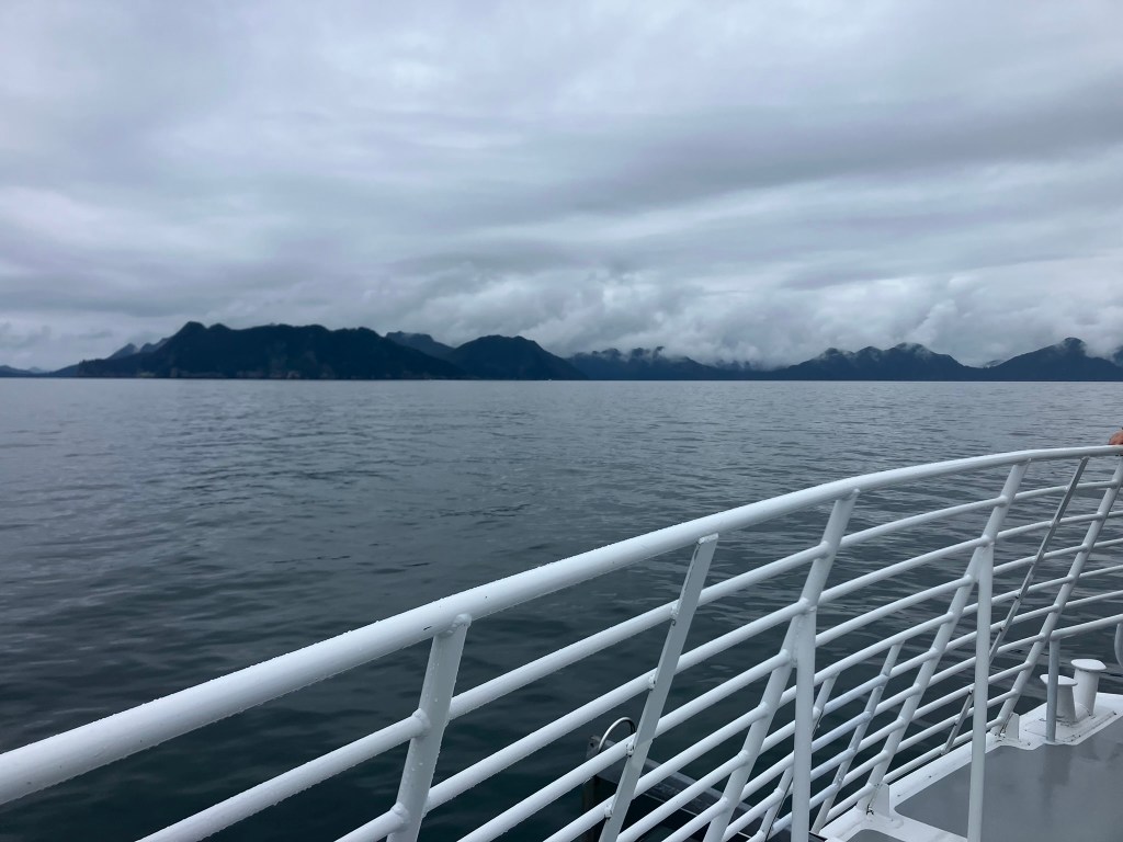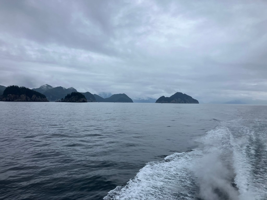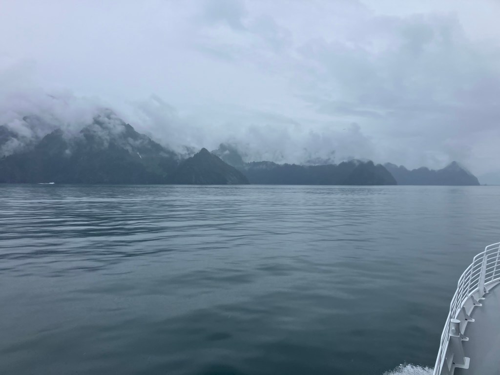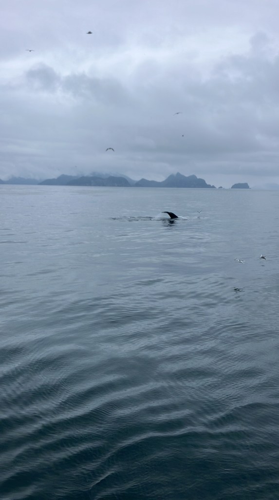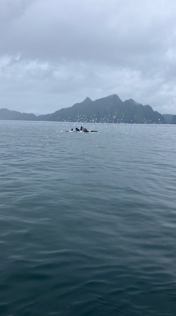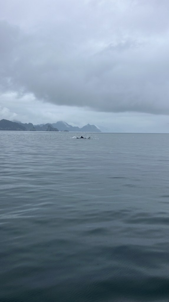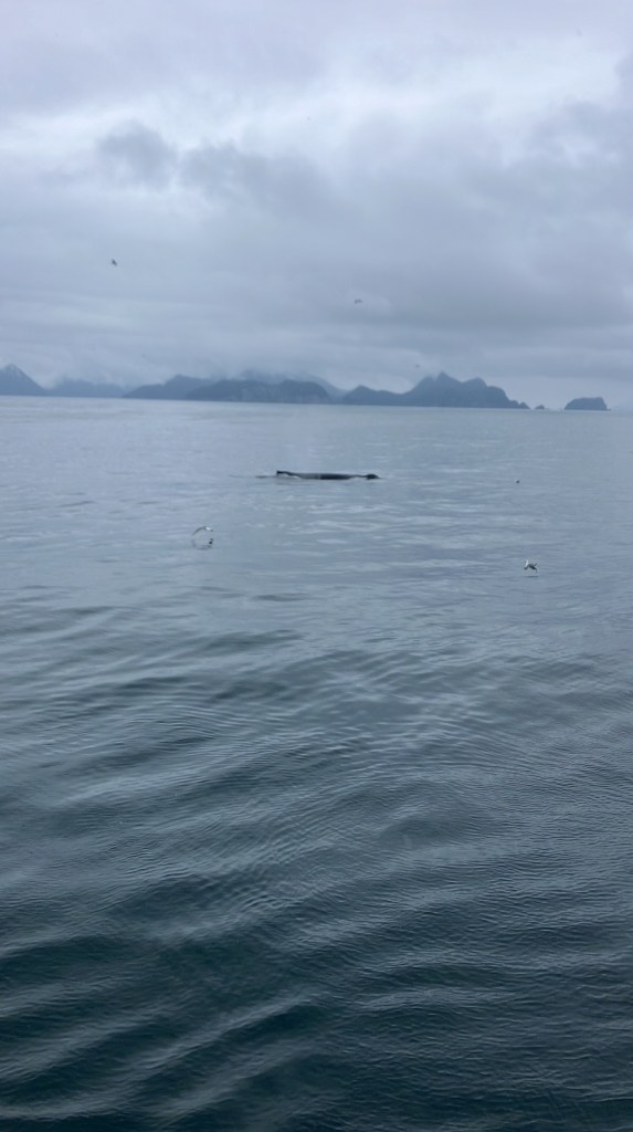 We started the boat trip by exiting Resurrection Bay. We enjoyed a warm lunch while the boat made its way through the fjord and out towards the ocean. Only about an hour into our ride, after catching sight of puffins, sea birds, and a seal we slowed down with rumors of a whale sighting. Suddenly, we were seeing seven blow spouts and humpbacks and tails of humpback whales. For at least half an hour, we followed the whales as they participated in more and more complex fishing rituals that culminated in one of the most magical moments I’d ever seen. At least four times, the whales went below the surface, circled around, and popped out of the water with only a few bubbles for warning. At one point, they were essentially performing this ritual right in front of our ship, so close you could see the barnacles on them. The girls who were working on the boat said they’d never seen such a good showing by the whales, and it did certainly feel like something special.