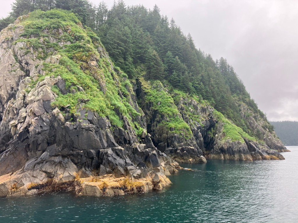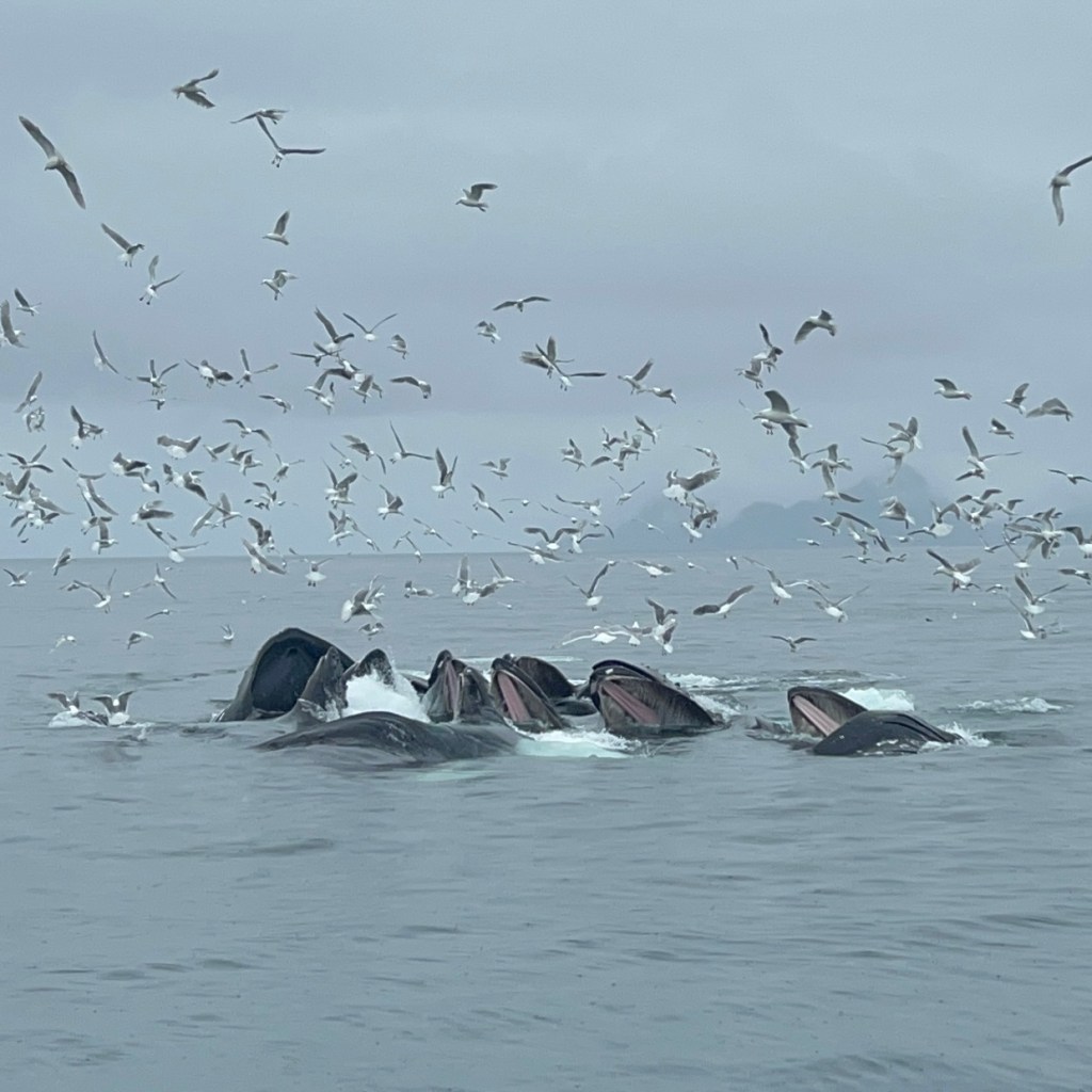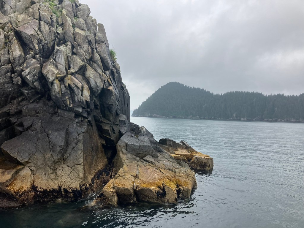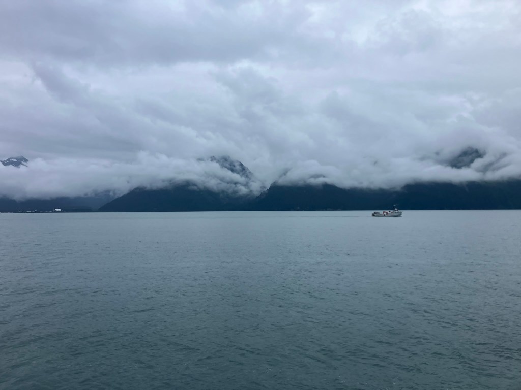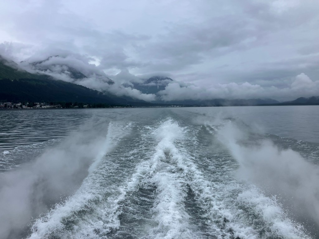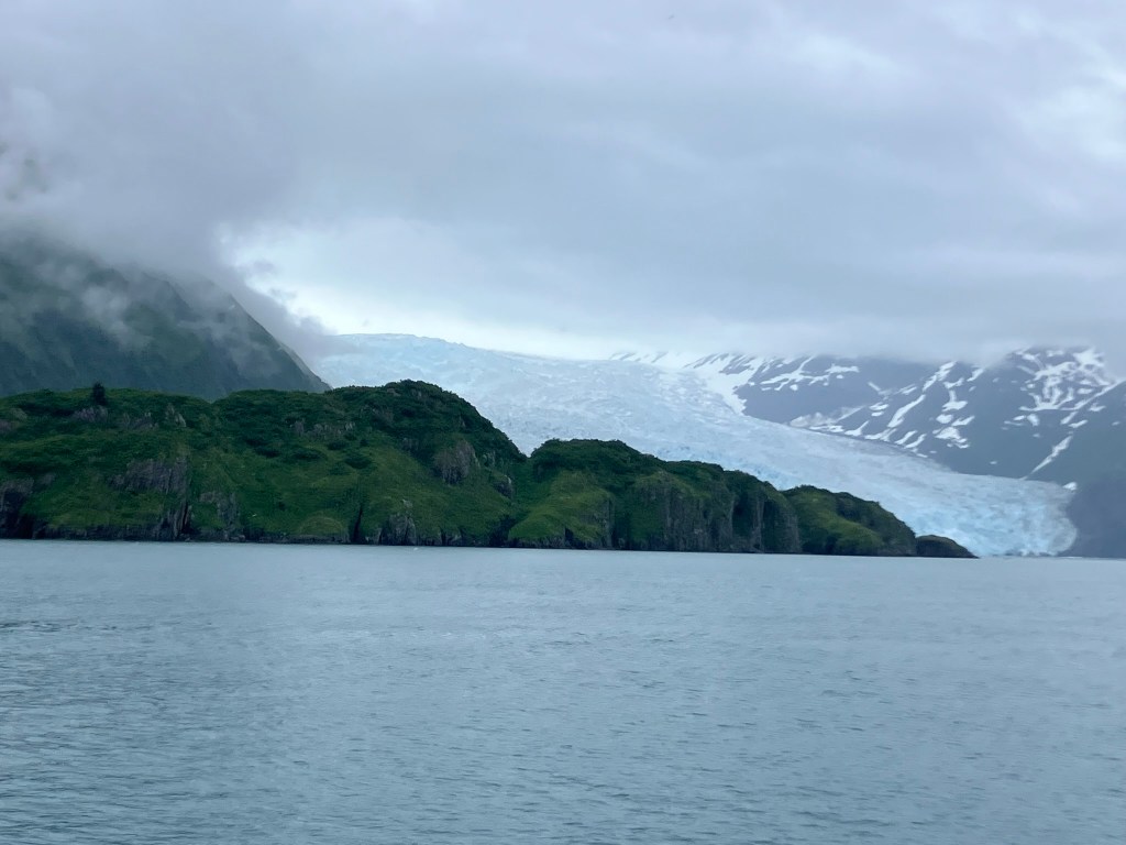 We started the boat trip by exiting Resurrection Bay. We enjoyed a warm lunch while the boat made its way through the fjord and out towards the ocean. Only about an hour into our ride, after catching sight of puffins, sea birds, and a seal we slowed down with rumors of a whale sighting. Suddenly, we were seeing seven blow spouts and humpbacks and tails of humpback whales. For at least half an hour, we followed the whales as they participated in more and more complex fishing rituals that culminated in one of the most magical moments I’d ever seen. At least four times, the whales went below the surface, circled around, and popped out of the water with only a few bubbles for warning. At one point, they were essentially performing this ritual right in front of our ship, so close you could see the barnacles on them. The girls who were working on the boat said they’d never seen such a good showing by the whales, and it did certainly feel like something special.