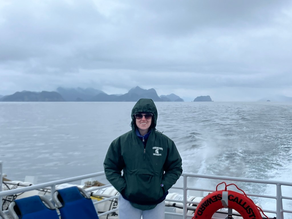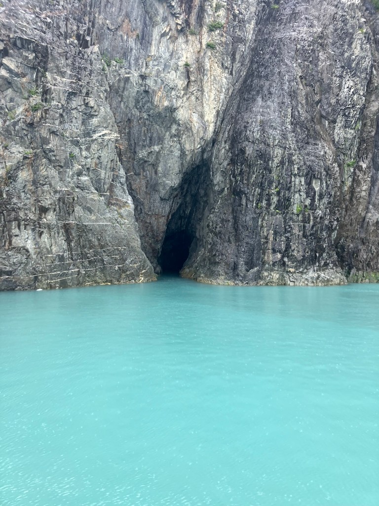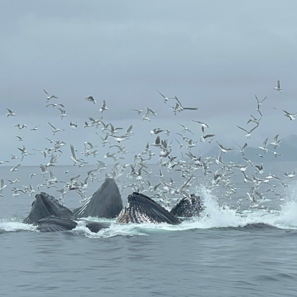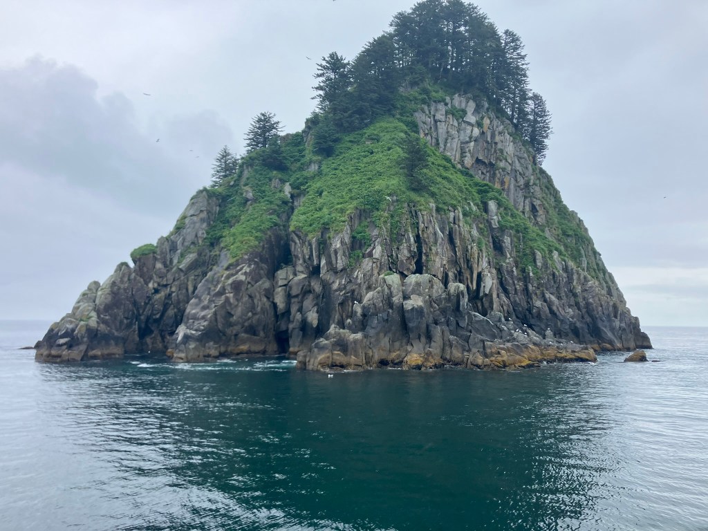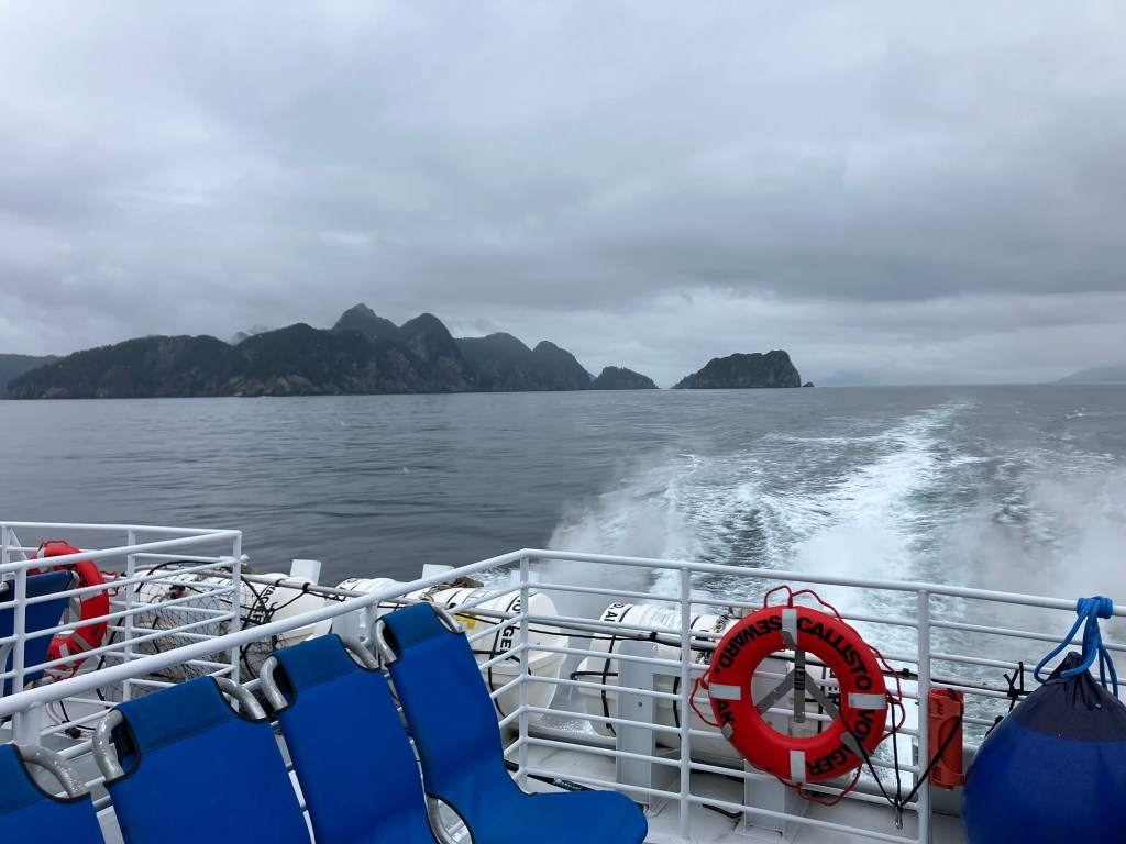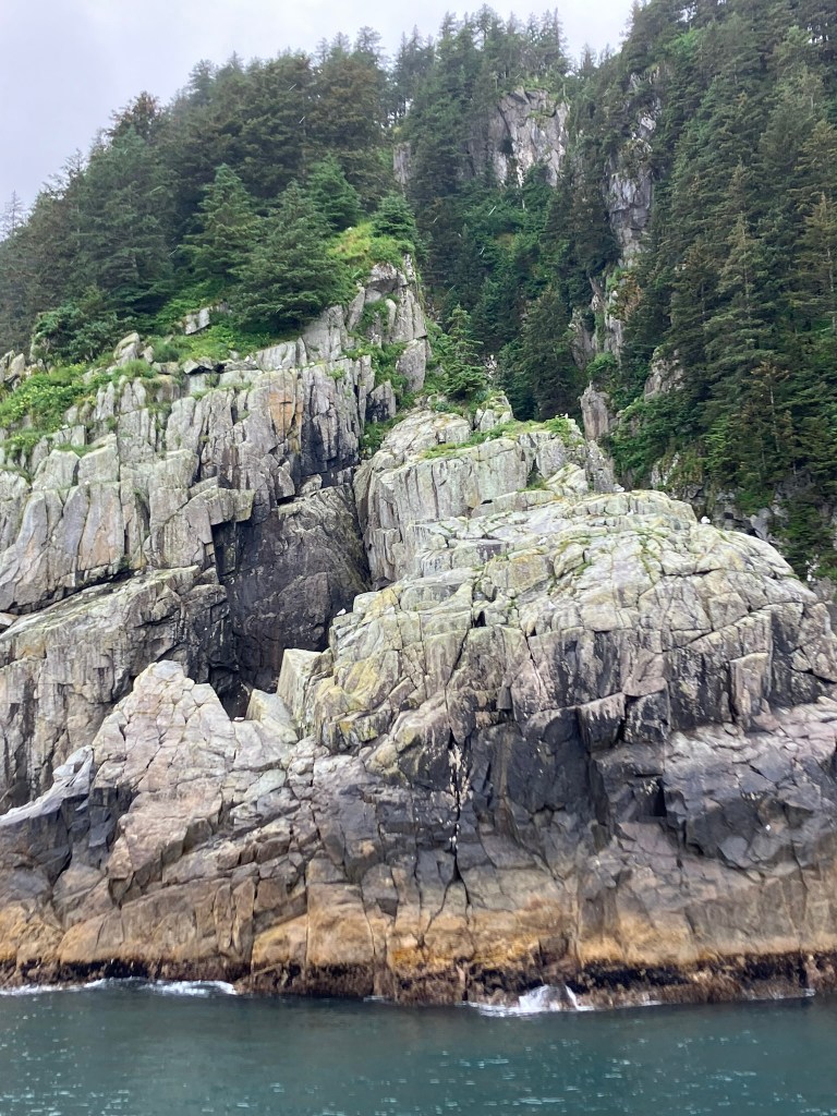 We started the boat trip by exiting Resurrection Bay. We enjoyed a warm lunch while the boat made its way through the fjord and out towards the ocean. Only about an hour into our ride, after catching sight of puffins, sea birds, and a seal we slowed down with rumors of a whale sighting. Suddenly, we were seeing seven blow spouts and humpbacks and tails of humpback whales. For at least half an hour, we followed the whales as they participated in more and more complex fishing rituals that culminated in one of the most magical moments I’d ever seen. At least four times, the whales went below the surface, circled around, and popped out of the water with only a few bubbles for warning. At one point, they were essentially performing this ritual right in front of our ship, so close you could see the barnacles on them. The girls who were working on the boat said they’d never seen such a good showing by the whales, and it did certainly feel like something special.