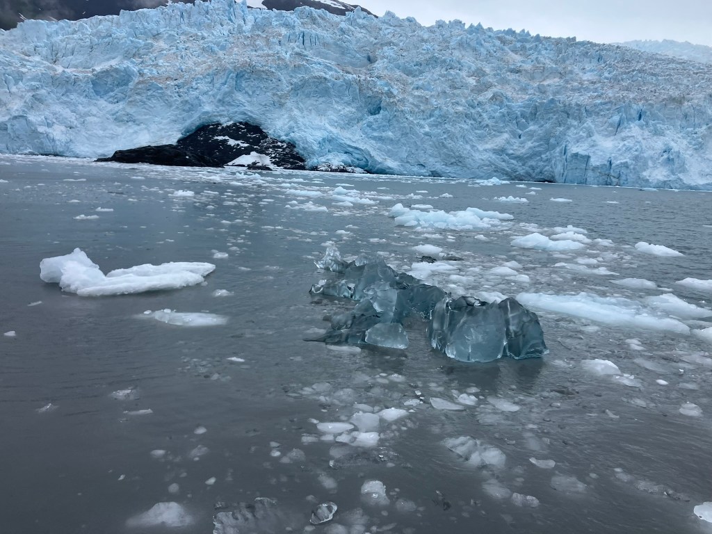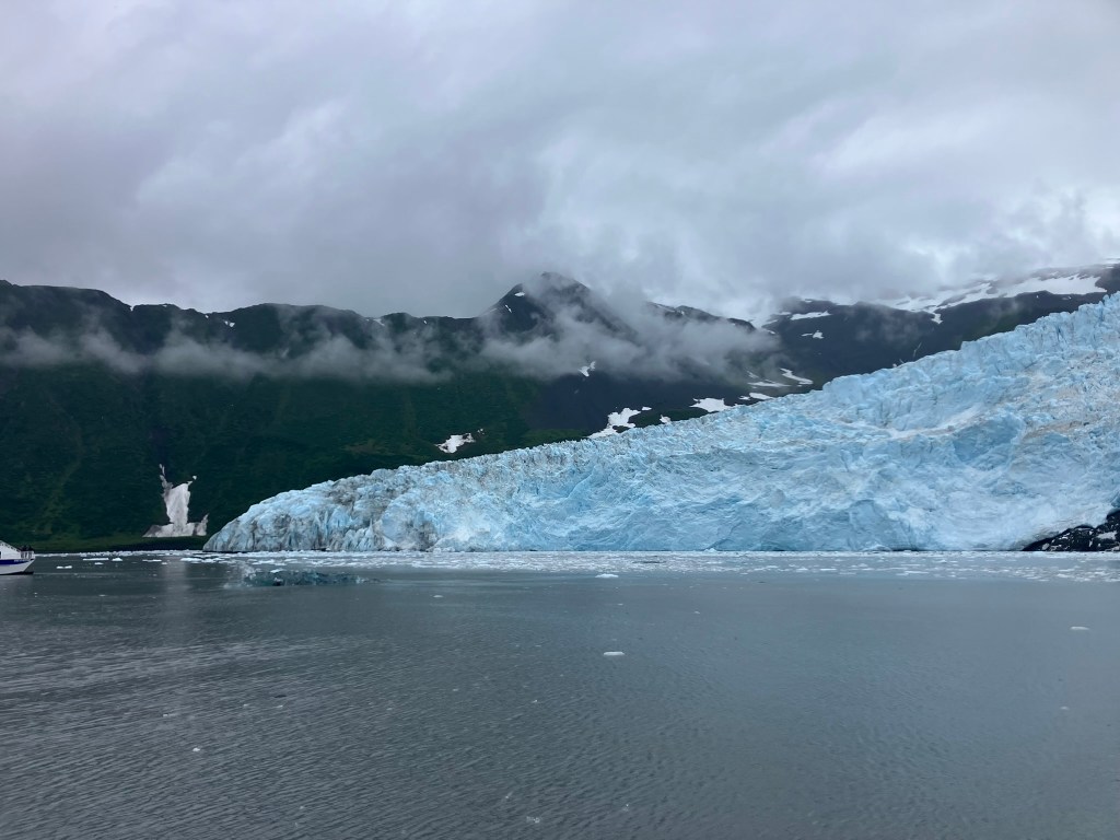 We also ended up visiting a glacier up close and personal (or about a half-mile away, as up-close and personal as you’d want to get for a glacier that was calving, or falling, into the water). We watched the glacier for a while, waiting to see and hear the ice break off and fall into the water, forming new icebergs that sea creatures like seals use as nesting floes.