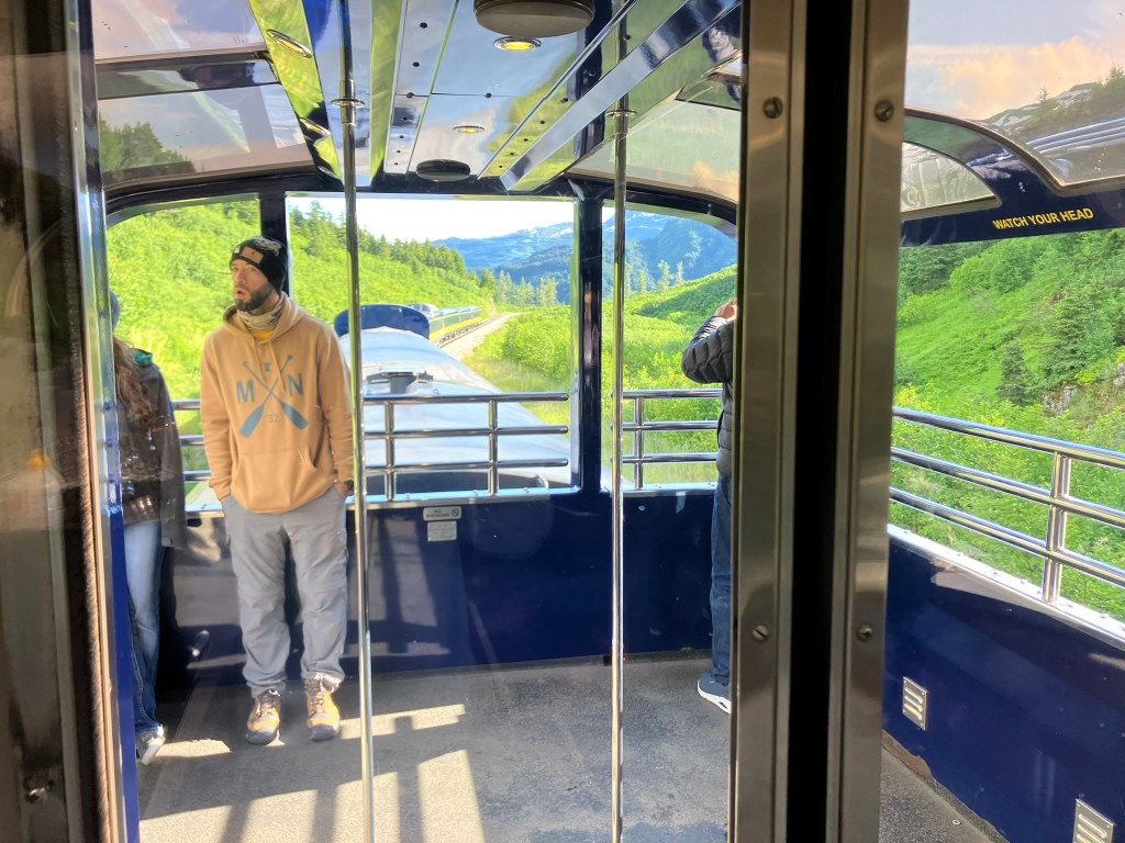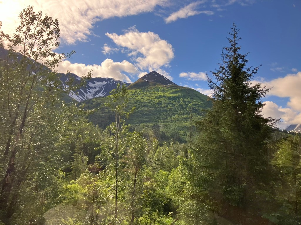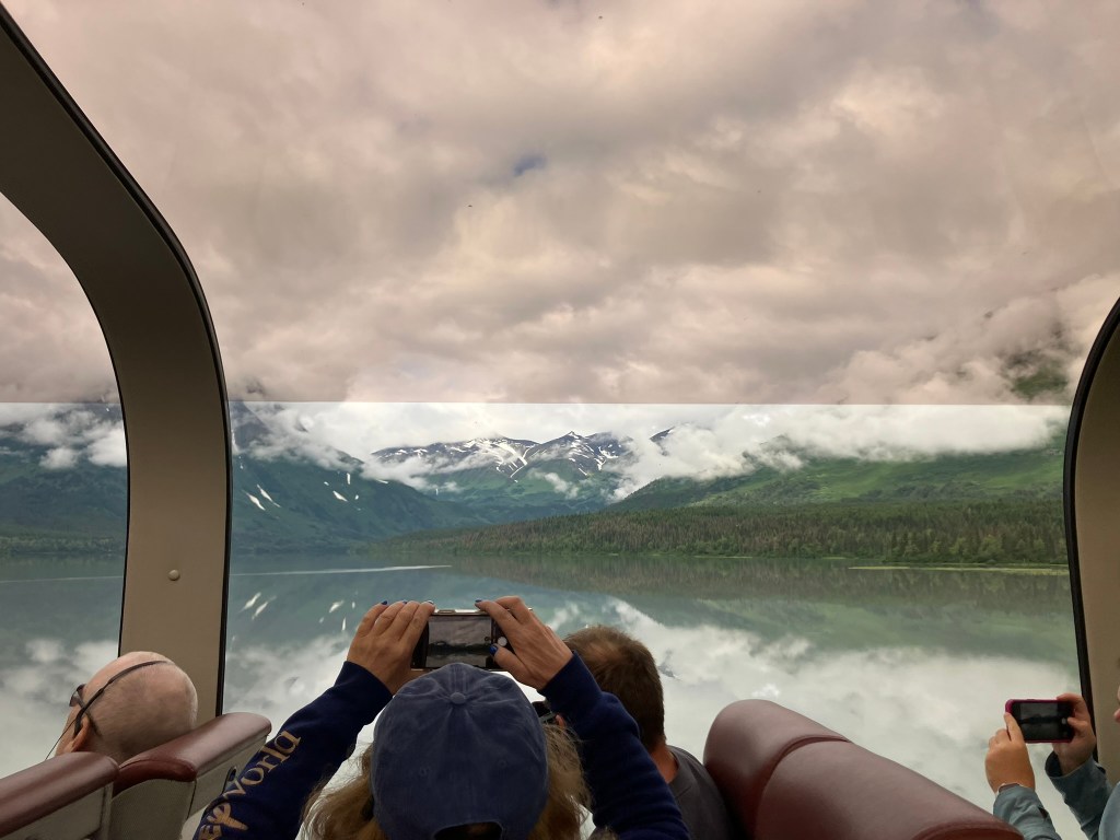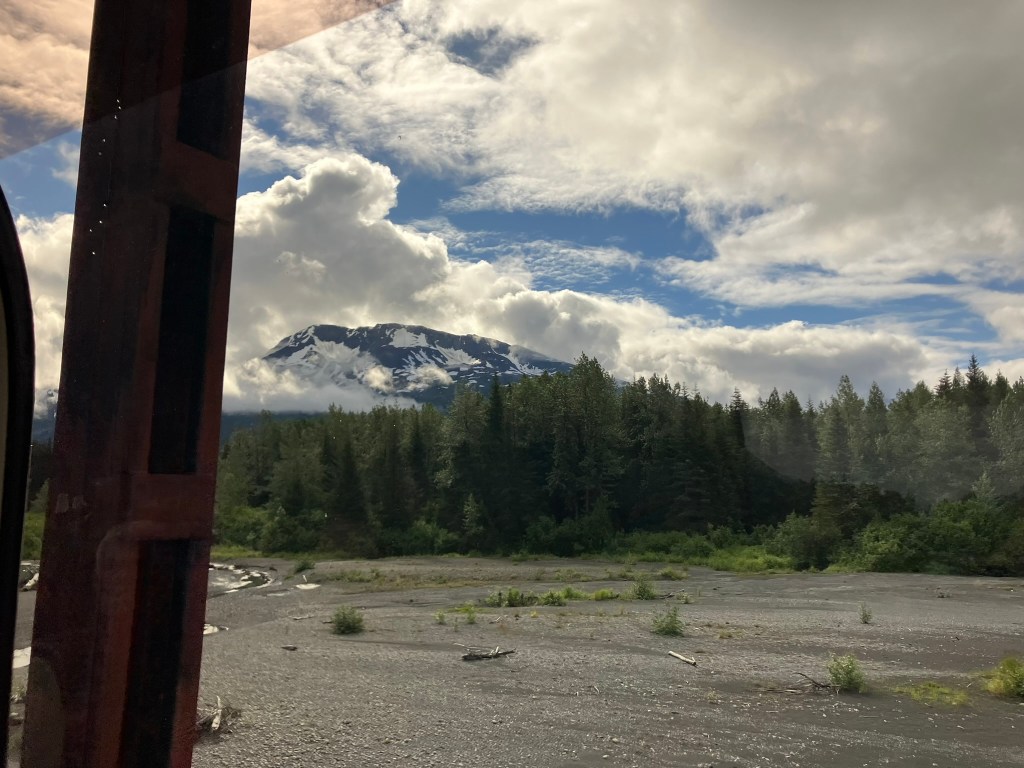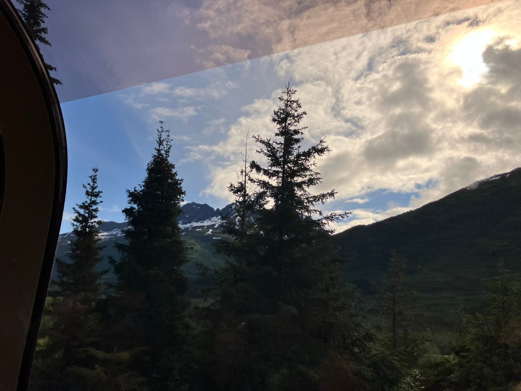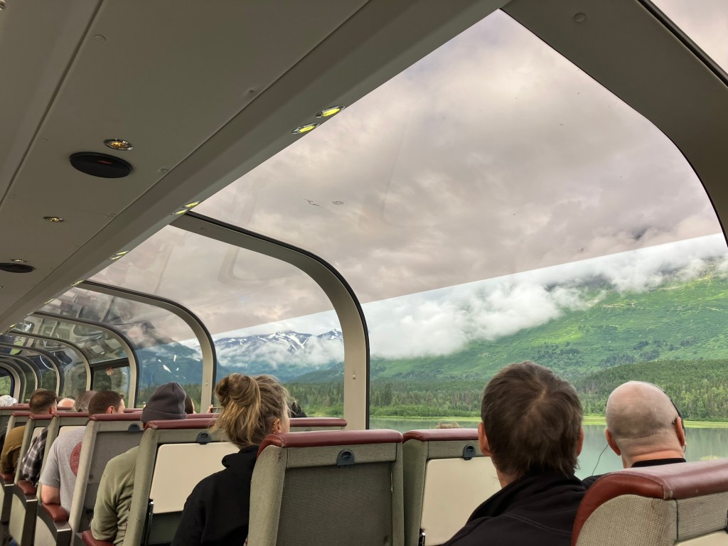 The second full day of our trip was our train adventure. We woke up before 6 and made our way to the train station. Now, all three of us are fairly well-traveled, and we’ve taken a fair number of trains in our lives. But at least Becca and I have never taken a train simply for the train ride. Instead, it’s always been primarily a form of transportation. But this train ride was the activity of the day. We’d arranged a tour that made all of our reservations for us, and the lady who’d helped me with the reservations had been able to upgrade our train rides for no extra cost. So we got the fancy treatment for this train ride. The car that we were in had glass roofs, a little outdoor viewing station, free drinks, and breakfast included. We took the nice four-hour ride, with the train employees periodically giving us history about Alaska. Our train tour guides, we learned, were high school students who had taken a class on Alaskan history and interviewed to get the job of sharing info during our ride.