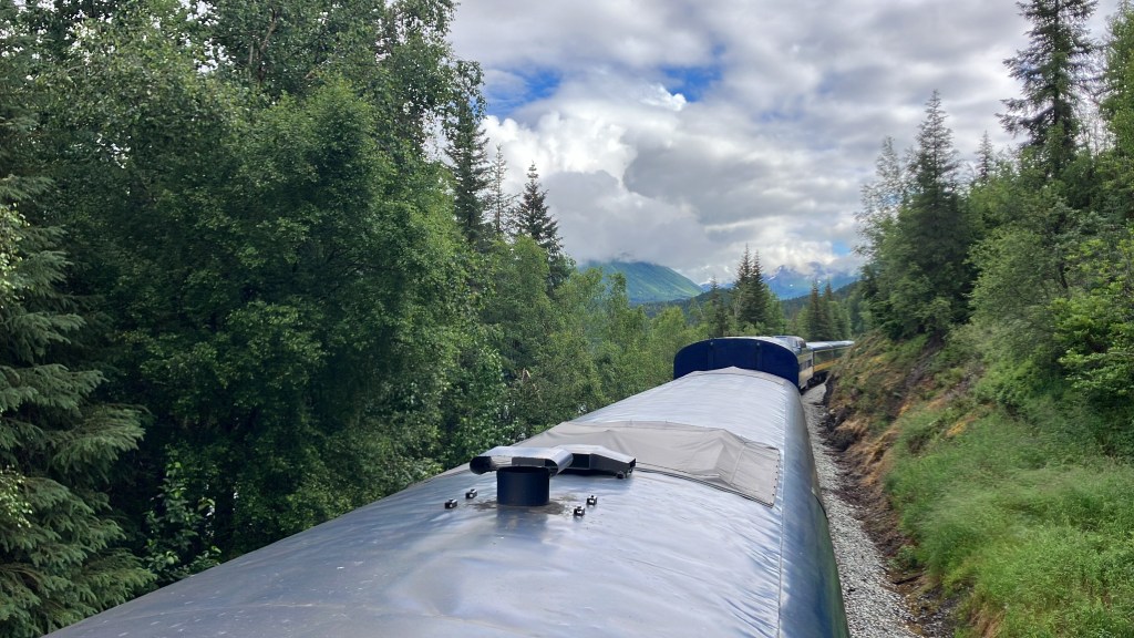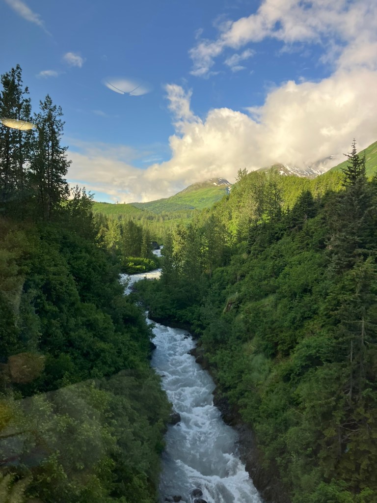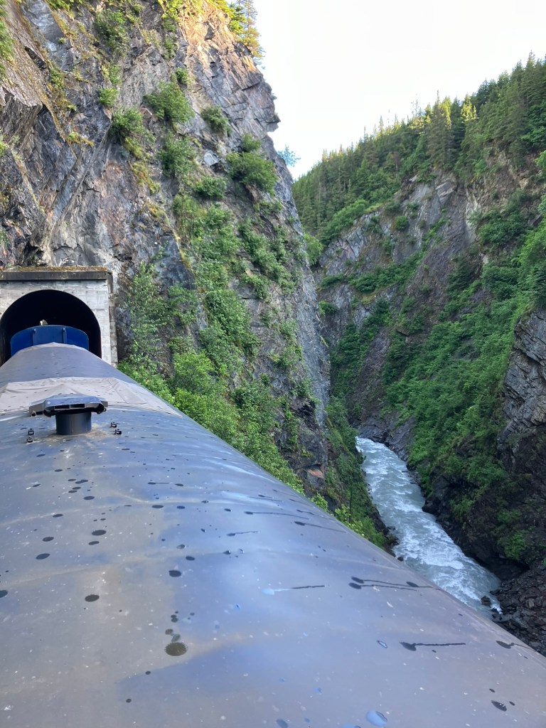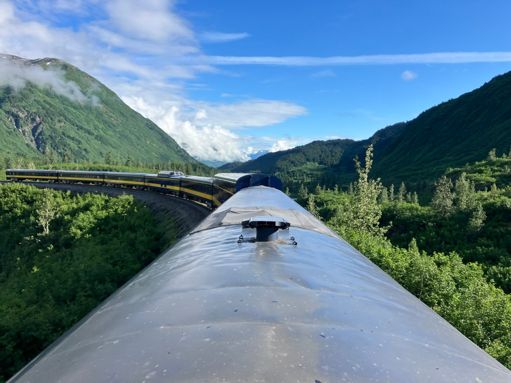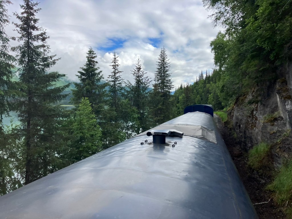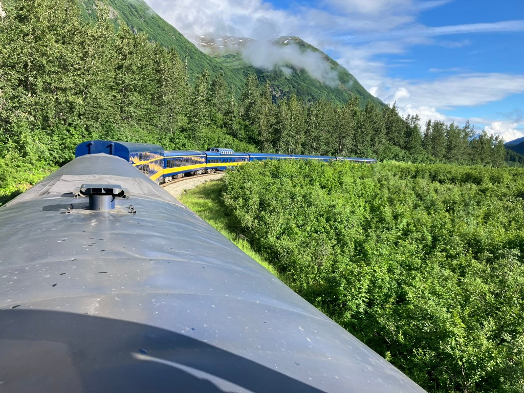 The second full day of our trip was our train adventure. We woke up before 6 and made our way to the train station. Now, all three of us are fairly well-traveled, and we’ve taken a fair number of trains in our lives. But at least Becca and I have never taken a train simply for the train ride. Instead, it’s always been primarily a form of transportation. But this train ride was the activity of the day. We’d arranged a tour that made all of our reservations for us, and the lady who’d helped me with the reservations had been able to upgrade our train rides for no extra cost. So we got the fancy treatment for this train ride. The car that we were in had glass roofs, a little outdoor viewing station, free drinks, and breakfast included. We took the nice four-hour ride, with the train employees periodically giving us history about Alaska. Our train tour guides, we learned, were high school students who had taken a class on Alaskan history and interviewed to get the job of sharing info during our ride.