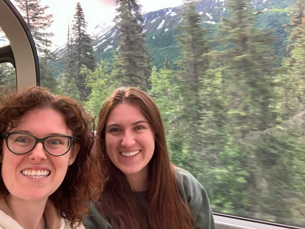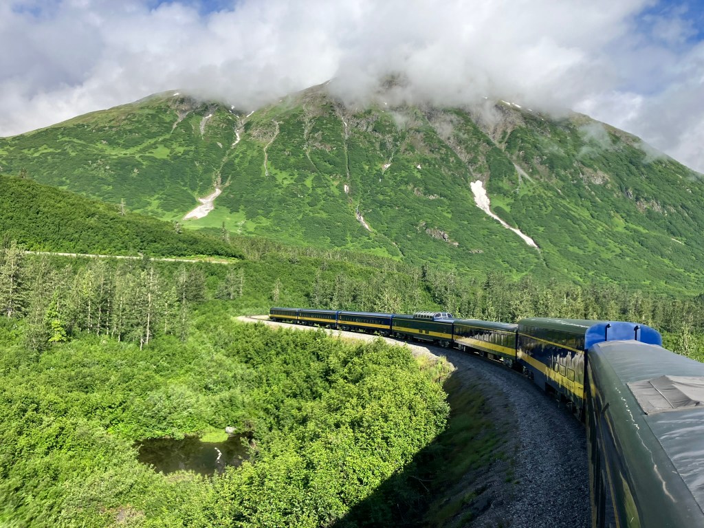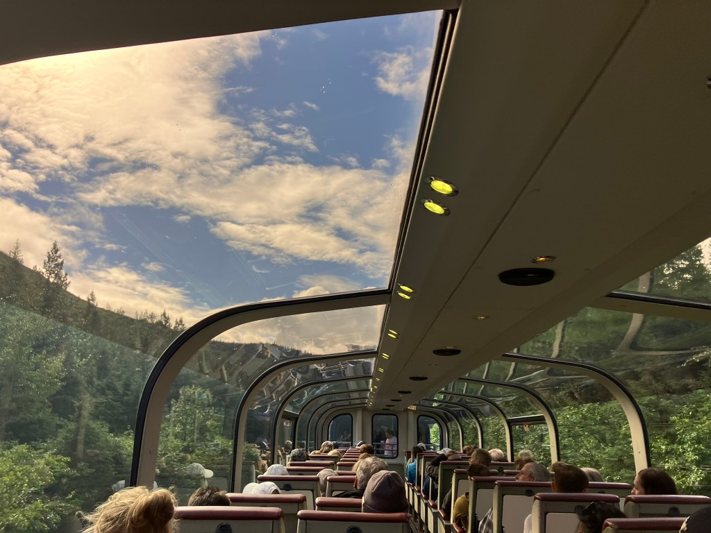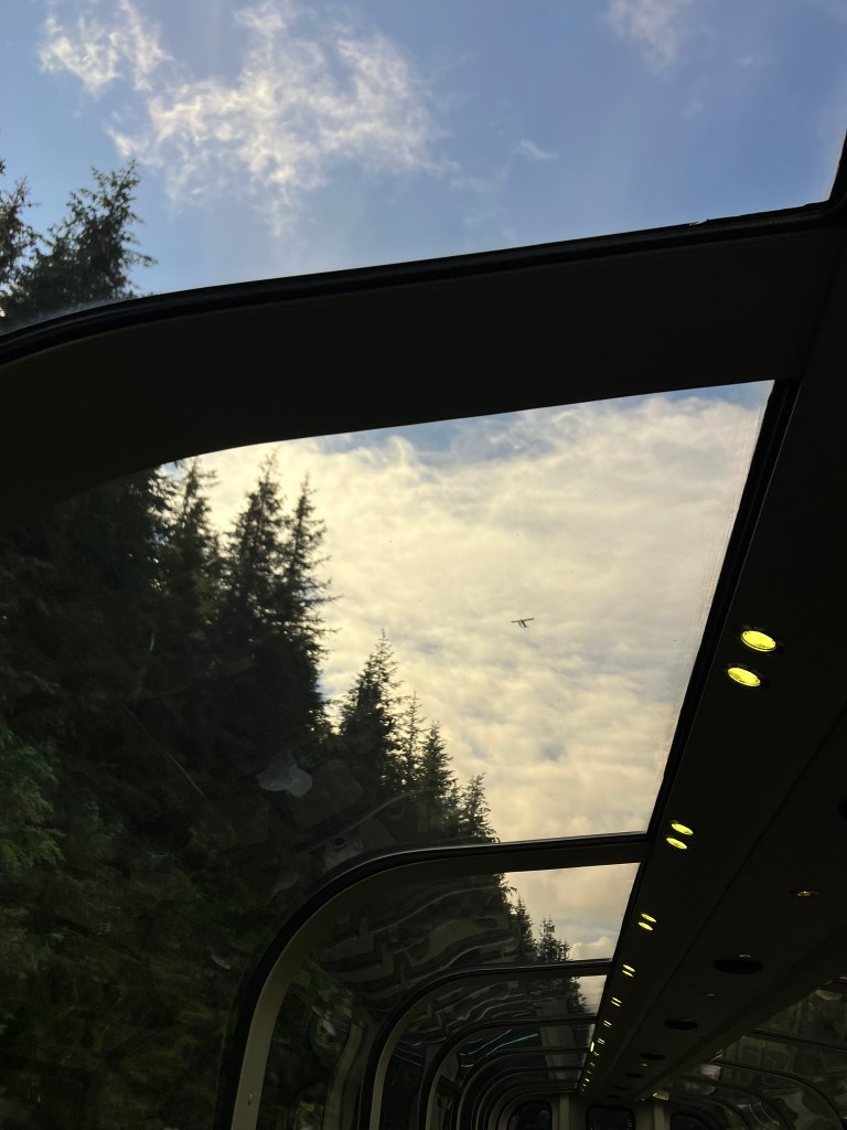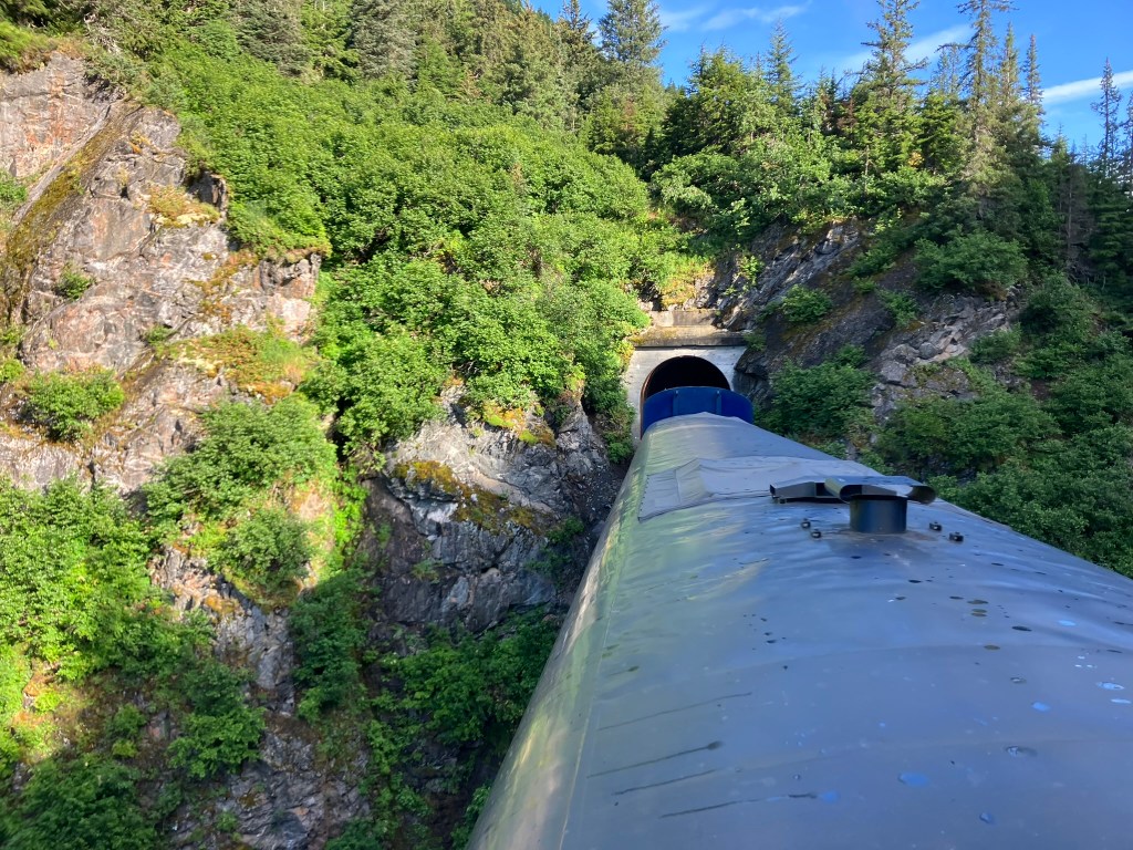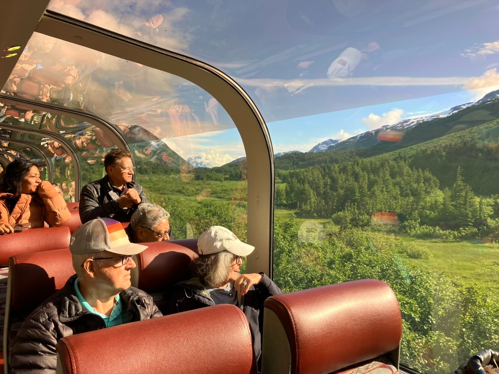 The second full day of our trip was our train adventure. We woke up before 6 and made our way to the train station. Now, all three of us are fairly well-traveled, and we’ve taken a fair number of trains in our lives. But at least Becca and I have never taken a train simply for the train ride. Instead, it’s always been primarily a form of transportation. But this train ride was the activity of the day. We’d arranged a tour that made all of our reservations for us, and the lady who’d helped me with the reservations had been able to upgrade our train rides for no extra cost. So we got the fancy treatment for this train ride. The car that we were in had glass roofs, a little outdoor viewing station, free drinks, and breakfast included. We took the nice four-hour ride, with the train employees periodically giving us history about Alaska. Our train tour guides, we learned, were high school students who had taken a class on Alaskan history and interviewed to get the job of sharing info during our ride.