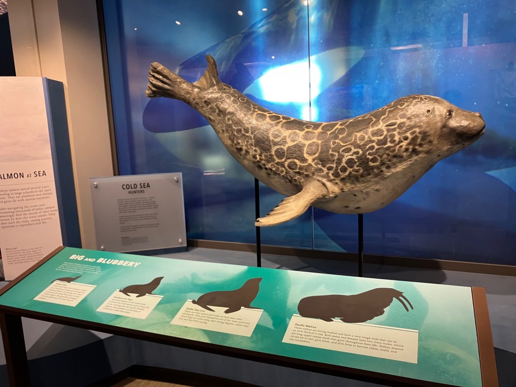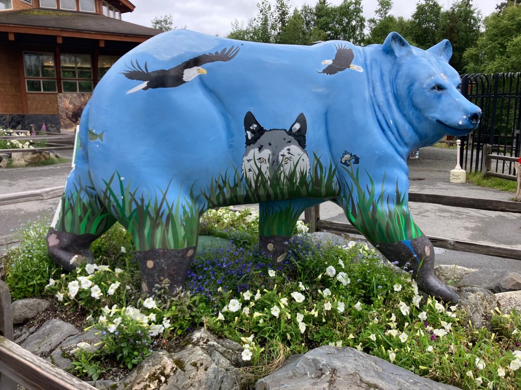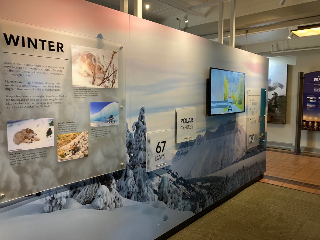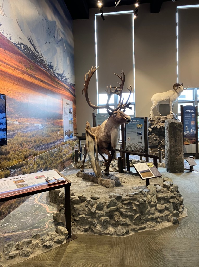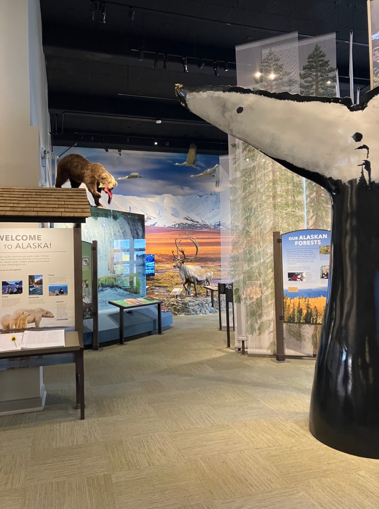 Finally, we headed back to the center of town, getting dropped off by our taxi back at the visitor’s center. Mom had a few gifts she wanted to buy, so we spent a bit of time shopping. Then, by accident, we stumbled onto the exhibits at the local Public Lands Information Center. This included information about Alaskan National Parks, history, animals, biomes, and more. We only had about half an hour to explore the center, but it was such a pleasant surprise that even half an hour was exciting and enough for us to take in a lot of new information.