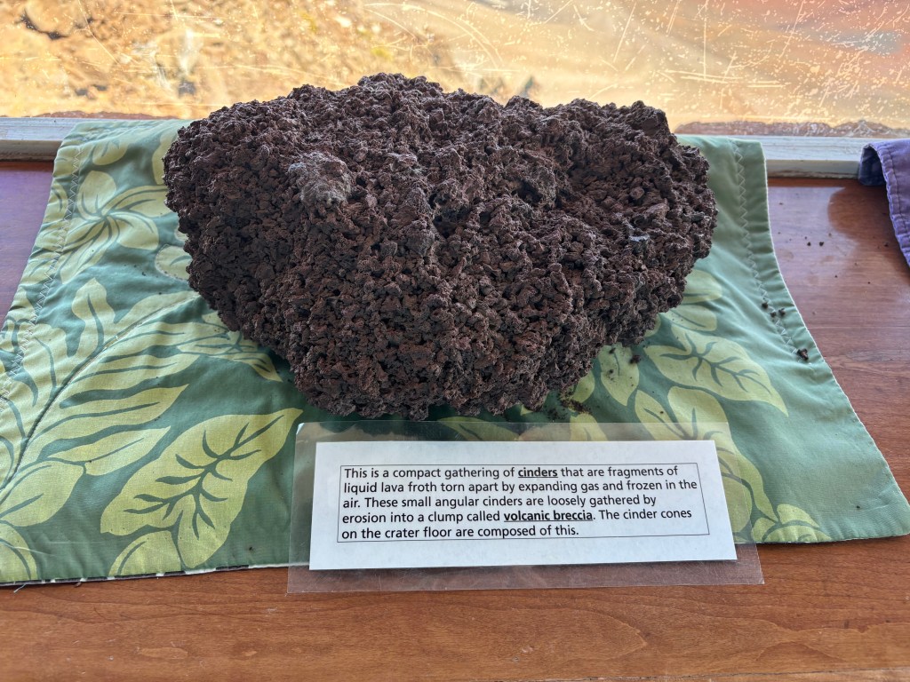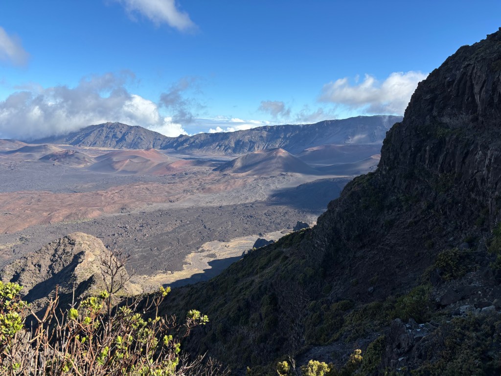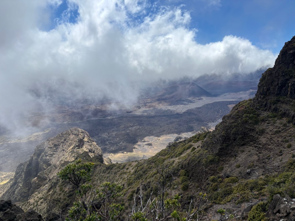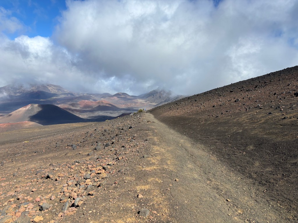 When we got high enough, we were able to look down over the caldera into the painted valleys. We stopped at various overlooks, then went on a short hike above the clouds. Then, we began our descent into the caldera. We walked for about 2.5 hours along the Sliding Sands trail down the edge of the caldera.