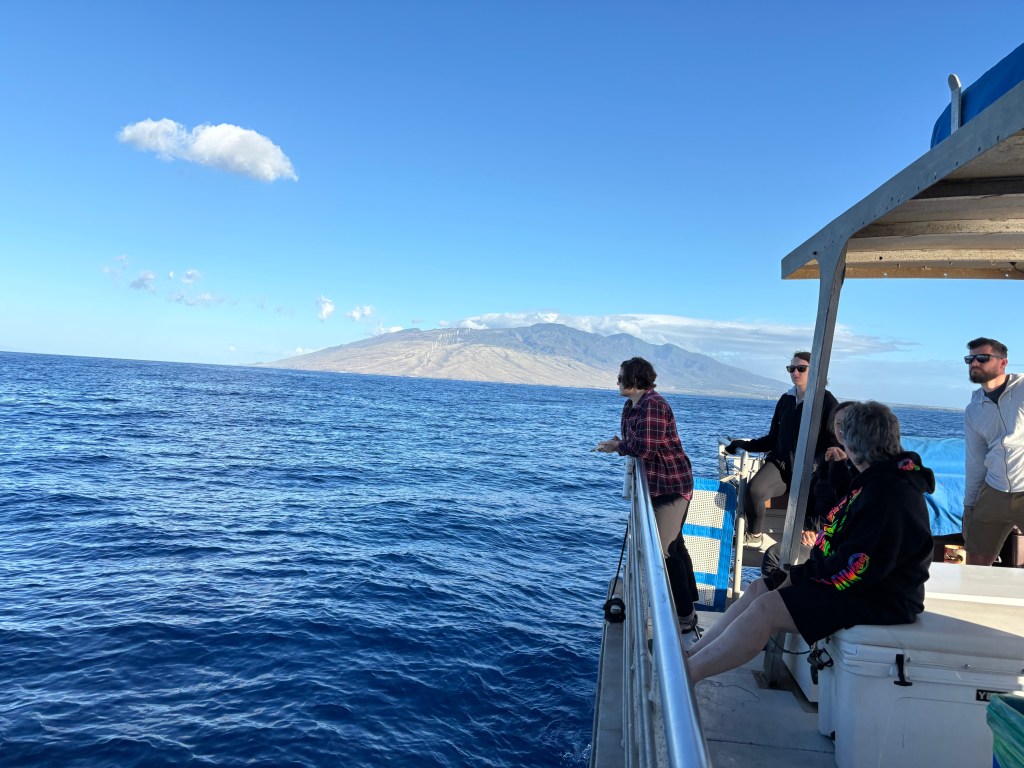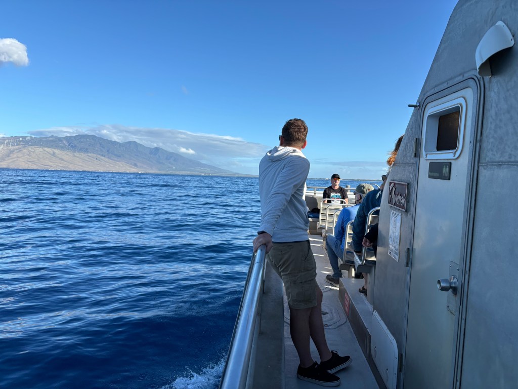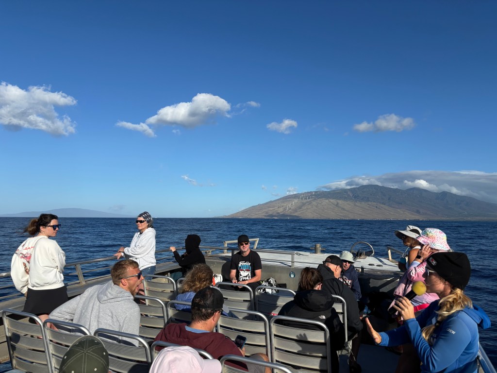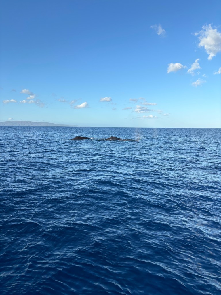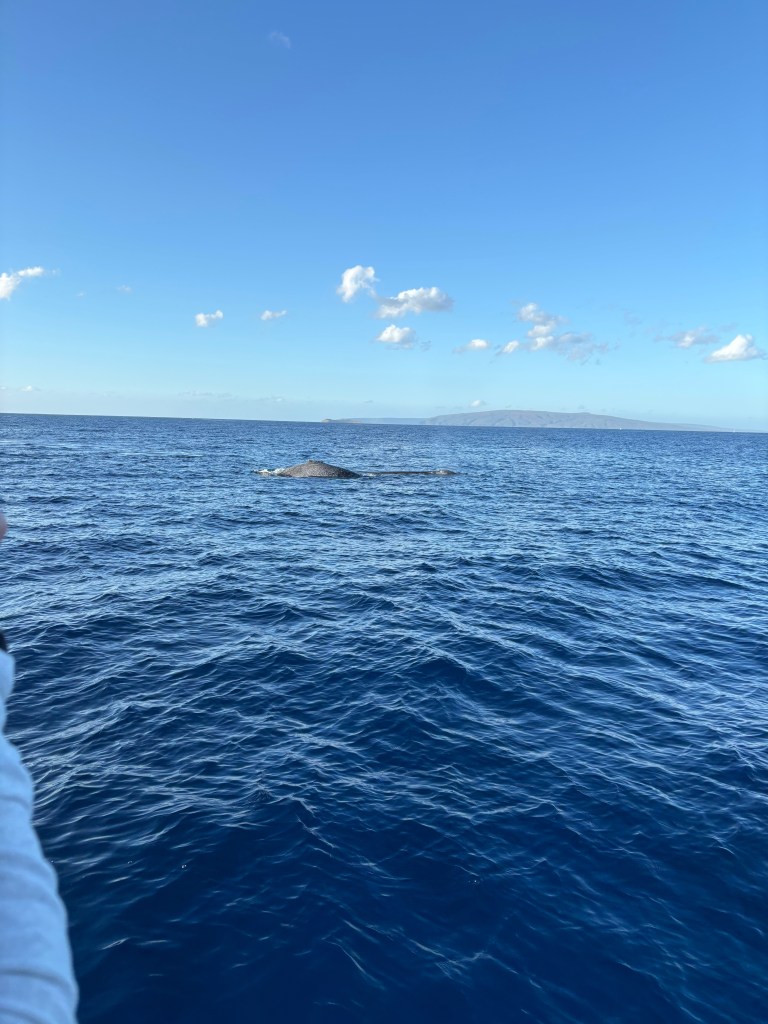 Our tour began at 7, and we spent two hours on the boat. Our guide had a master’s in conservation and was very knowledgable about whales. We enjoyed recieving information about whale migration patterns and feeding as we drove to an area where whales had been seen earlier in the morning. Our boat didn’t use any sonar because of the way the topography causes sound to bounce. Boats choose not to use sonar because if every boat used sonar, the whales would be overwhelmed by the noise within the confined space of the bays of Hawaii. Our boat drove around, looking for whales based on radio communication with other boats. Luckily, we stumbled upon a trio of young male whales and were able to follow them around for most of the ride. They said that the males didn’t usually travel together like that, but we’ve had great luck on whale watching tours recently! (Shout out to my sister’s friend Naina for suggesting this company!) At one point, the boat put down a hydrophone, or underwater microphone, so that we could listen to the whale song. It was one of the most hauntingly beautiful songs I’ve ever heard.