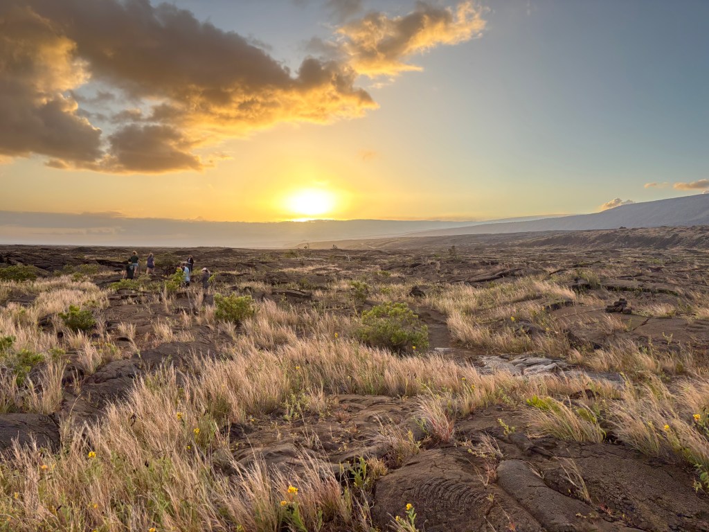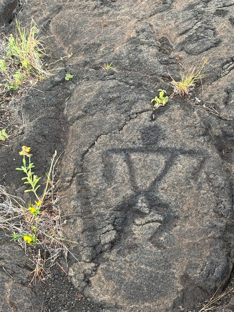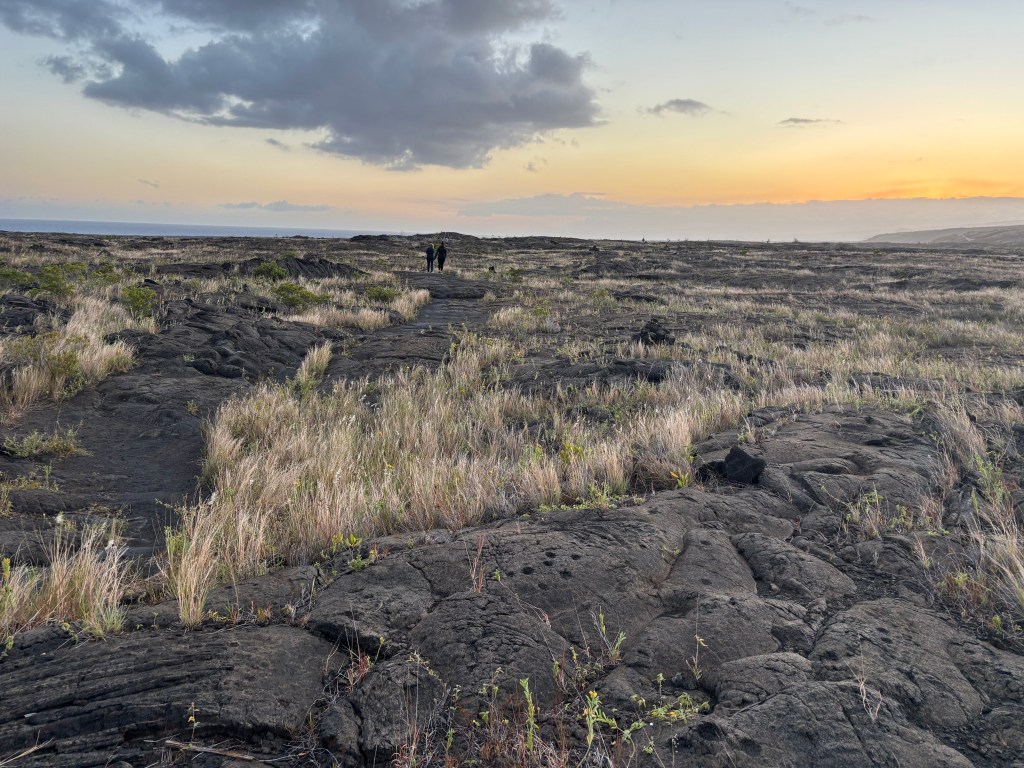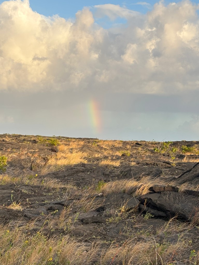 We caught the beginning of the sunset at the arch, then drove back up to the higher altitude part of the park. On our way, we stopped to take a picture of a rainbow and caught sight of a sign for petroglyphs. The light was fading, but we decided we had just enough time, so we did the hike to the Pu’uloa Petroglyphs, a sacred gallery of images carved into stone. There were over 23,000 images, carved between 1200-1450 AD. It is the largest collection in Hawaii. Once we’d spent a comfortable amount of time viewing the images, we turned back, racing against the sunset and oncoming rainclouds to get back to our car safely.