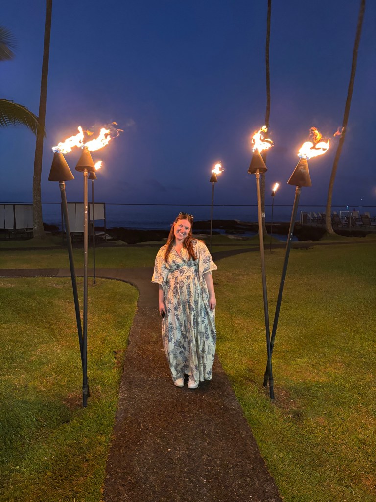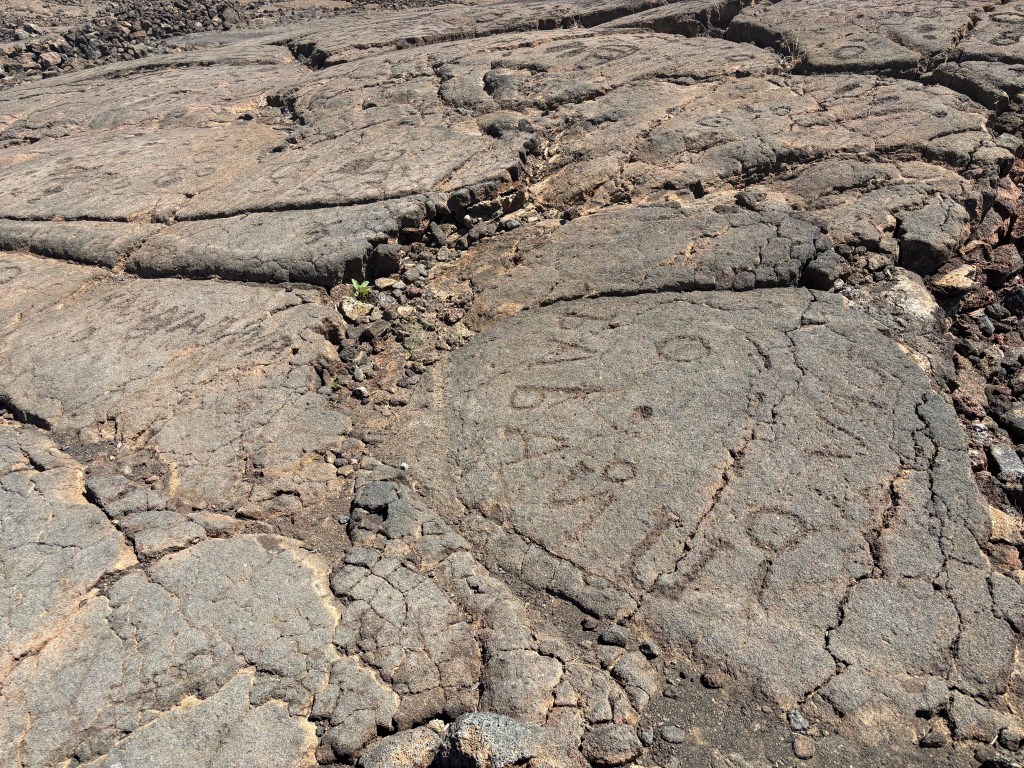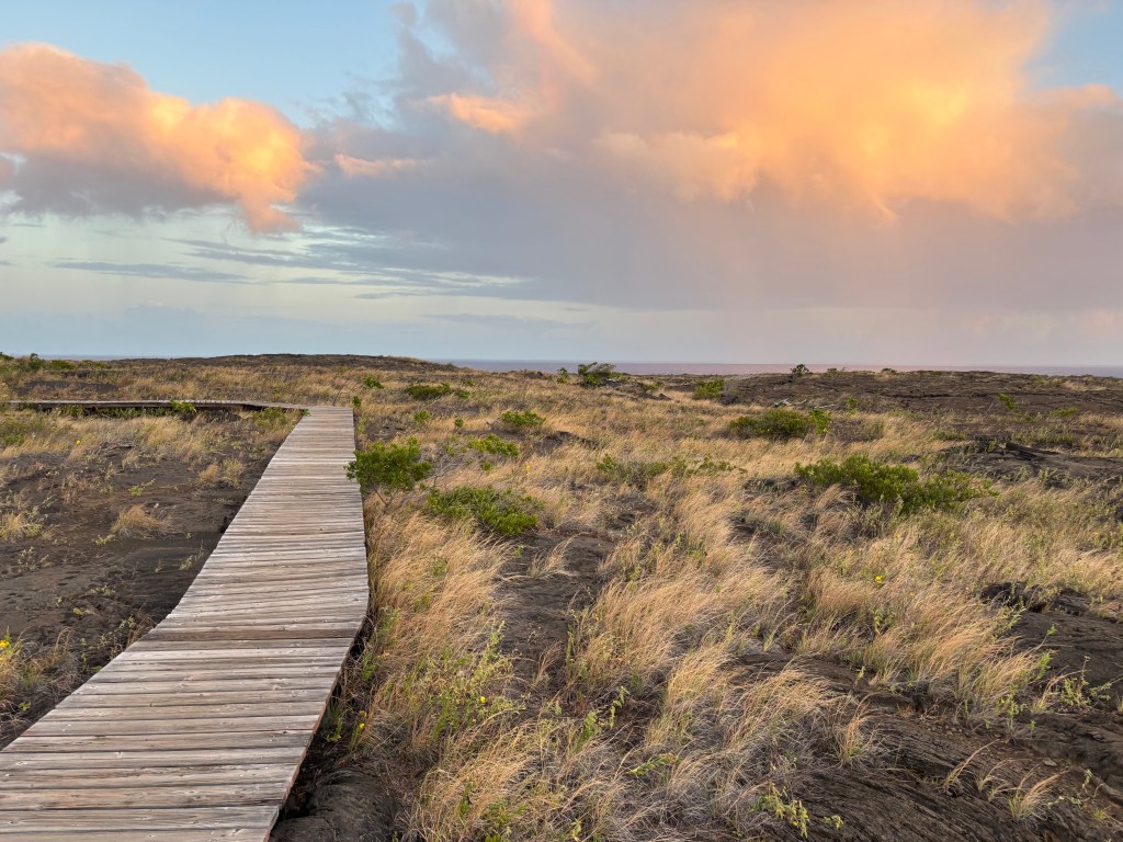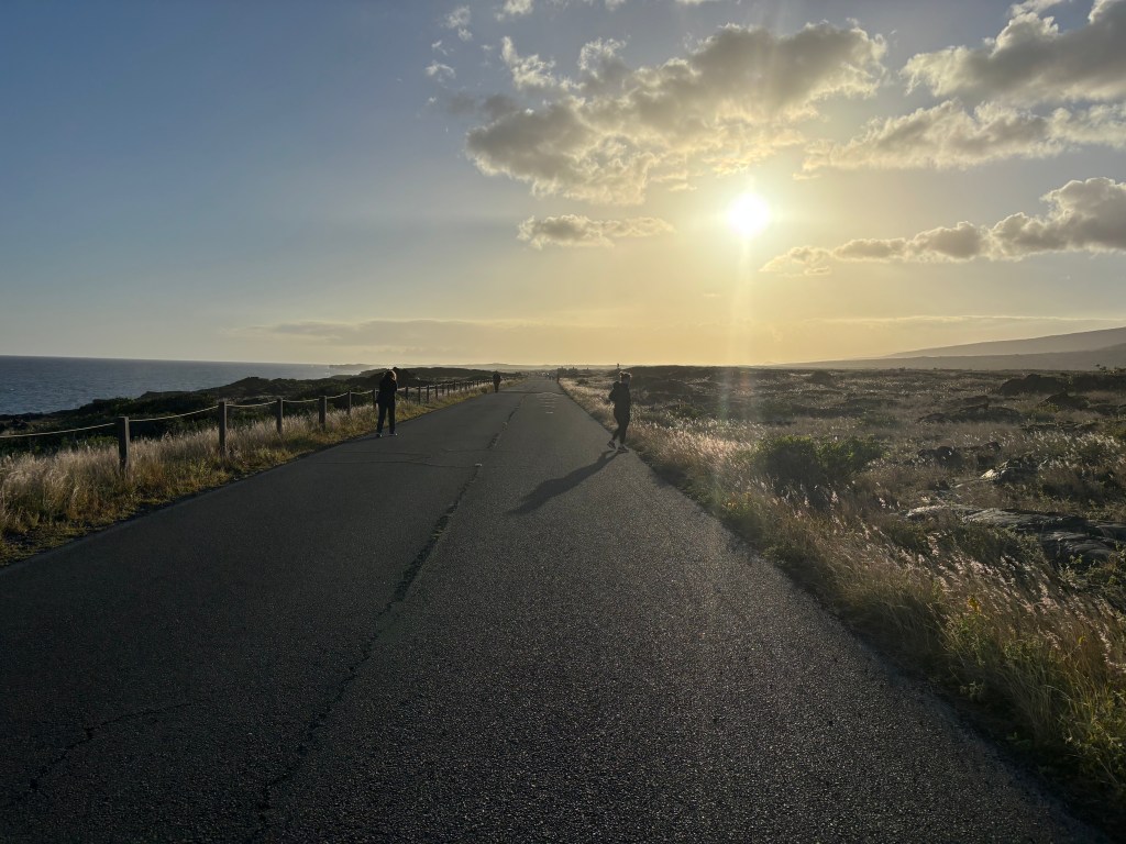 We caught the beginning of the sunset at the arch, then drove back up to the higher altitude part of the park. On our way, we stopped to take a picture of a rainbow and caught sight of a sign for petroglyphs. The light was fading, but we decided we had just enough time, so we did the hike to the Pu’uloa Petroglyphs, a sacred gallery of images carved into stone. There were over 23,000 images, carved between 1200-1450 AD. It is the largest collection in Hawaii. Once we’d spent a comfortable amount of time viewing the images, we turned back, racing against the sunset and oncoming rainclouds to get back to our car safely.