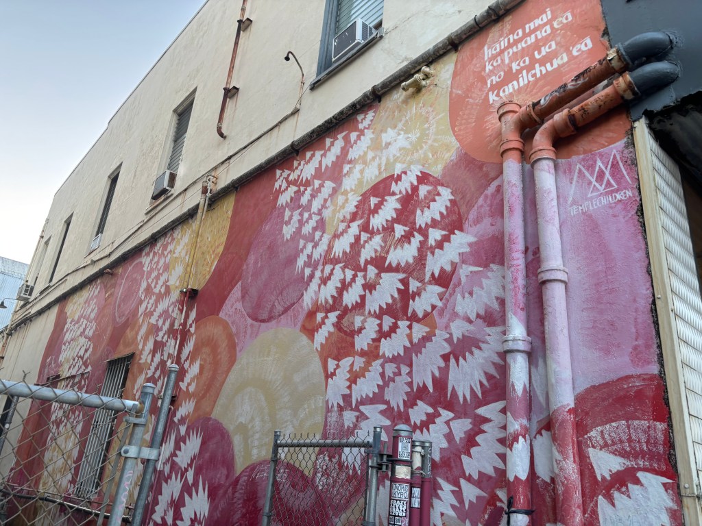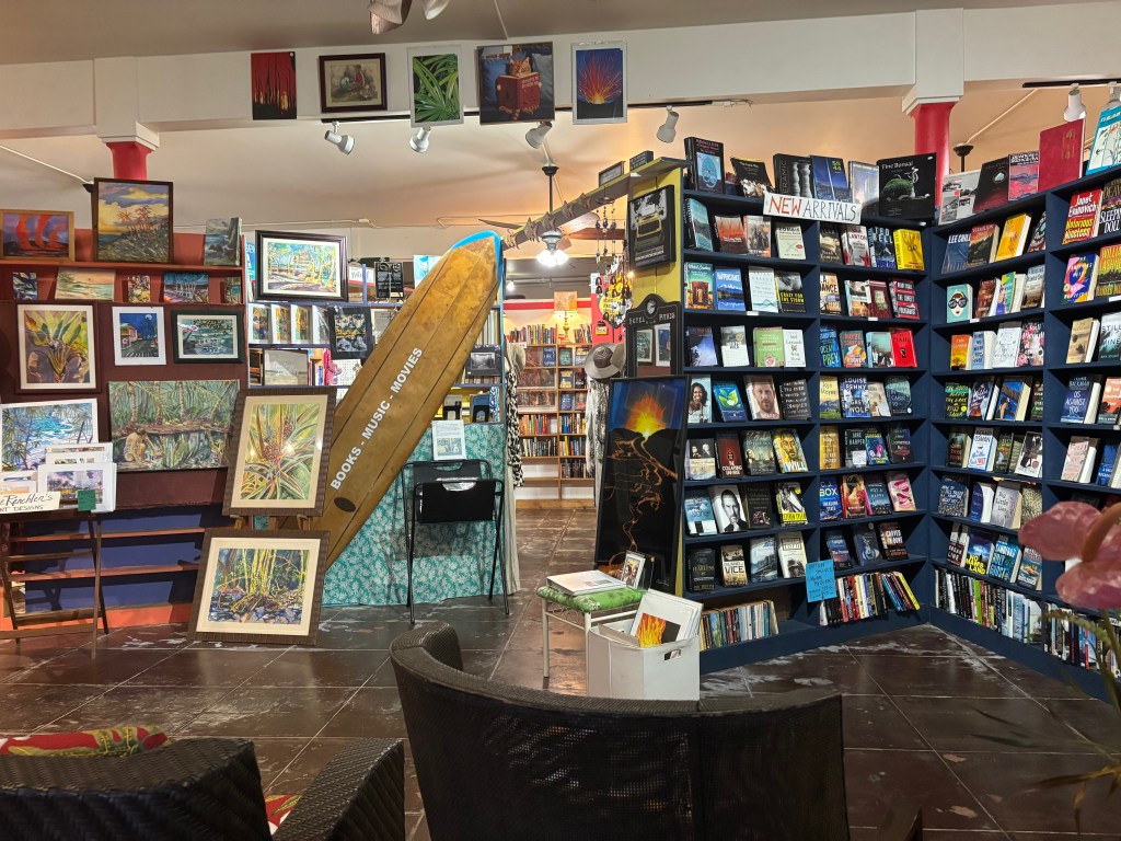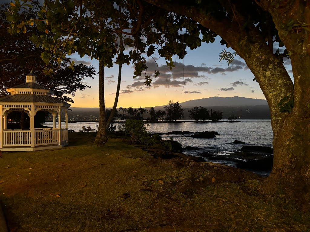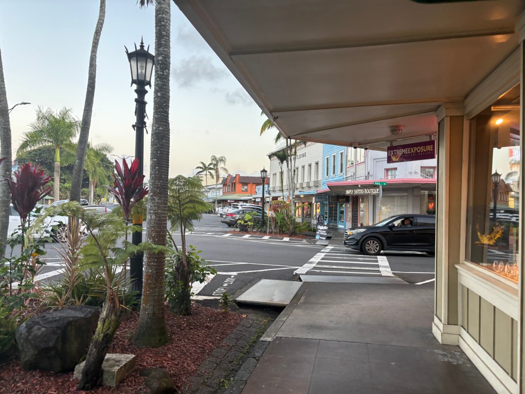 After the garden, our search for a beach resumed. Google Maps sent us to a river inlet that was listed as a beach, but although we found another small waterfall, we didn’t go swimming at that beach. Finally, we started back toward our hotel. We stumbled onto a beach that we’d gotten a glimpse of on our way out for the day. It was a beautiful black sand beach, but by this point in the evening, it had gotten cold enough that all we wanted to do was put our toes in. Plus, it was primarily a surfer beach, and we didn’t want to get in the way of the after-work surfing crowd. So after a short time with our feet in the sand, we headed over to the town of Hilo. We wandered through a market, along the beach, and into a few art stores before sitting down to dinner.