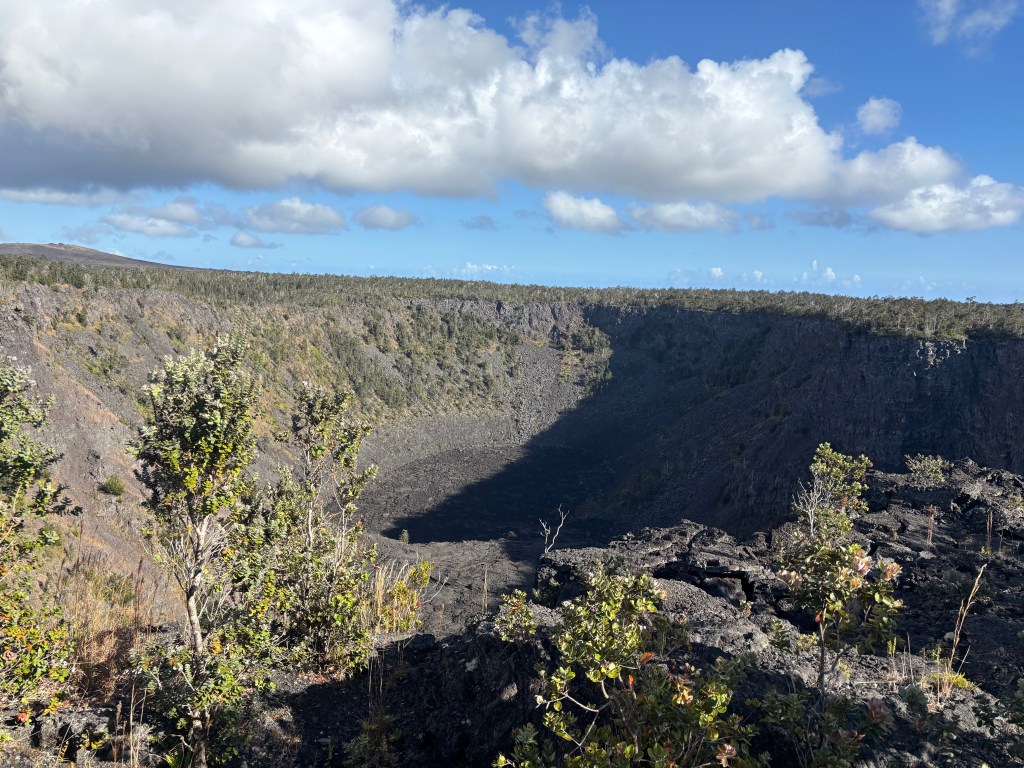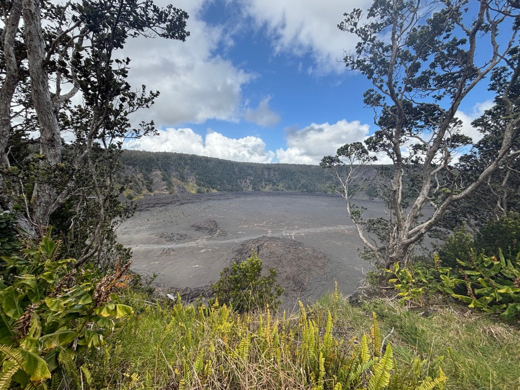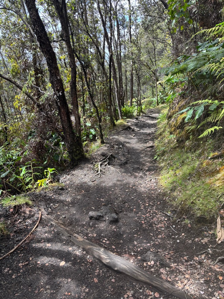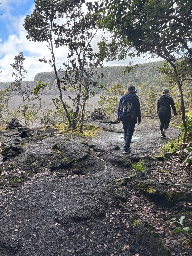 When we were done with the lava tube, we headed down the opposite direction, onto the Kilauea Iki Crater trail. I didn’t realize when we began the hike that it would bring us down into the caldera and onto the remains of an old lava flow from 1959. I thought we’d just be walking along the crater rim, and honestly, it was one of the coolest moments I’d ever experienced. I got some inkling as we continued to descend further and further, but it wasn’t until we came around the final corner that I realized we’d be able to actually walk along the floor of the volcano, on the dried lava of an old eruption.