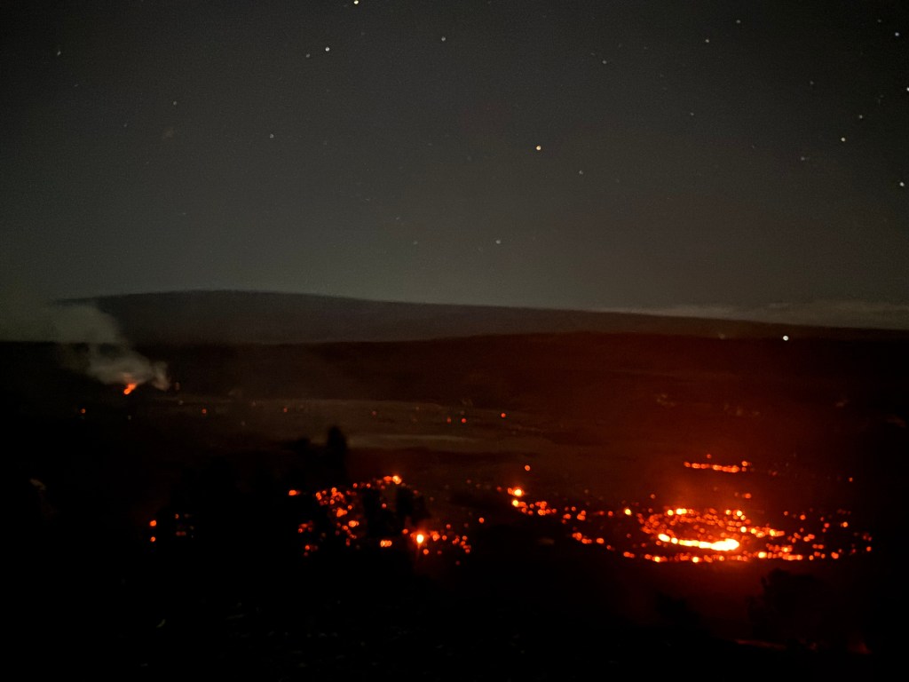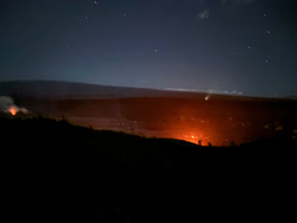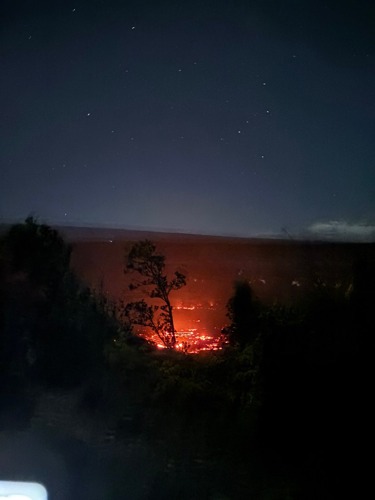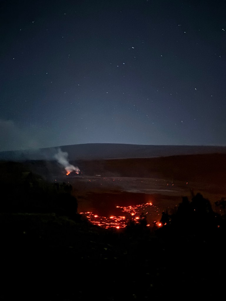 By the time we got back to our car, it was almost 7. The darkness came on quickly as we were driving back to the main part of the park, and by the time we came back upon the overlook, it was fully dark and the stars were out. On a whim, and because we saw a few cars still around, we decided that we should re-walk the path to the overlook now that it was dark. It was a fantastic choice. In addition to being able to see some really good stars, the darkness revealed the presence of lava beneath the crust we’d seen from the overlook earlier in the day. We watched it bubble and flow beneath the surface for a while, amazed that while we’d missed out on the eruption, a random last-minute decision and some good timing had allowed us to still see some hints of it beneath the surface.