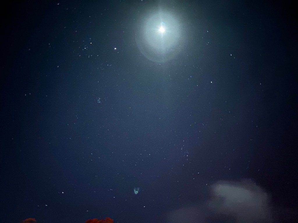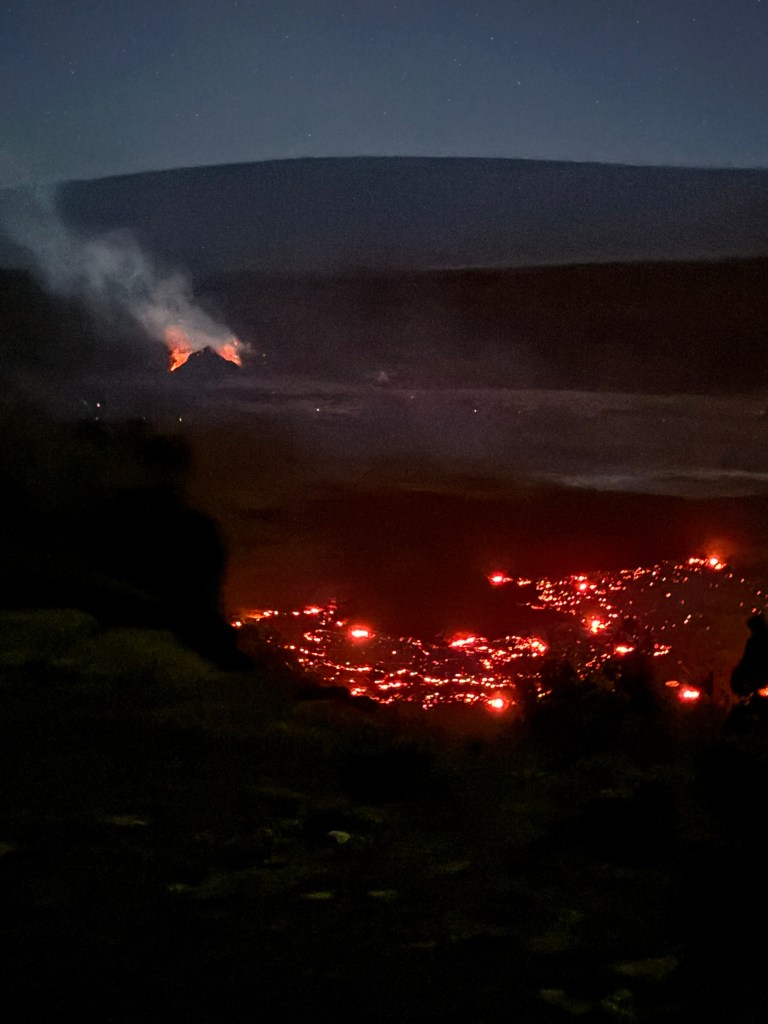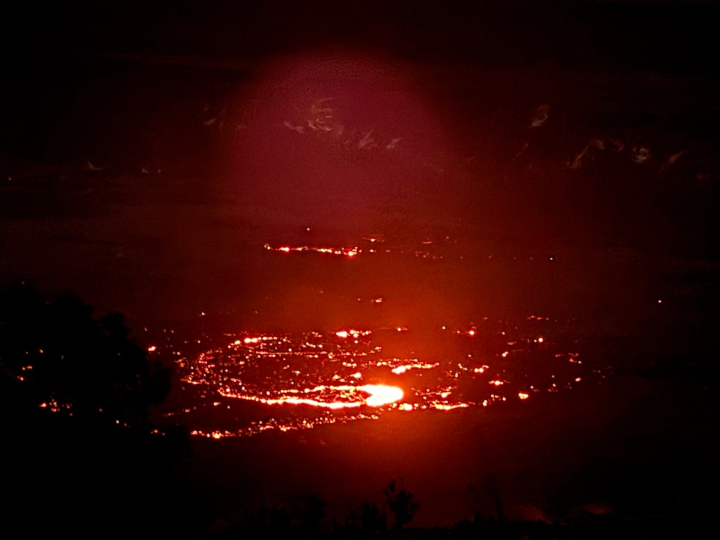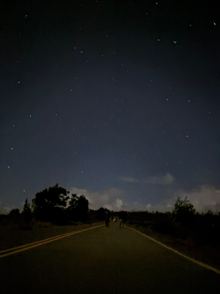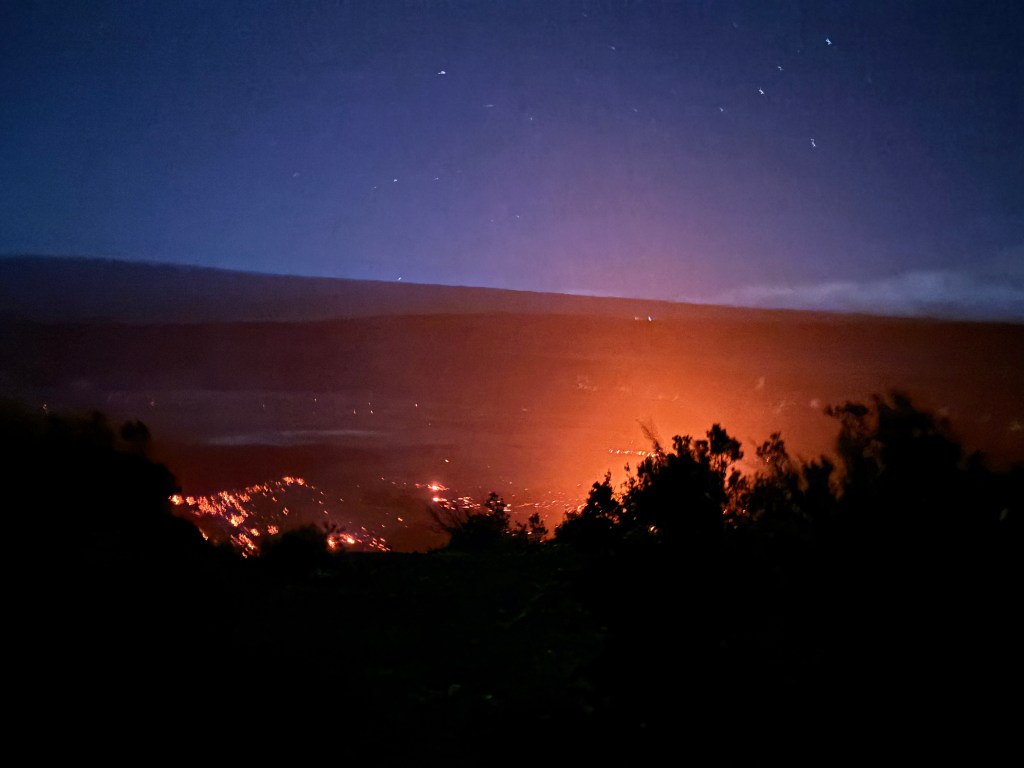 By the time we got back to our car, it was almost 7. The darkness came on quickly as we were driving back to the main part of the park, and by the time we came back upon the overlook, it was fully dark and the stars were out. On a whim, and because we saw a few cars still around, we decided that we should re-walk the path to the overlook now that it was dark. It was a fantastic choice. In addition to being able to see some really good stars, the darkness revealed the presence of lava beneath the crust we’d seen from the overlook earlier in the day. We watched it bubble and flow beneath the surface for a while, amazed that while we’d missed out on the eruption, a random last-minute decision and some good timing had allowed us to still see some hints of it beneath the surface.