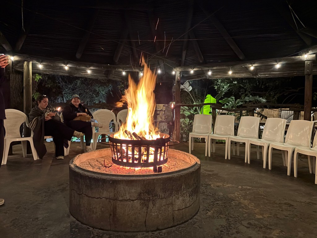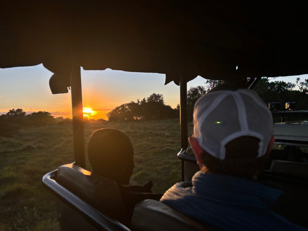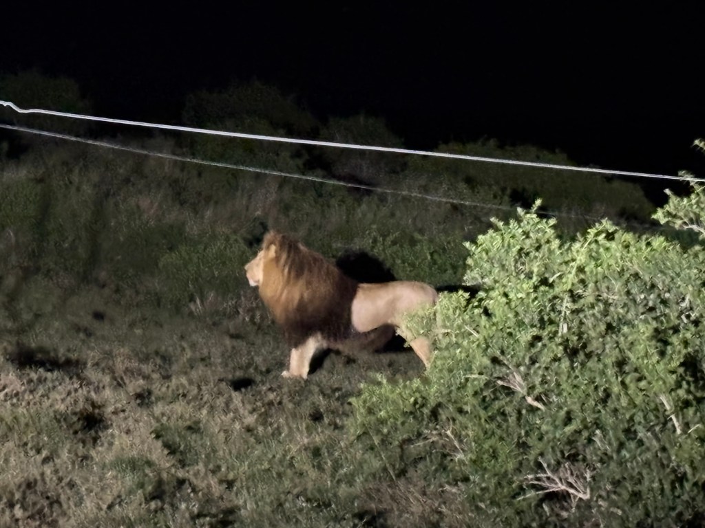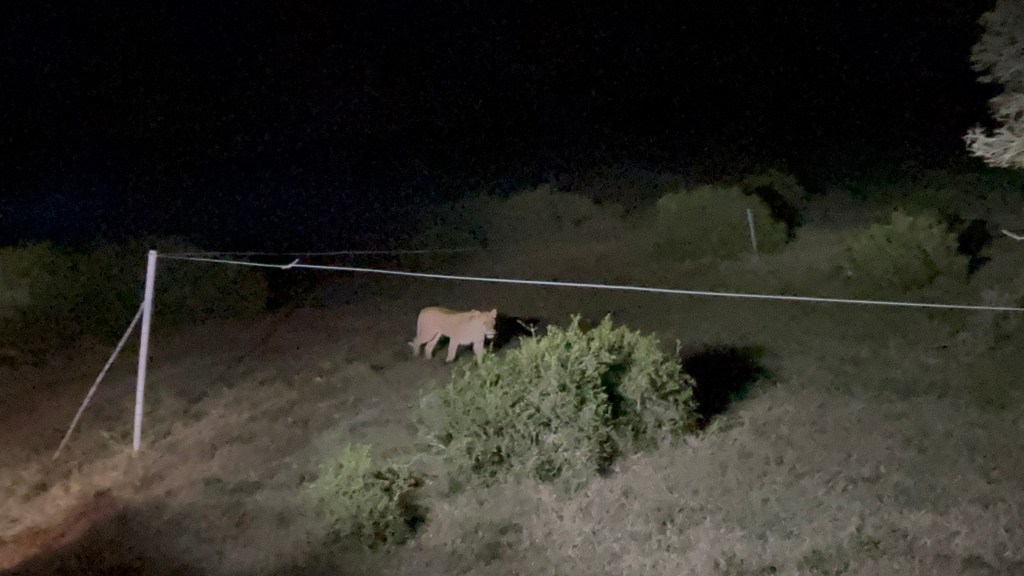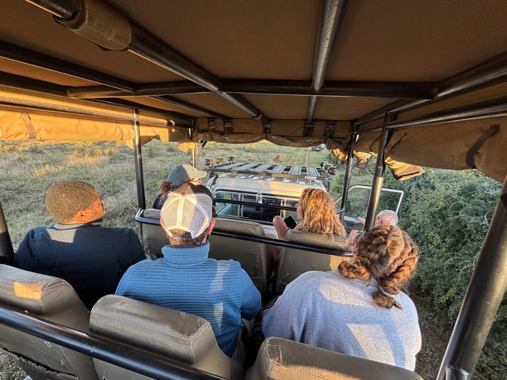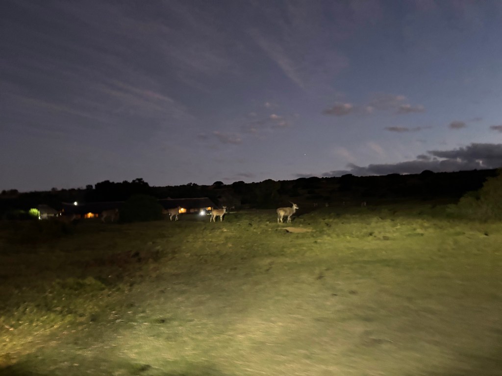 After seeing the lions, we drove around a bit more as the sun set. Once it started to get dark, we headed off to dinner on the reserve, a delicious meal of stew, chicken, potatoes, rice, vegetables, bread, and dessert. After our meal, we started the night drive back to the front gate, holding lights up to search for flashes of eyes in the darkness. We saw herds of antelopes and zebras, and we eventually came upon the lions again. They were stalking a herd of antelope, on the prowl for one of the injured ones we’d seen earlier. We waited and watched them for a while, but ultimately our presence disturbed their hunt just enough that the antelope they were after ended up getting away. After that really unique experience, we were exhausted and ready for the end of our night.