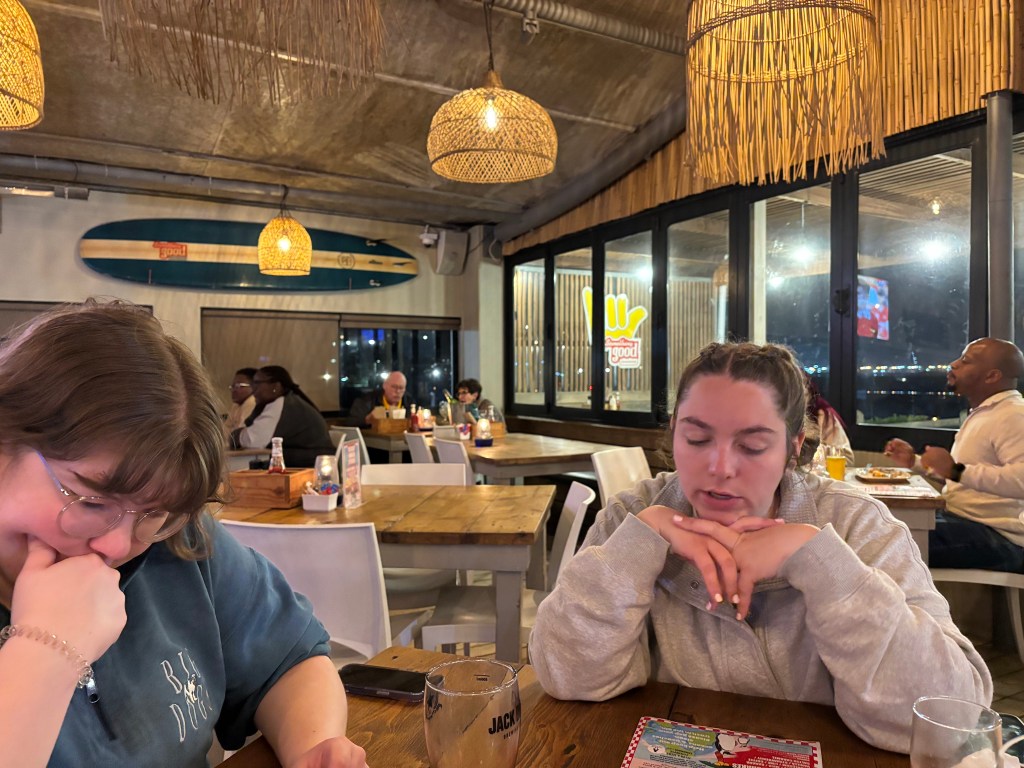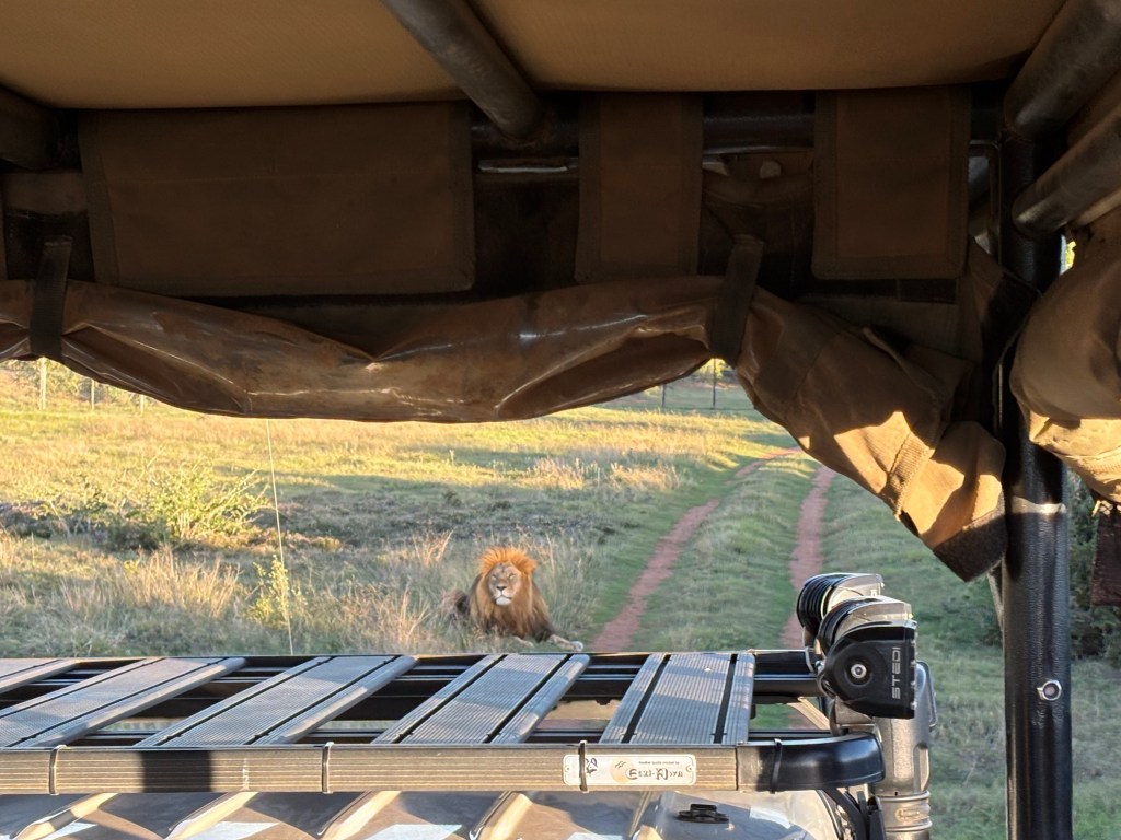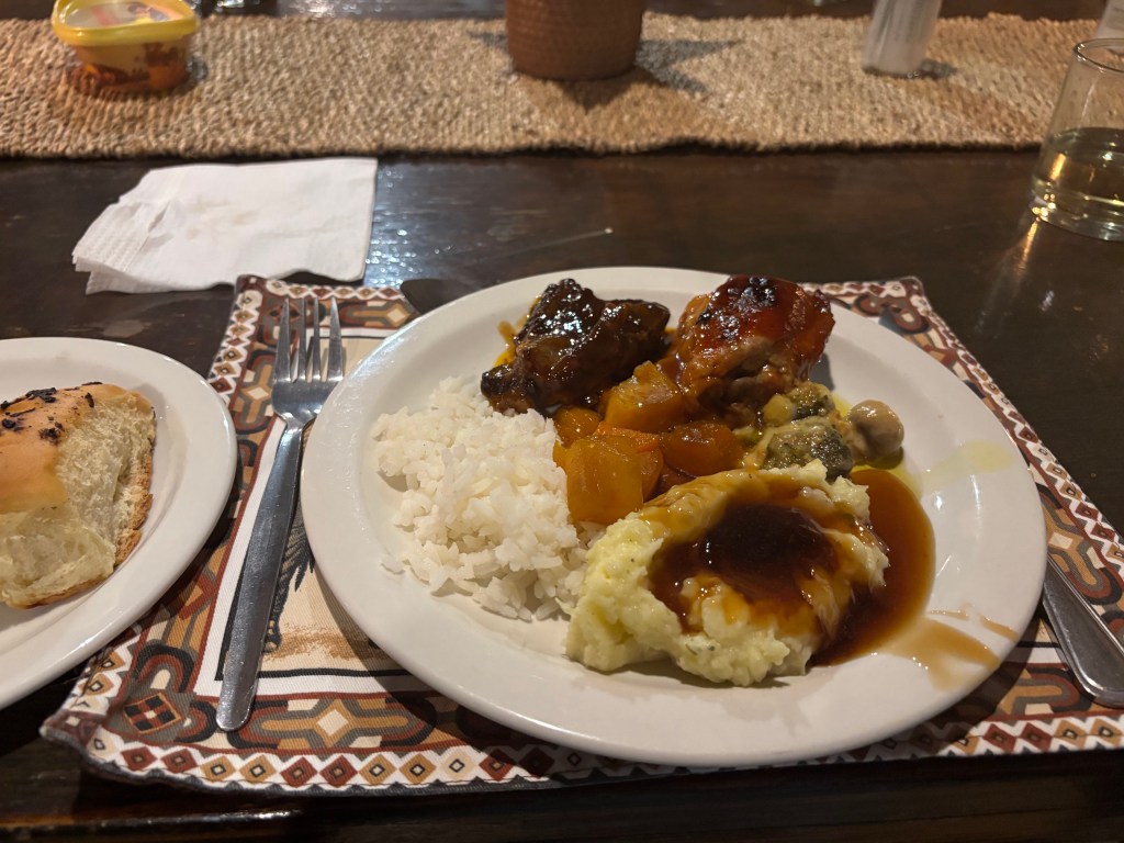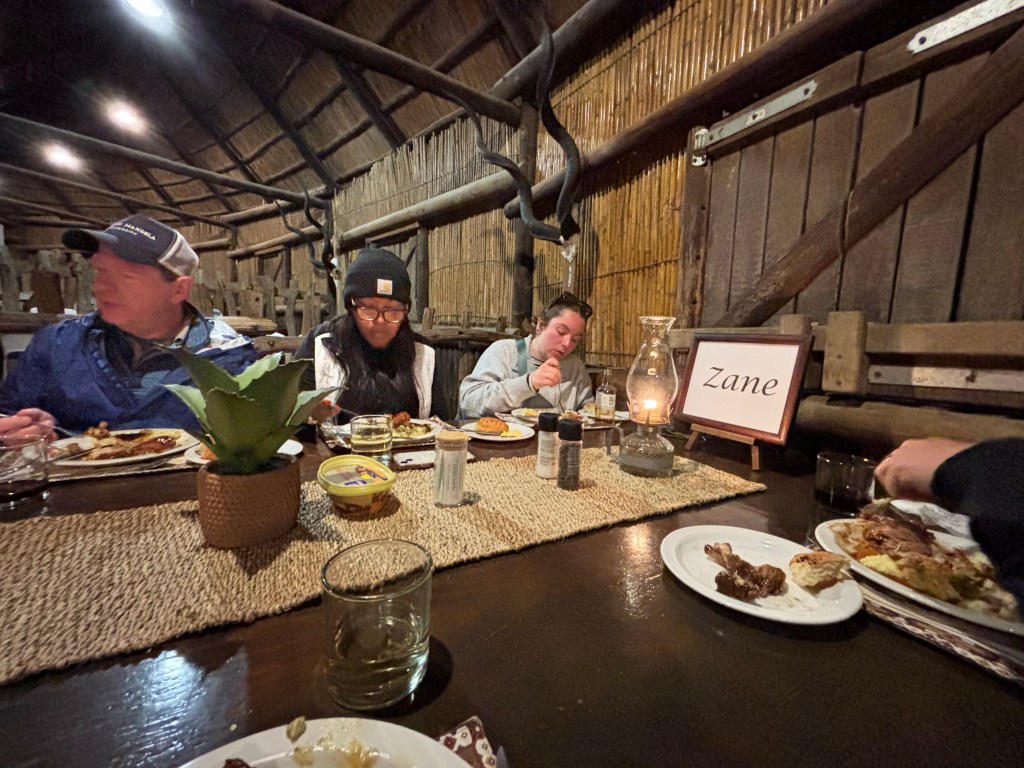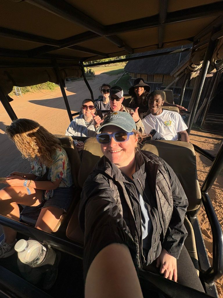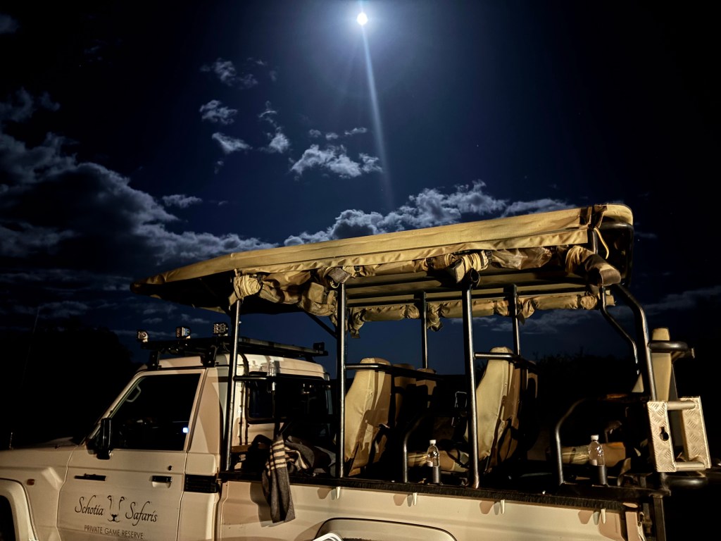 After seeing the lions, we drove around a bit more as the sun set. Once it started to get dark, we headed off to dinner on the reserve, a delicious meal of stew, chicken, potatoes, rice, vegetables, bread, and dessert. After our meal, we started the night drive back to the front gate, holding lights up to search for flashes of eyes in the darkness. We saw herds of antelopes and zebras, and we eventually came upon the lions again. They were stalking a herd of antelope, on the prowl for one of the injured ones we’d seen earlier. We waited and watched them for a while, but ultimately our presence disturbed their hunt just enough that the antelope they were after ended up getting away. After that really unique experience, we were exhausted and ready for the end of our night.