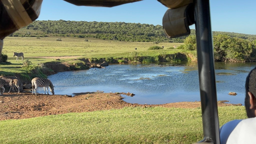We took our own van through Addo, driving along various roads and stopping at watering holes to see not only elephants, but also zebras (pronounced “zeb-rah” in South Africa, as opposed to “zee-brah”), warthogs, antelopes, a dung beetle, and various birds. We spent the morning driving around, seeing approximately 70-100 elephants, including babies. We stopped at the gift shop, where we also ended up grabbing a quick lunch and stopping at a viewing center before heading off to the second adventure of the day.