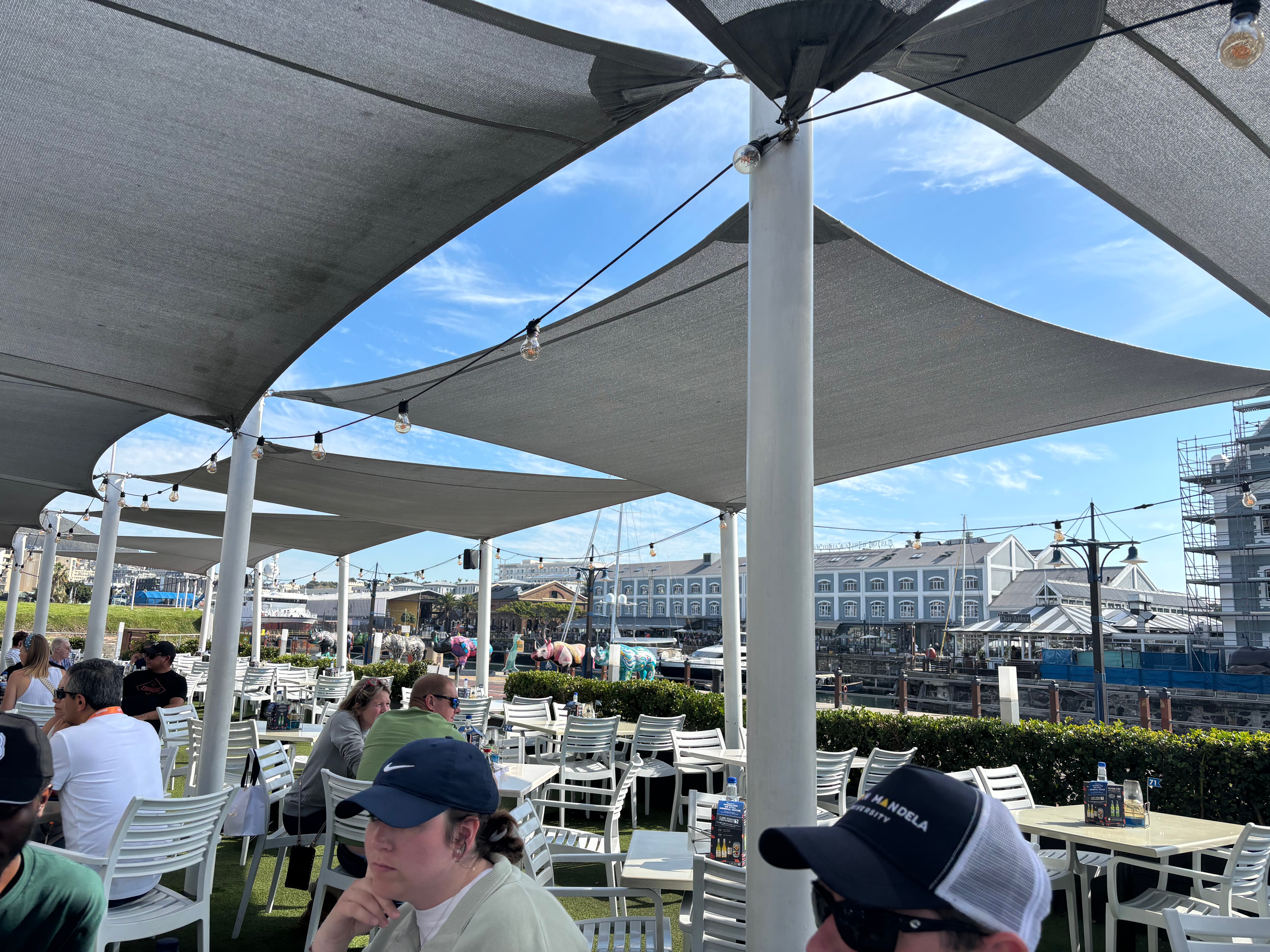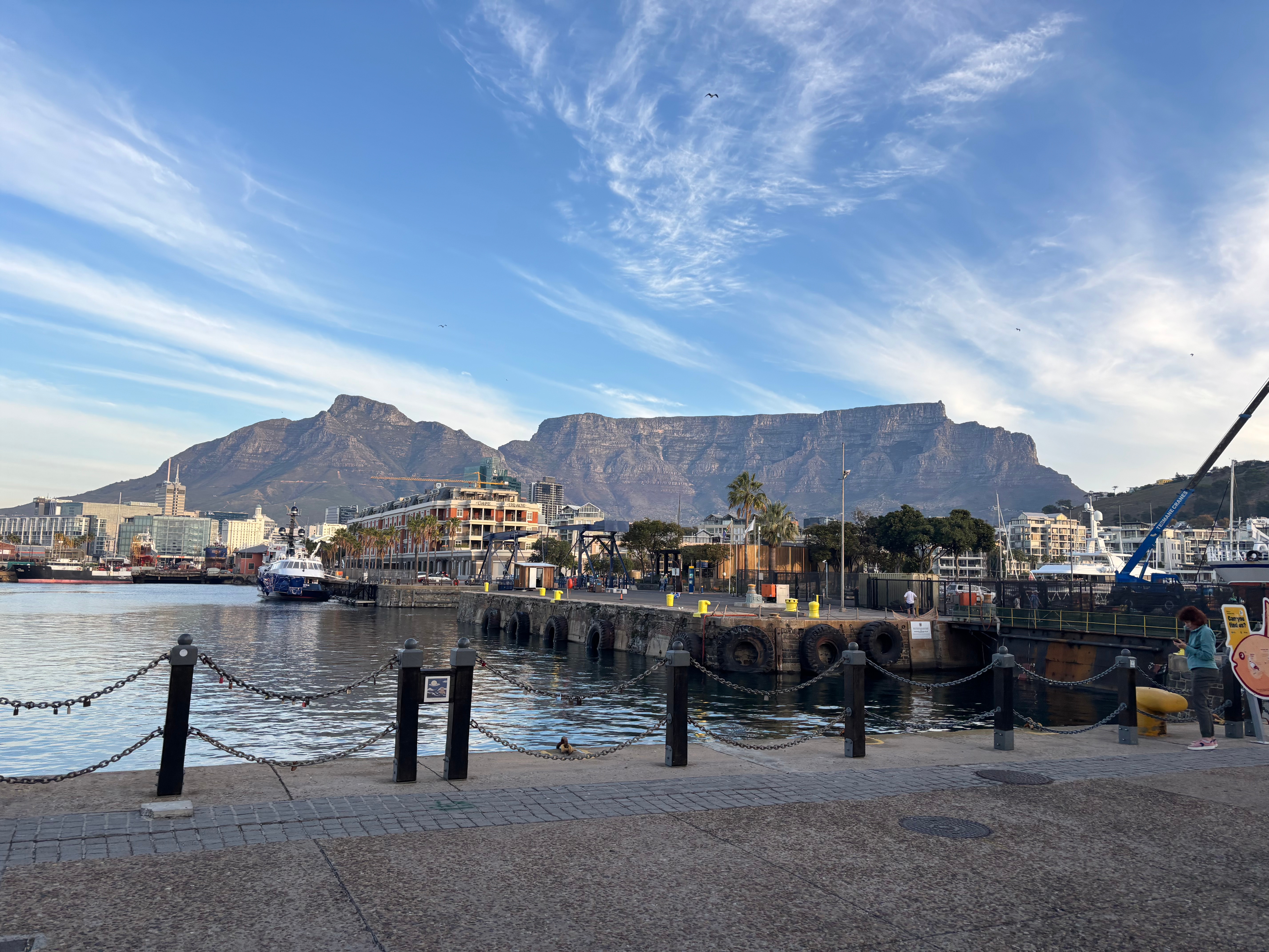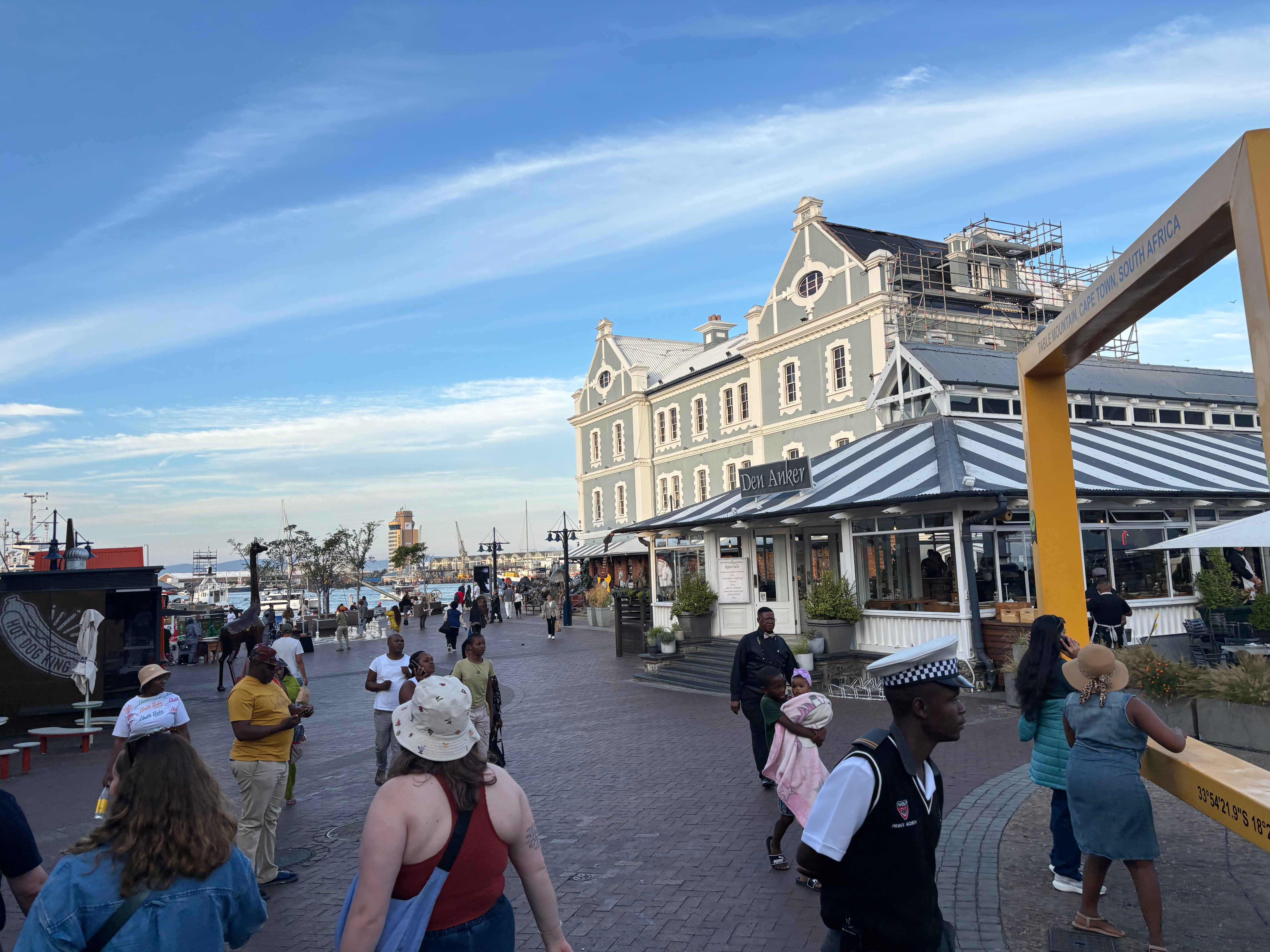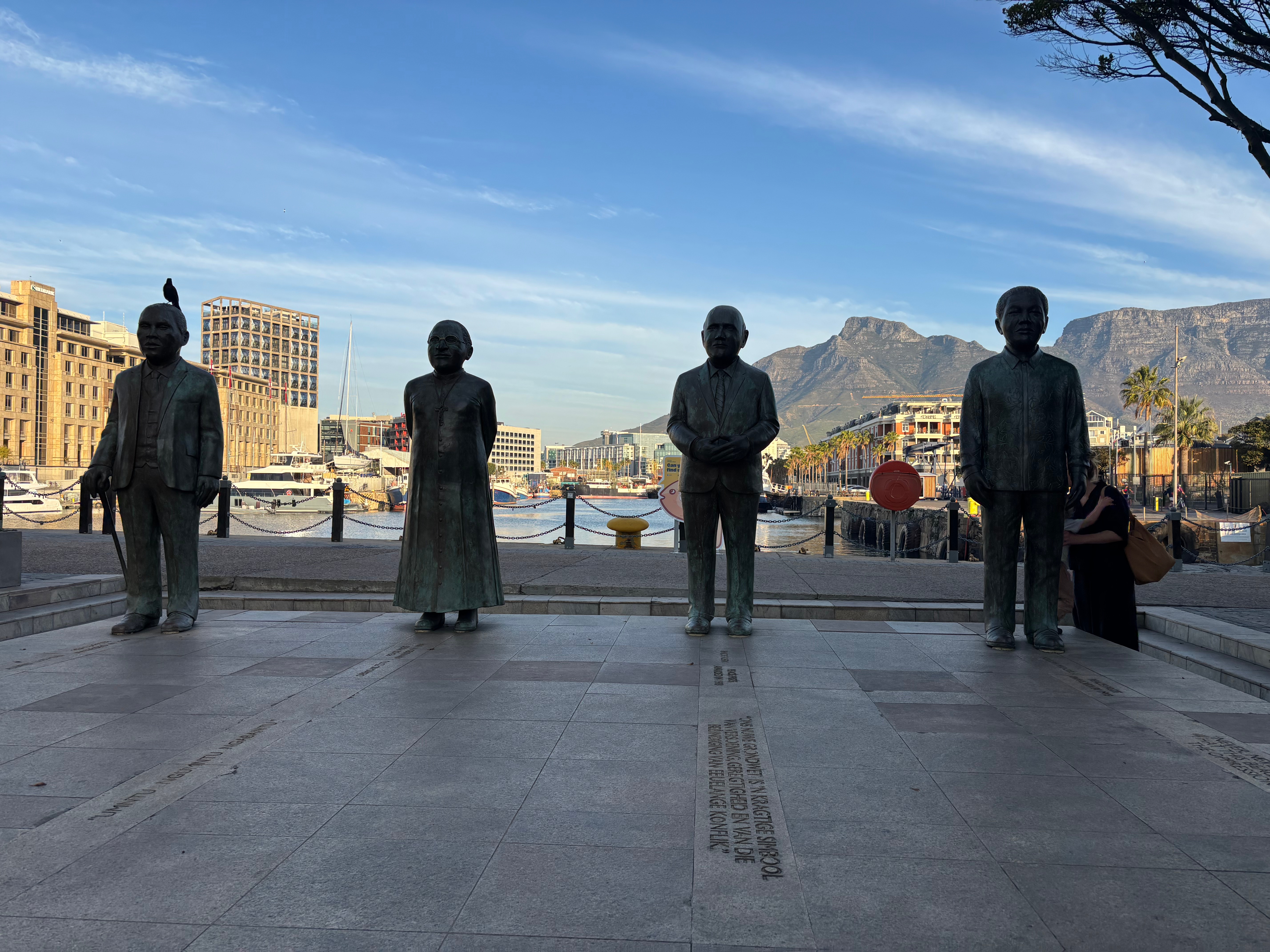 We arrived in the city itself and stopped off at our hotel, the Protea Hotel Breakwater Lodge. The hotel was an old jail on the Cape Town waterfront, and staying there was a very cool experience. I again roomed with Laurel and Taylor, but this time I got my own bedroom with a shared bathroom. We dropped off our stuff and then went to grab dinner. We ended up at a Time Out Market on the waterfront. Time Out is a brand you can find here in Chicago, with a variety of local food stalls. Nearby, there was a statue of Nobel Peace Prize laureates, and the streets were teeming with street performers. We had a fantastic view of Table Mountain as we wandered the waterfront, and we just spent the afternoon taking in the liveliness of the area. We ended up randomly running into some alumni of the program who were taking their own college students to Cape Town for a study abroad experience.