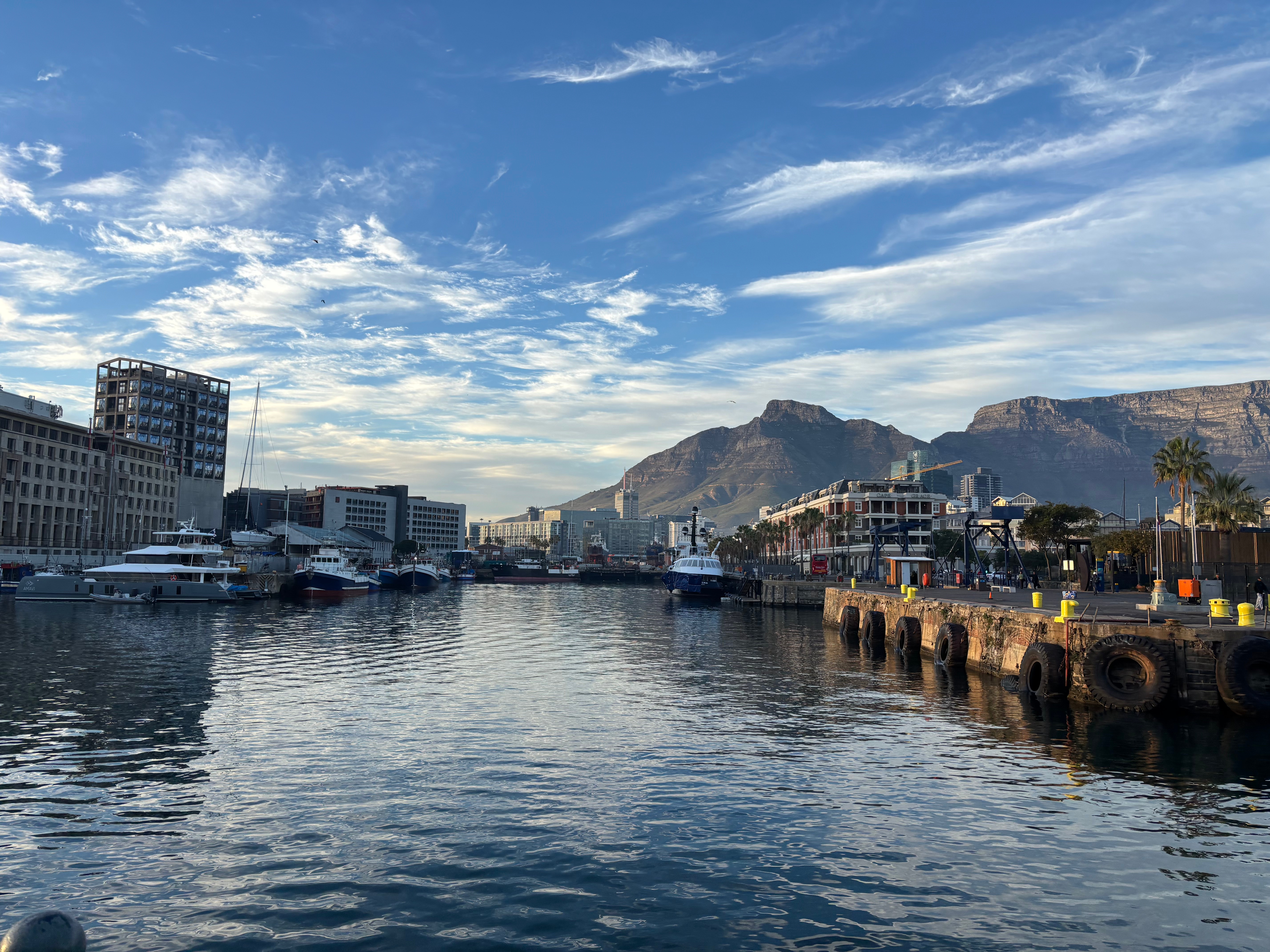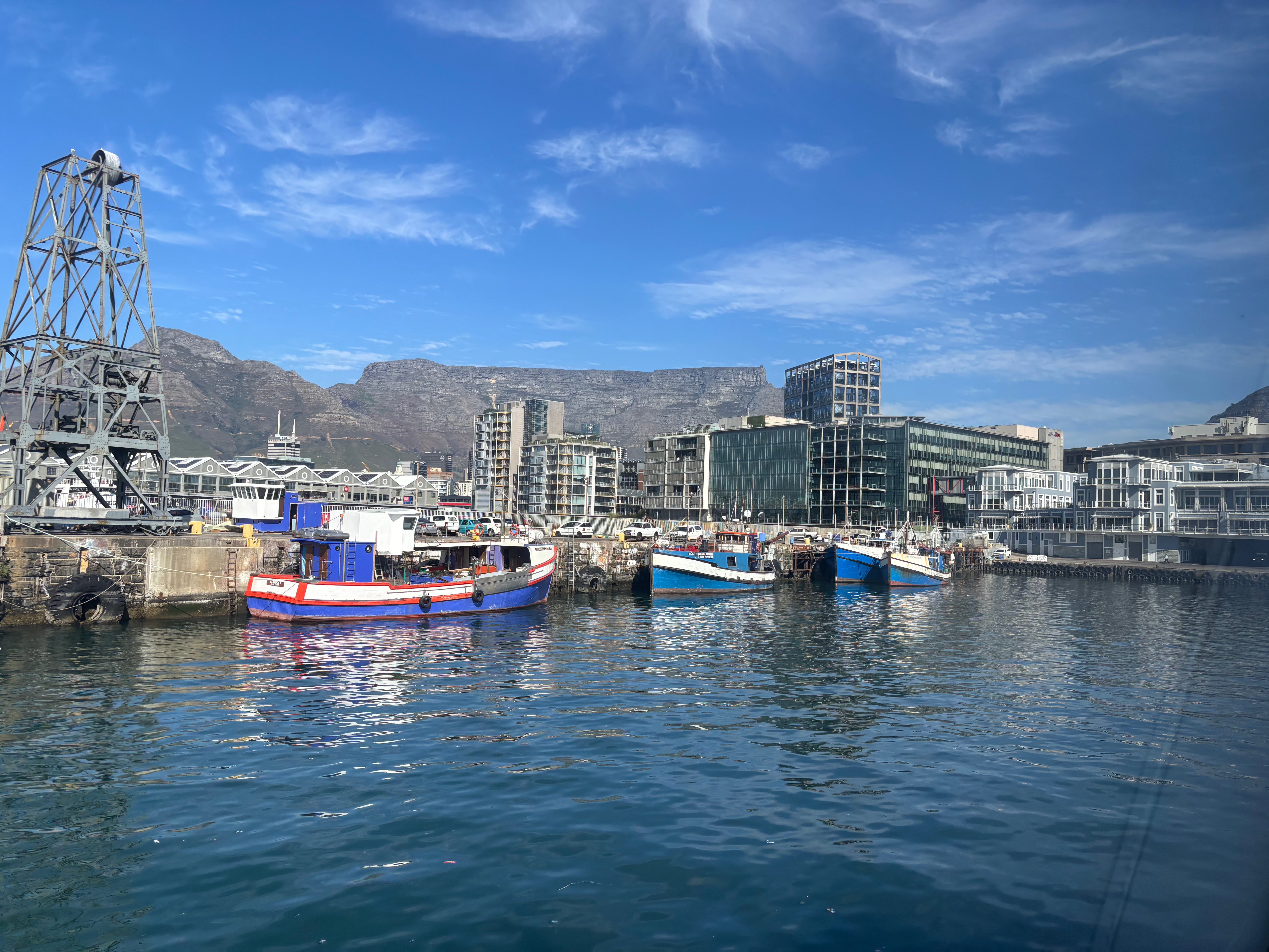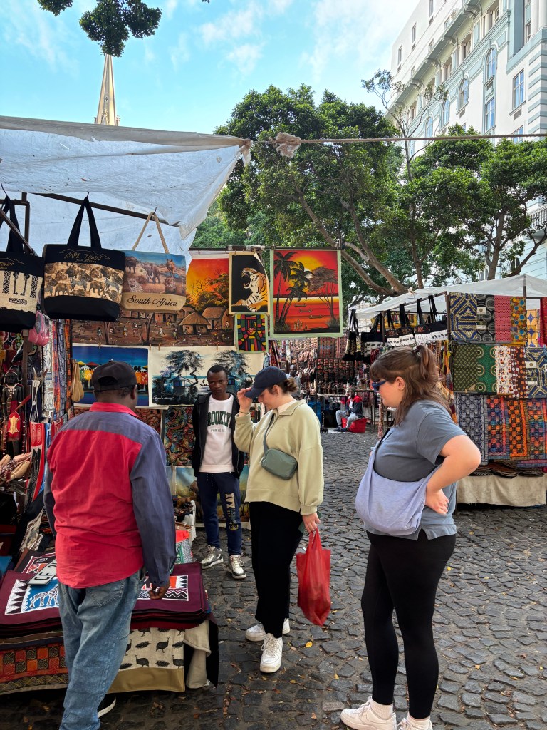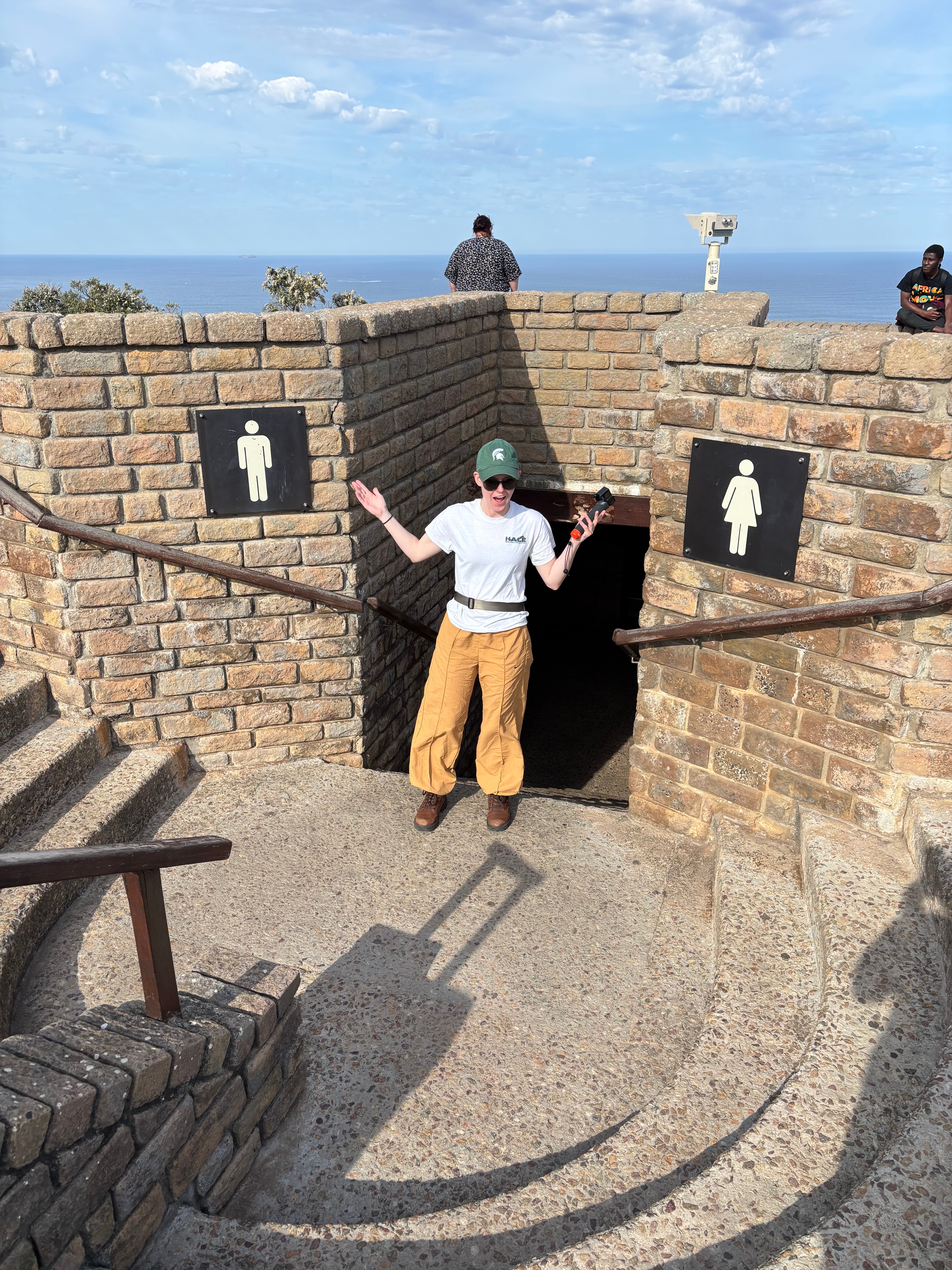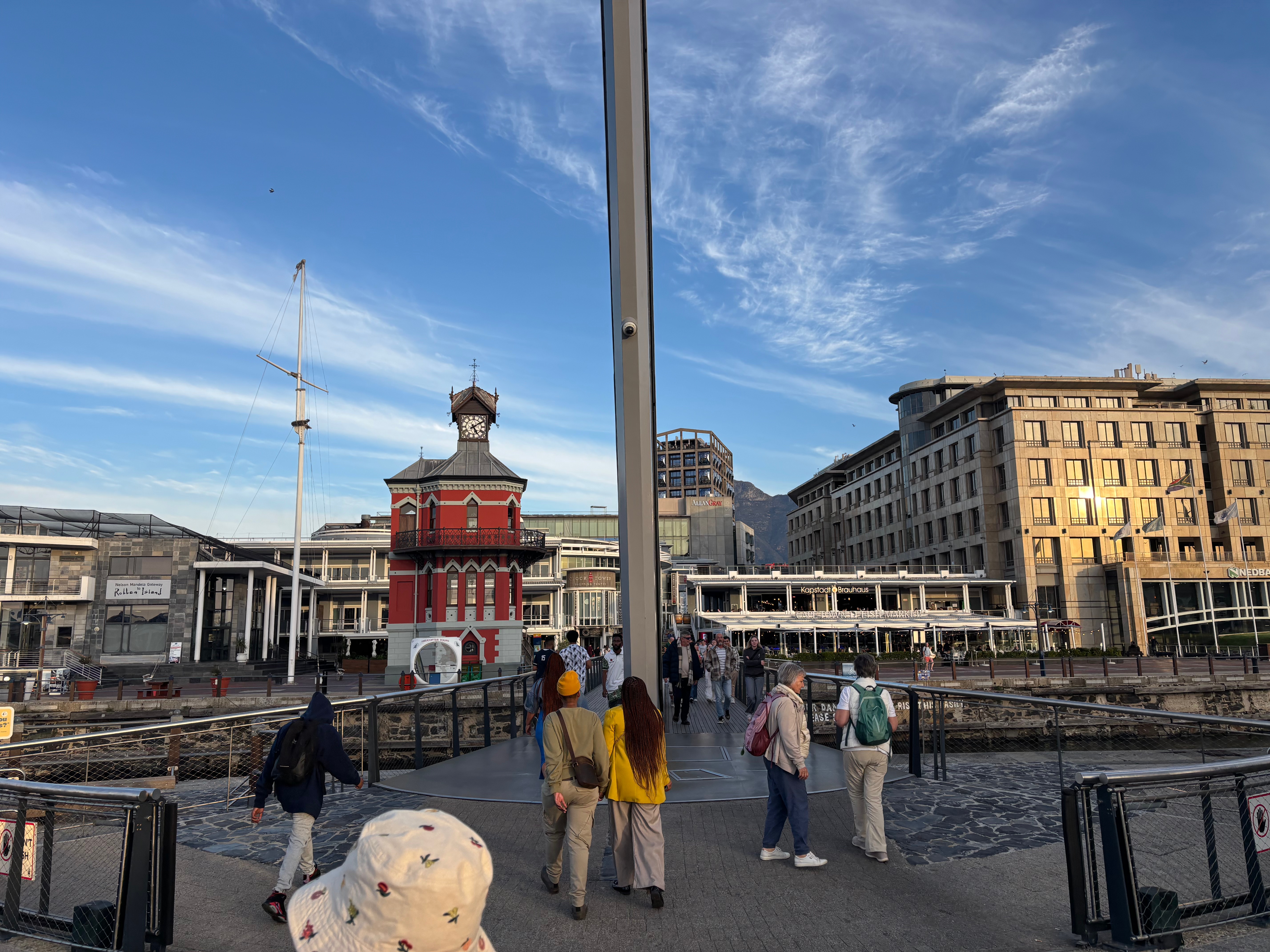 We arrived in the city itself and stopped off at our hotel, the Protea Hotel Breakwater Lodge. The hotel was an old jail on the Cape Town waterfront, and staying there was a very cool experience. I again roomed with Laurel and Taylor, but this time I got my own bedroom with a shared bathroom. We dropped off our stuff and then went to grab dinner. We ended up at a Time Out Market on the waterfront. Time Out is a brand you can find here in Chicago, with a variety of local food stalls. Nearby, there was a statue of Nobel Peace Prize laureates, and the streets were teeming with street performers. We had a fantastic view of Table Mountain as we wandered the waterfront, and we just spent the afternoon taking in the liveliness of the area. We ended up randomly running into some alumni of the program who were taking their own college students to Cape Town for a study abroad experience.