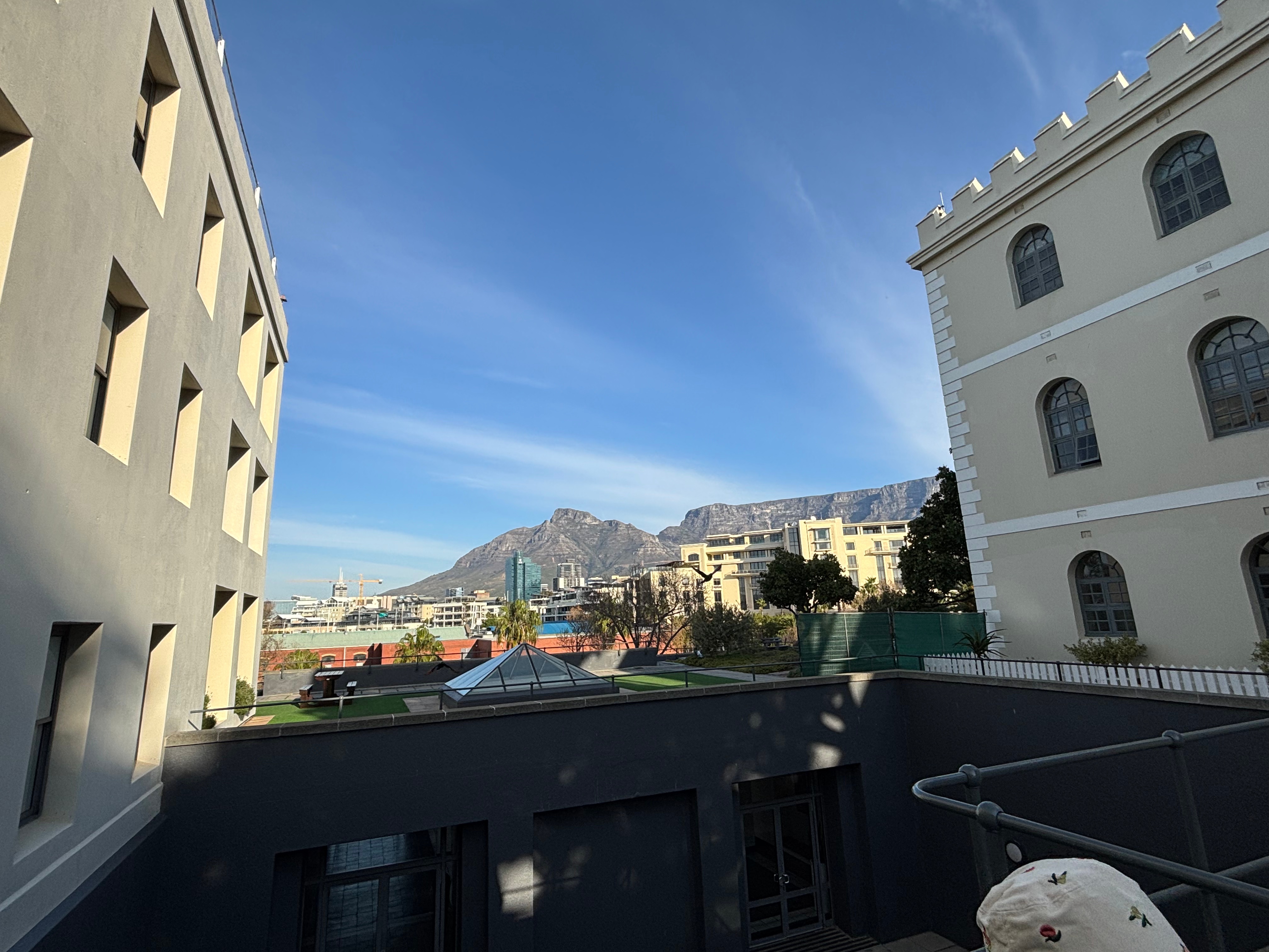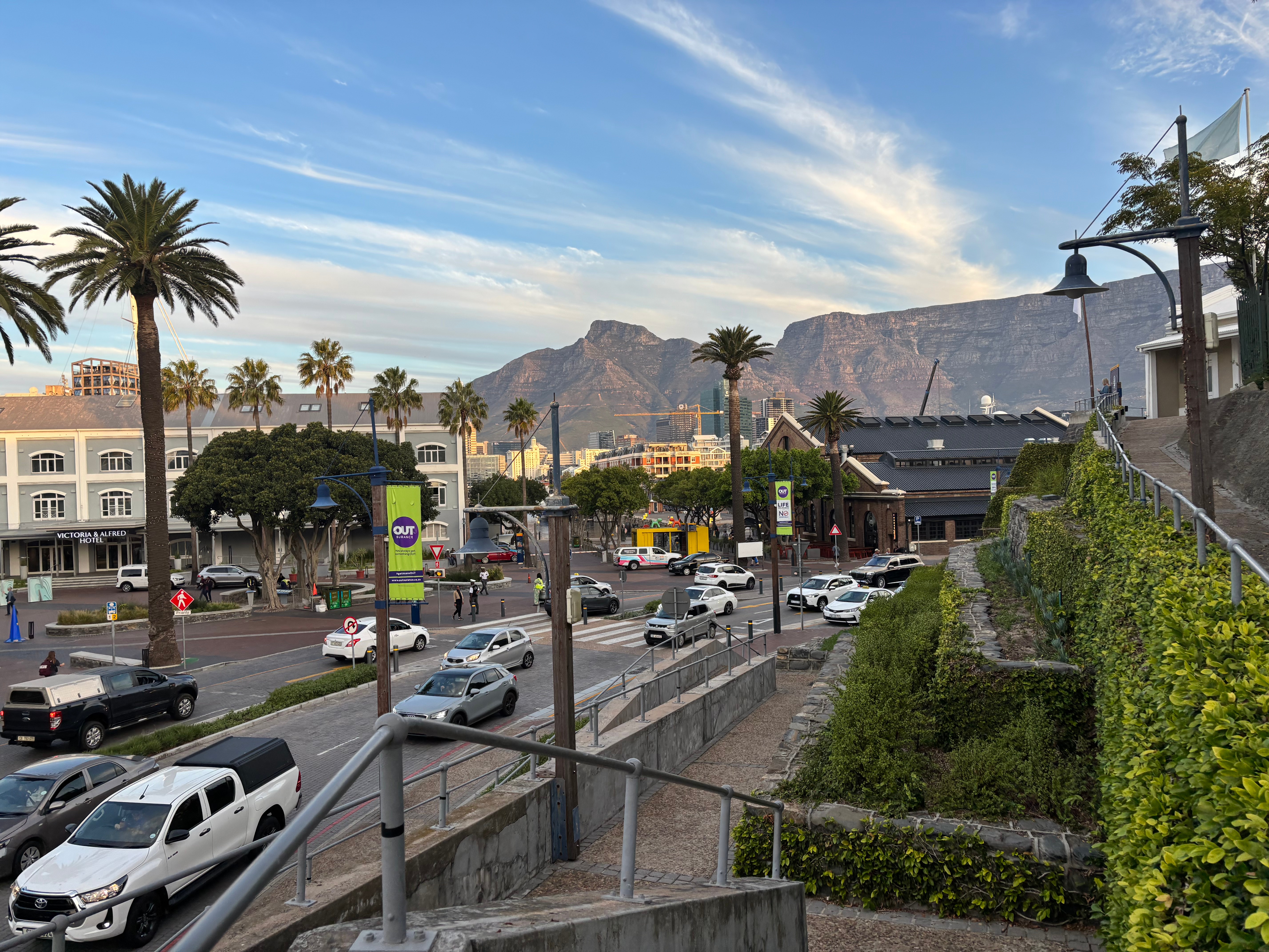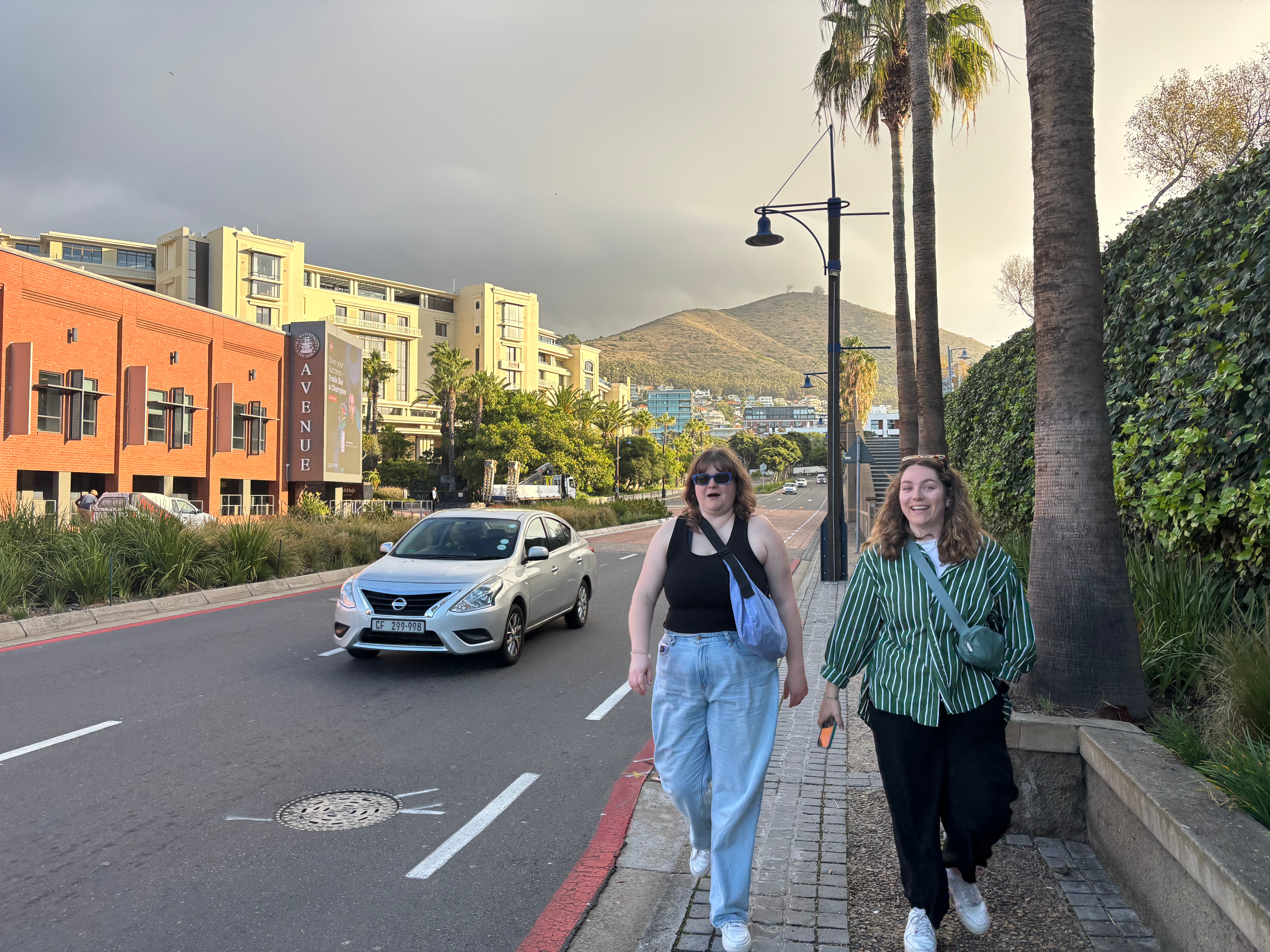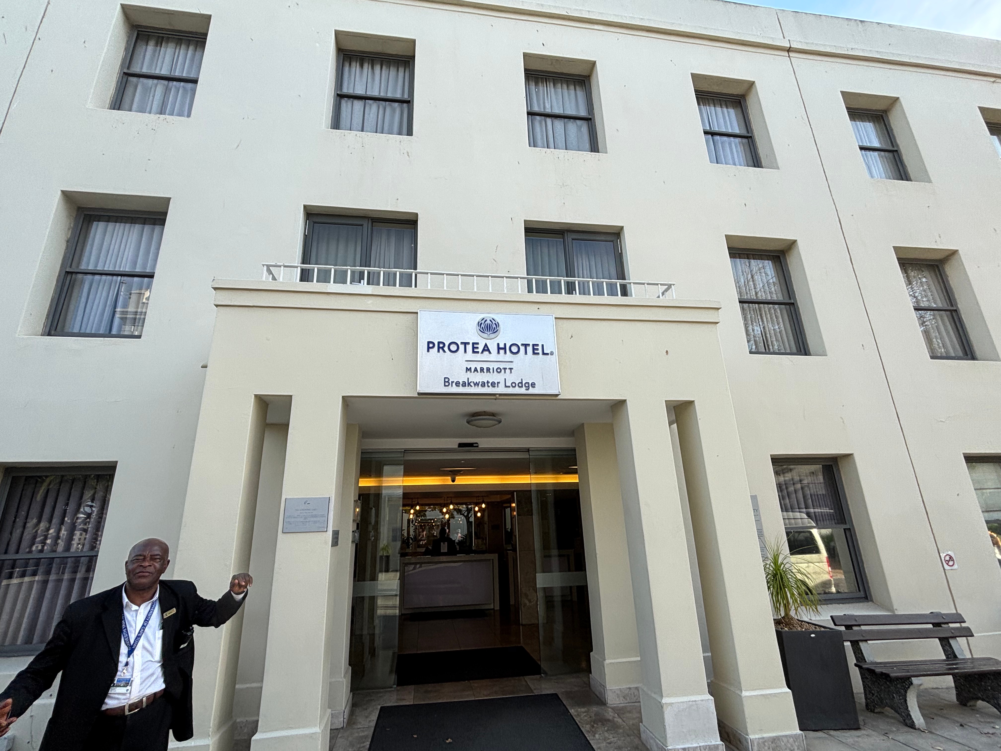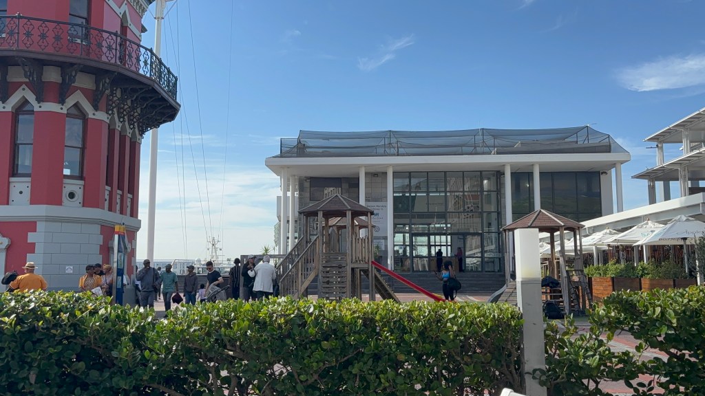 We arrived in the city itself and stopped off at our hotel, the Protea Hotel Breakwater Lodge. The hotel was an old jail on the Cape Town waterfront, and staying there was a very cool experience. I again roomed with Laurel and Taylor, but this time I got my own bedroom with a shared bathroom. We dropped off our stuff and then went to grab dinner. We ended up at a Time Out Market on the waterfront. Time Out is a brand you can find here in Chicago, with a variety of local food stalls. Nearby, there was a statue of Nobel Peace Prize laureates, and the streets were teeming with street performers. We had a fantastic view of Table Mountain as we wandered the waterfront, and we just spent the afternoon taking in the liveliness of the area. We ended up randomly running into some alumni of the program who were taking their own college students to Cape Town for a study abroad experience.