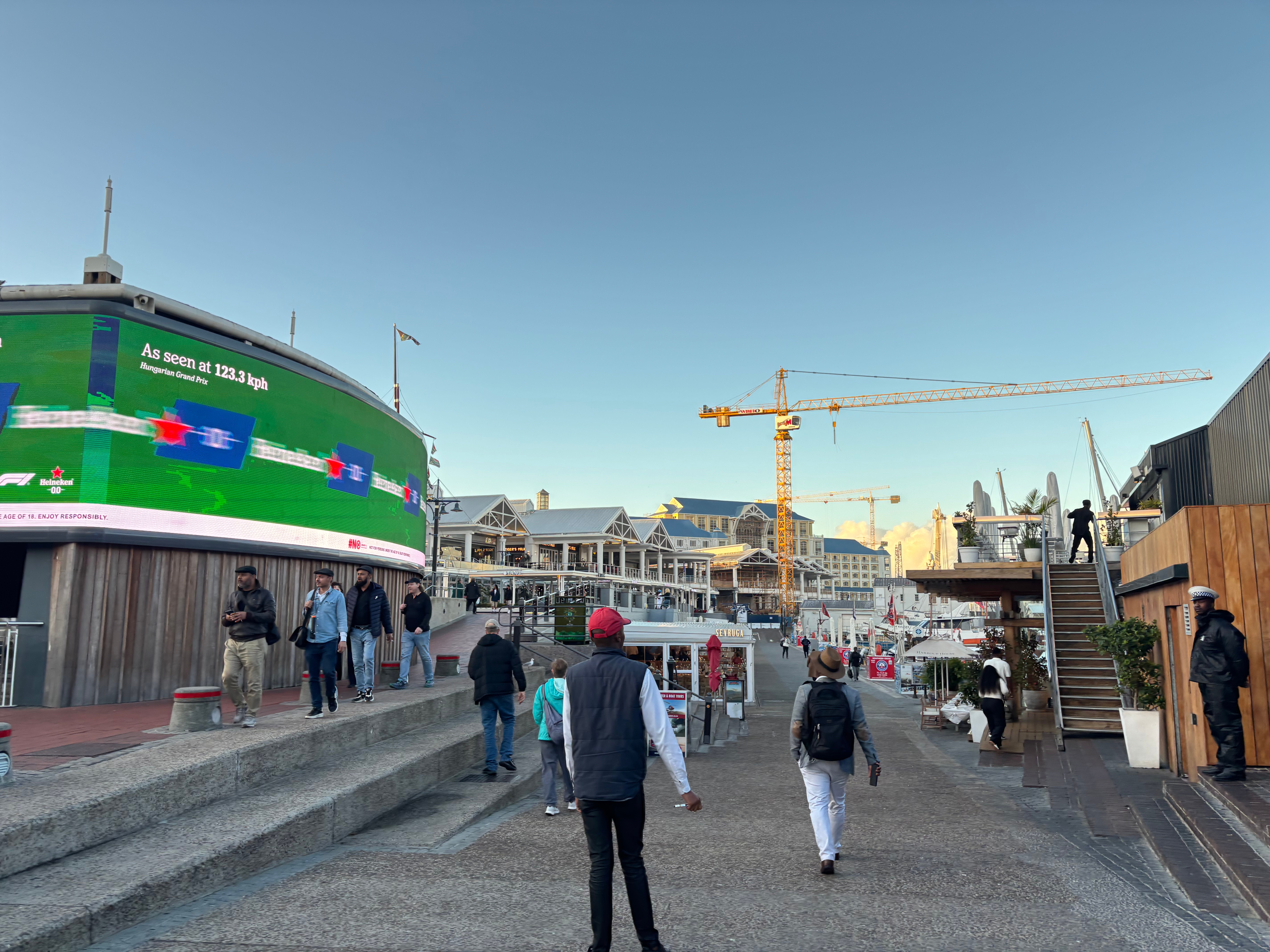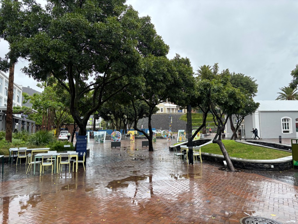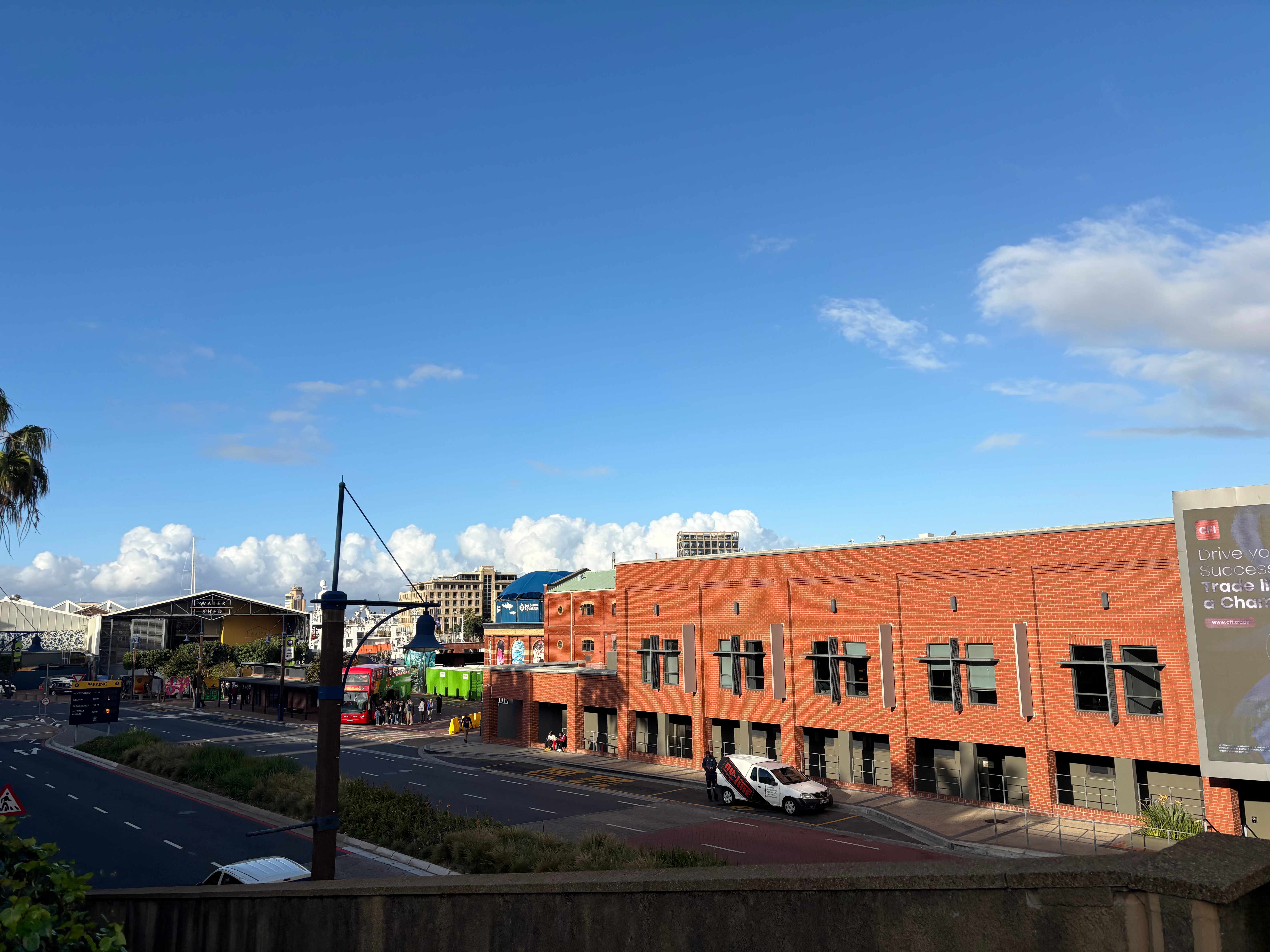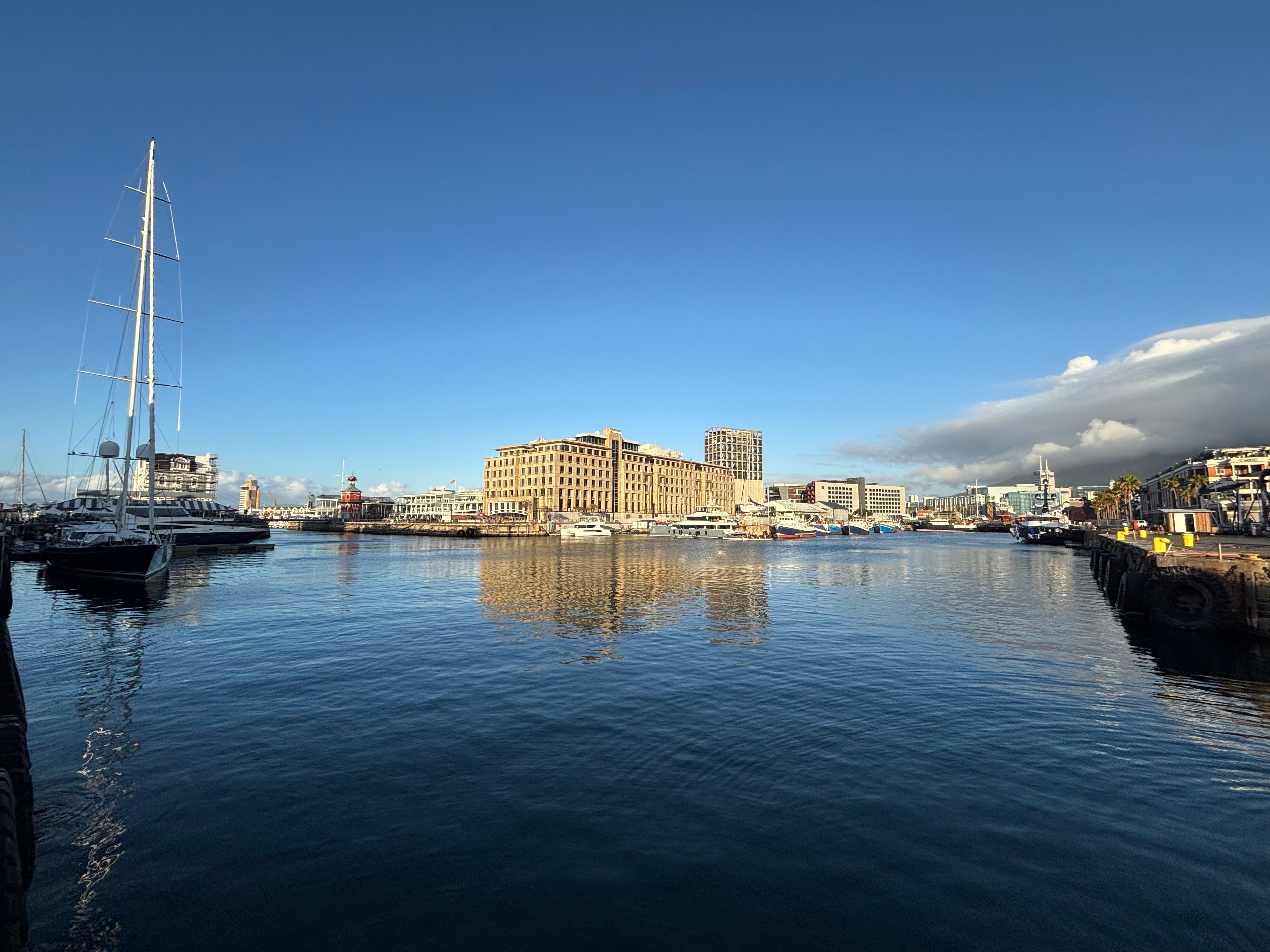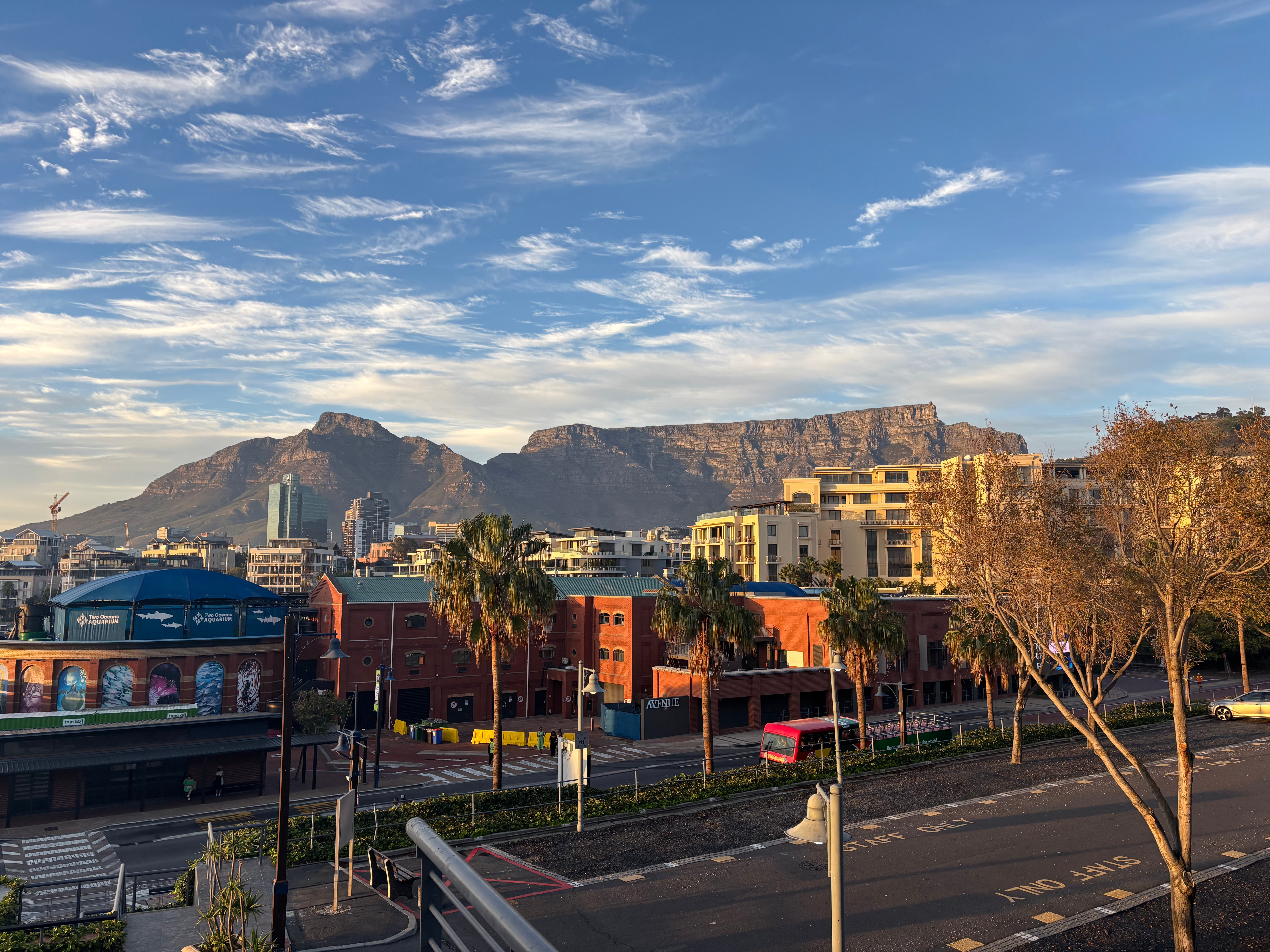 We arrived in the city itself and stopped off at our hotel, the Protea Hotel Breakwater Lodge. The hotel was an old jail on the Cape Town waterfront, and staying there was a very cool experience. I again roomed with Laurel and Taylor, but this time I got my own bedroom with a shared bathroom. We dropped off our stuff and then went to grab dinner. We ended up at a Time Out Market on the waterfront. Time Out is a brand you can find here in Chicago, with a variety of local food stalls. Nearby, there was a statue of Nobel Peace Prize laureates, and the streets were teeming with street performers. We had a fantastic view of Table Mountain as we wandered the waterfront, and we just spent the afternoon taking in the liveliness of the area. We ended up randomly running into some alumni of the program who were taking their own college students to Cape Town for a study abroad experience.