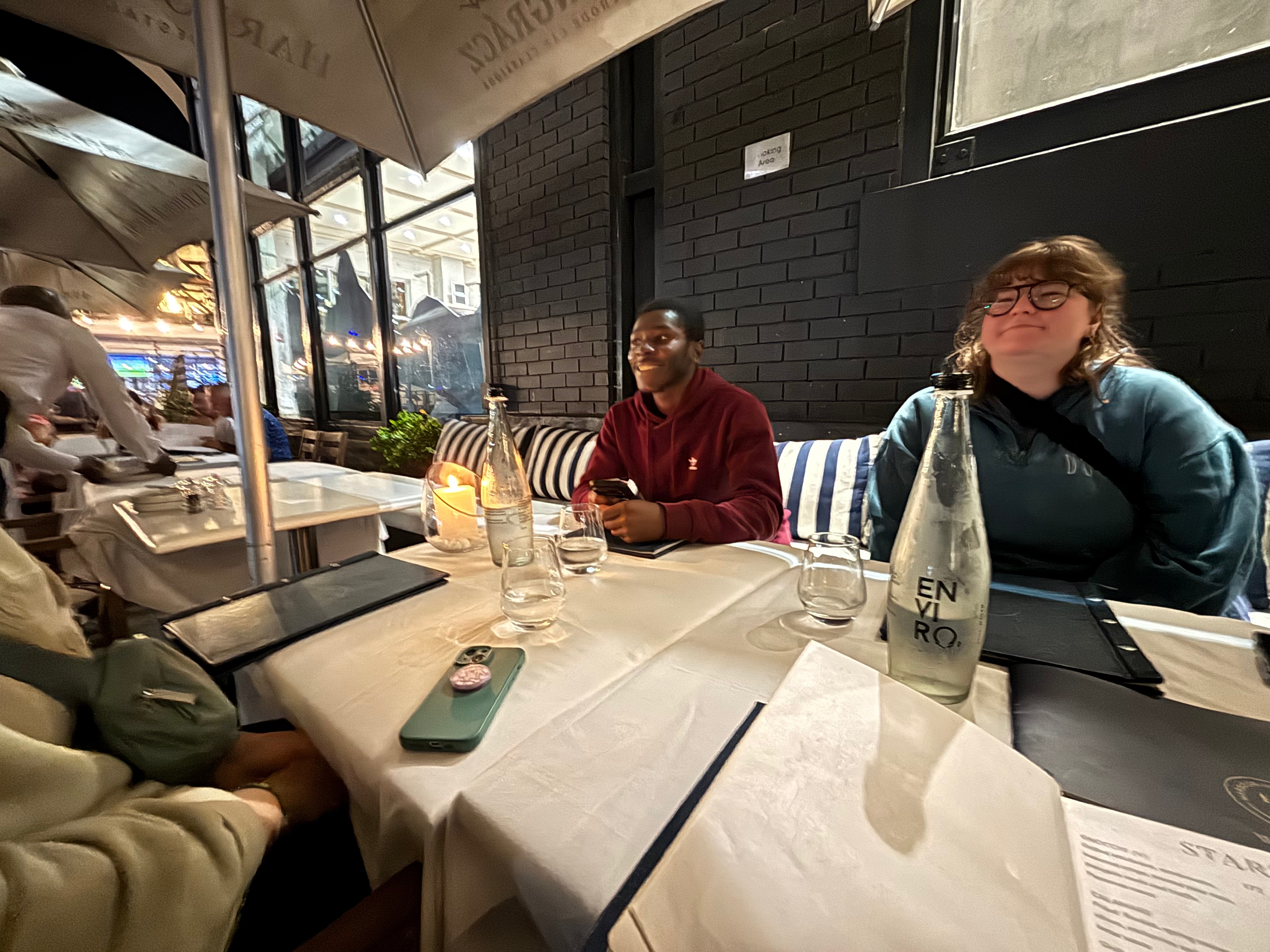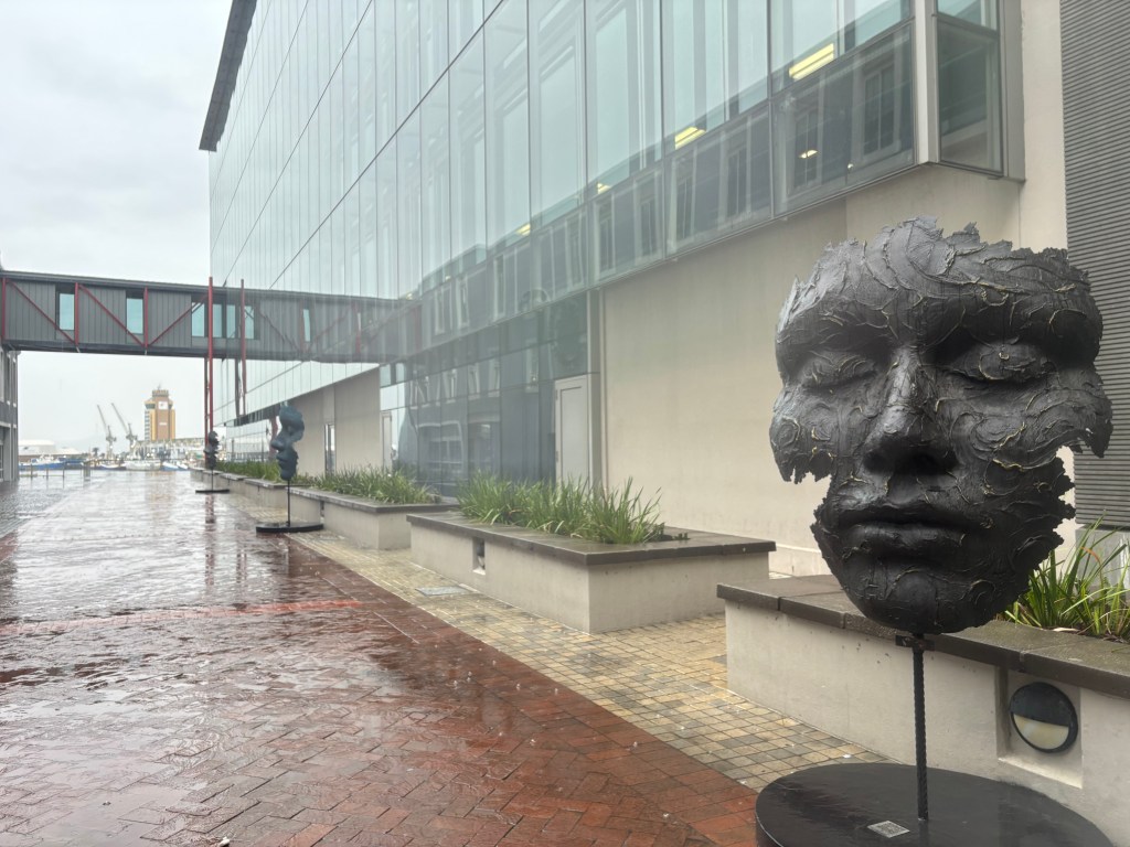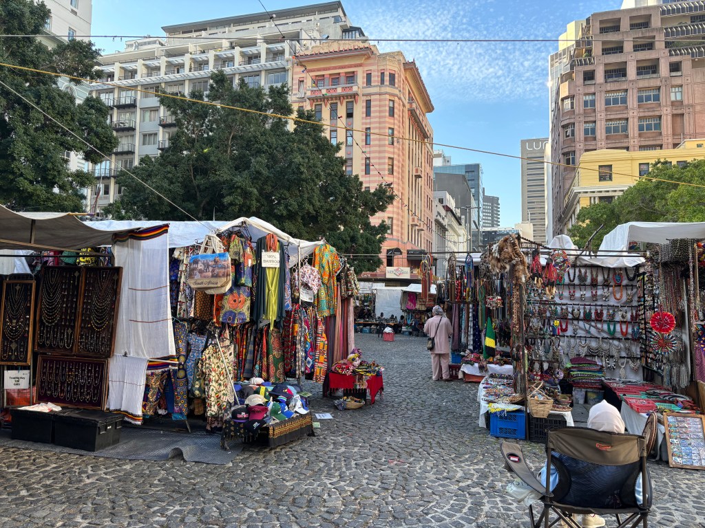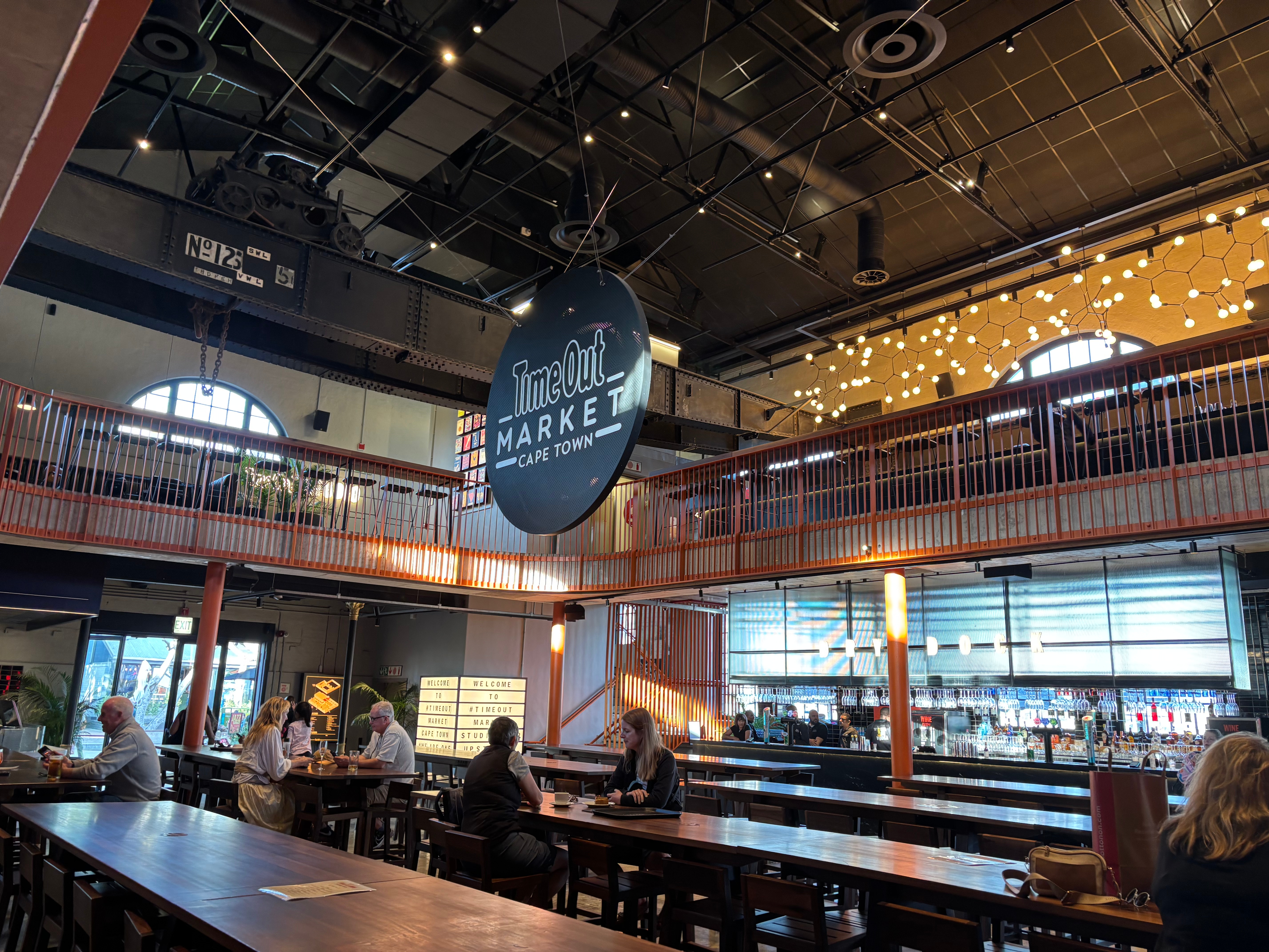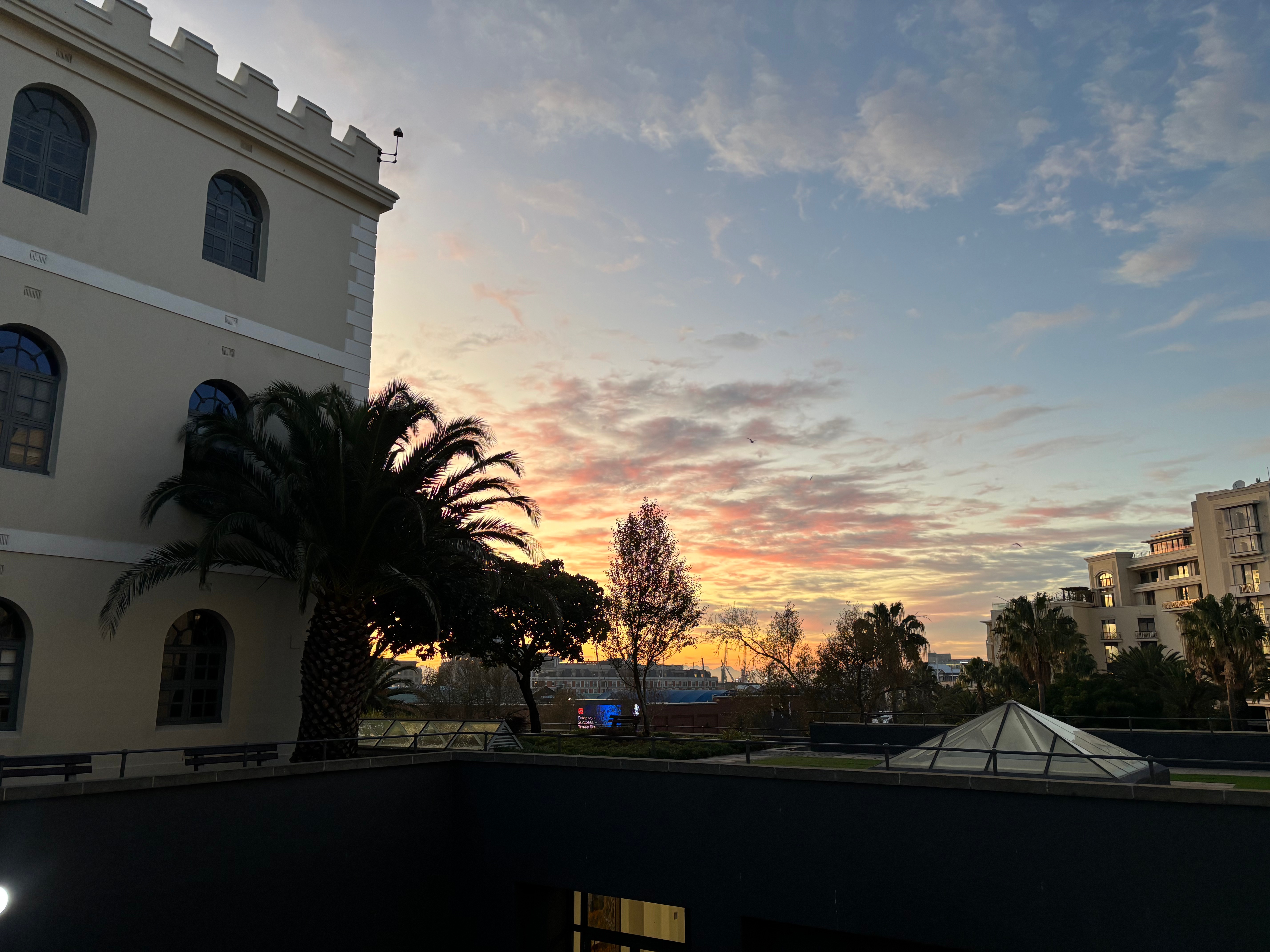 We arrived in the city itself and stopped off at our hotel, the Protea Hotel Breakwater Lodge. The hotel was an old jail on the Cape Town waterfront, and staying there was a very cool experience. I again roomed with Laurel and Taylor, but this time I got my own bedroom with a shared bathroom. We dropped off our stuff and then went to grab dinner. We ended up at a Time Out Market on the waterfront. Time Out is a brand you can find here in Chicago, with a variety of local food stalls. Nearby, there was a statue of Nobel Peace Prize laureates, and the streets were teeming with street performers. We had a fantastic view of Table Mountain as we wandered the waterfront, and we just spent the afternoon taking in the liveliness of the area. We ended up randomly running into some alumni of the program who were taking their own college students to Cape Town for a study abroad experience.