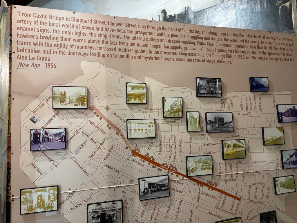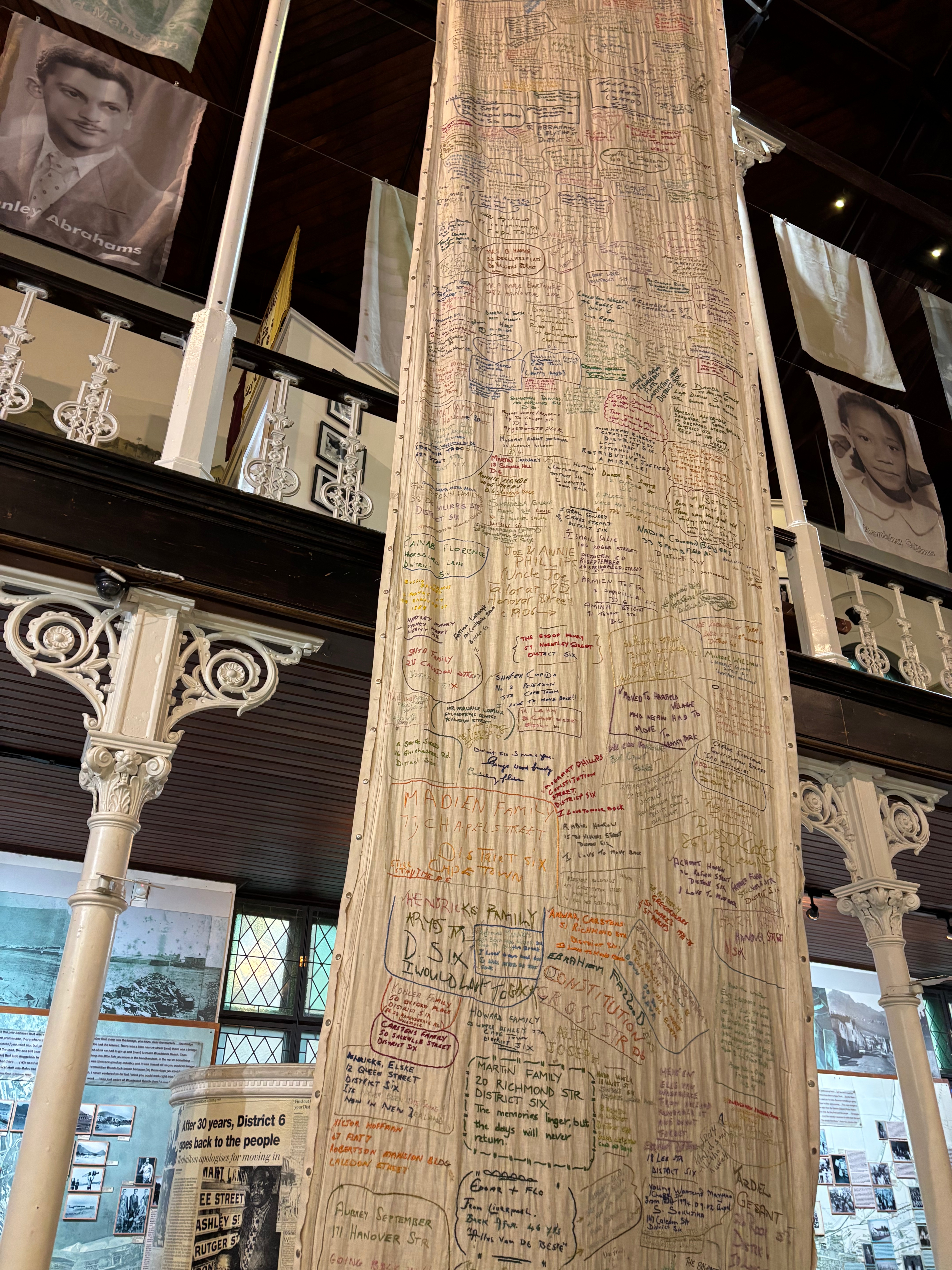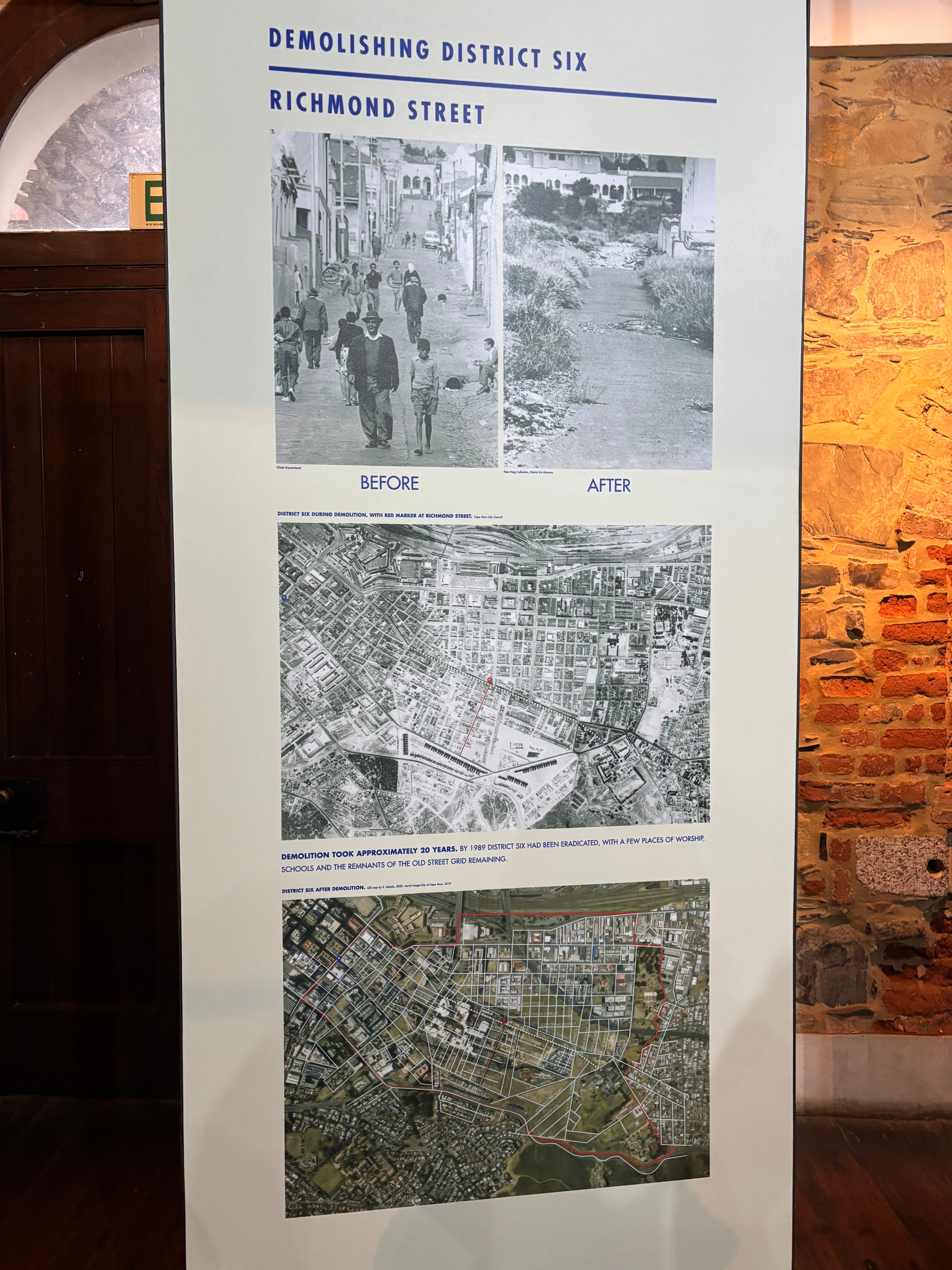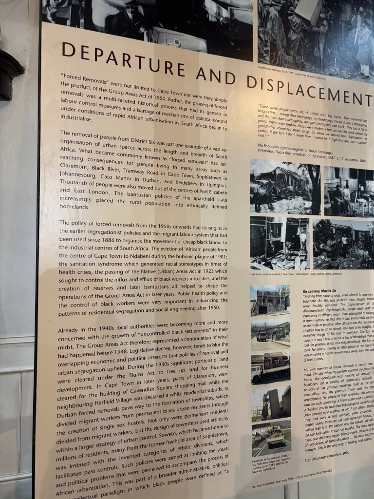 Our flight out of South Africa wasn’t until the evening, so the next morning, we headed out to the District Six museum. District Six was a neighborhood in Cape Town where residents were forcibly removed during the Apartheid era to make room for gentrification and government buildings. District Six was a bustling and diverse neighborhood before the forced relocation of 60,000 residents to the townships, the shantytowns on the outskirts of the city. The museum, housed in an old Methodist church within the district, chronicles the experiences of the residents before and during the removal, showcasing individual stories, before and after pictures, and tour guides who were former residents sharing their stories.