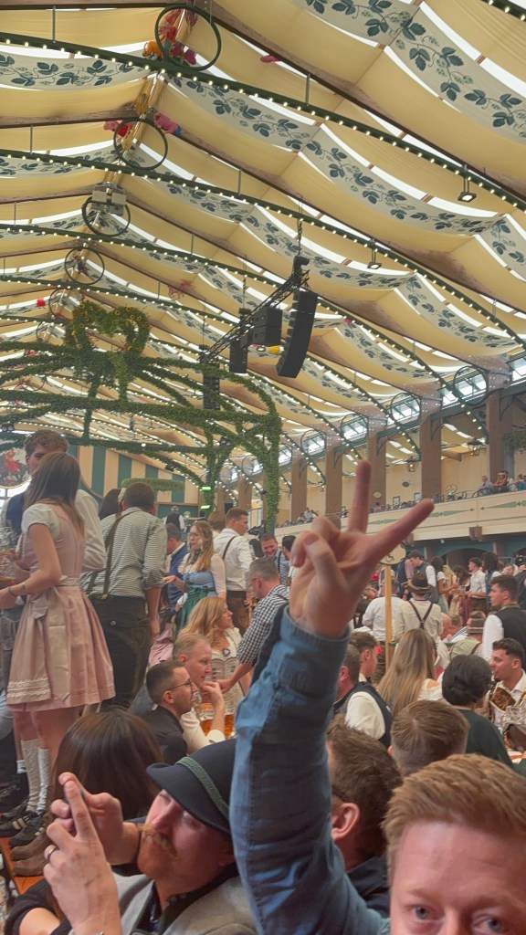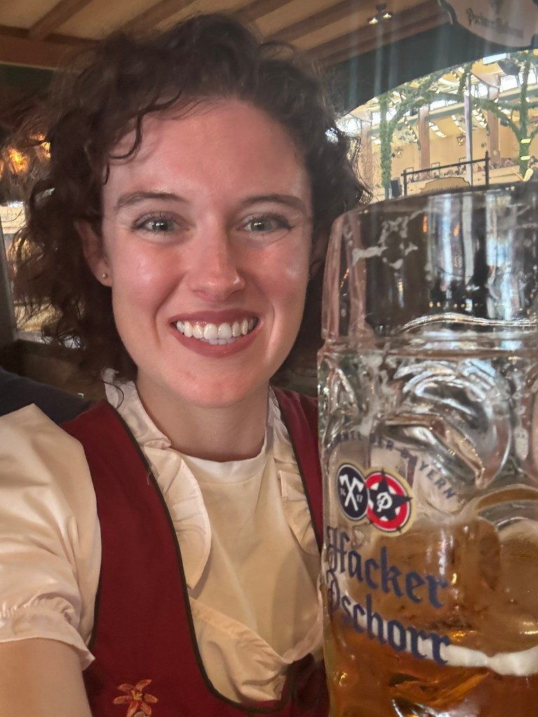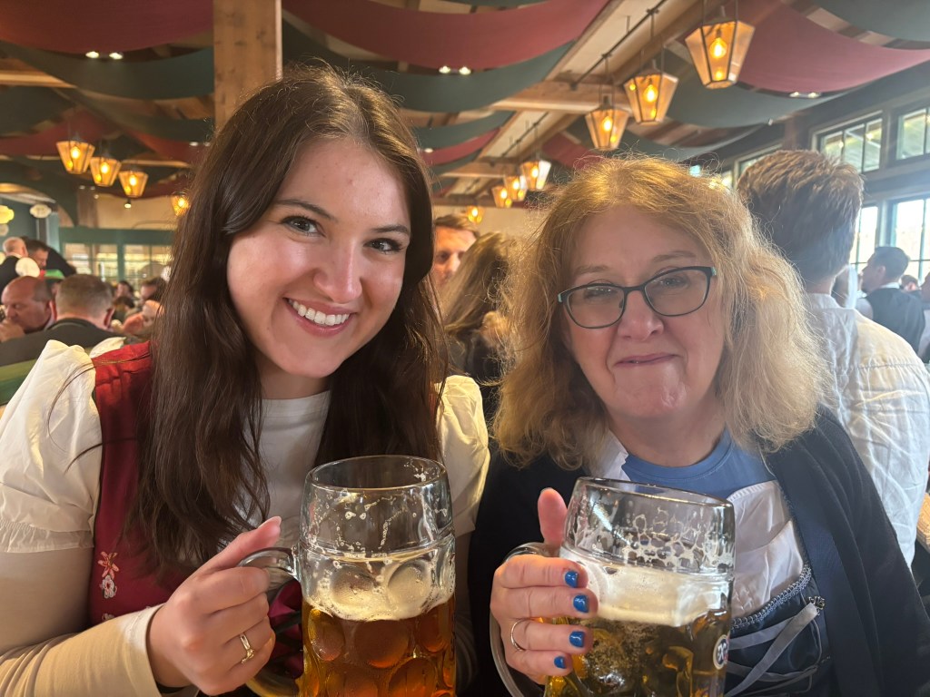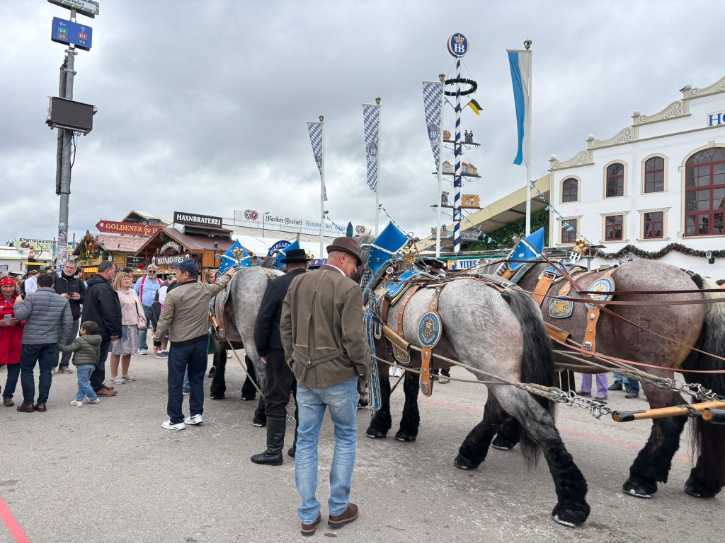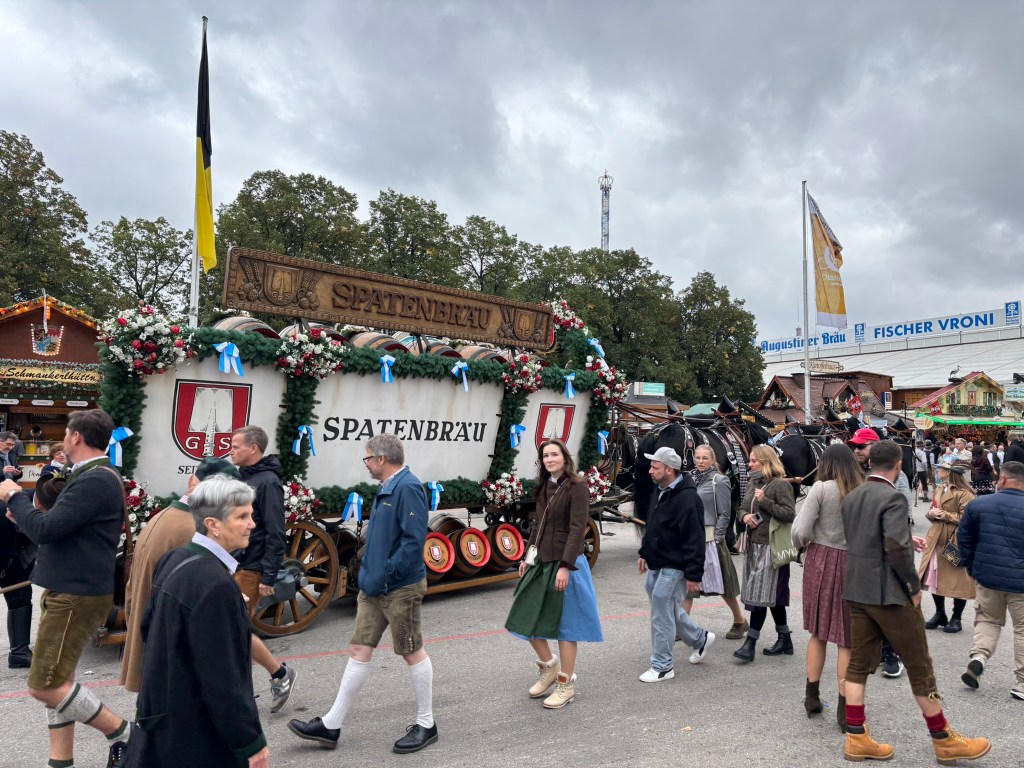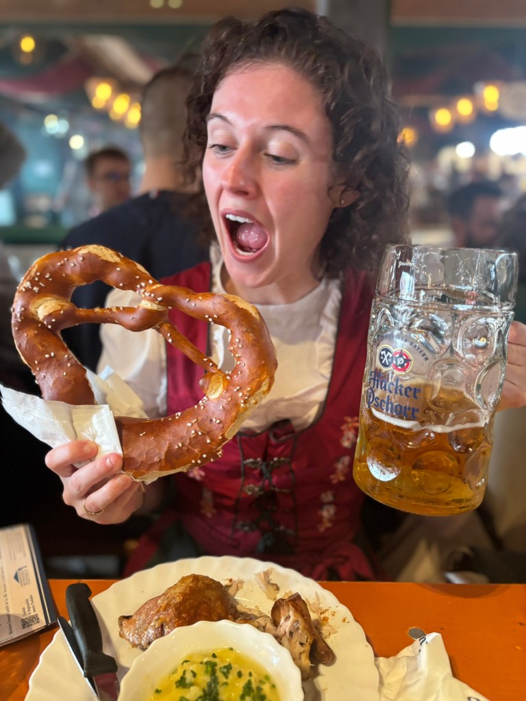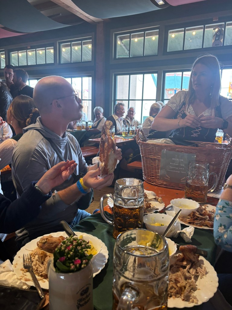 We had a reservation and headed to our tent, the Pshorr Braucosl tent, after running across some dray horses pulling barrels of beer and taking the necessary photos. Because of some mix-up, our table had been given away. However, we wandered around a bit and found multiple open ones, and we quickly settled into the new table and ordered our beer and food. My sister discovered that she really liked the German version of Radlers, a combination of beer and soda rather than the beer and lemonade combination we’re used to, so she consistently ordered Radlers for the duration of the trip, including at Oktoberfest. I got regular beers. My mom actively dislikes beer, but we convinced her to have a sip of each of my beers across the trip, and she even had a few sips of her own Radler before my sister and I helped her finish it. We are very proud of her for trying it and for having more than one sip of a beer-based drink at Oktoberfest. That is more than we expected from her because of her strong dislike for it, so we were very pleasantly surprised and impressed that she was playing along so well.