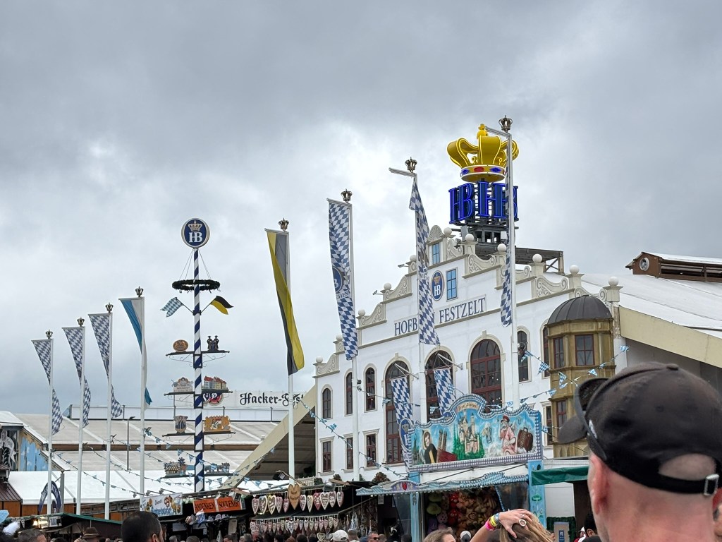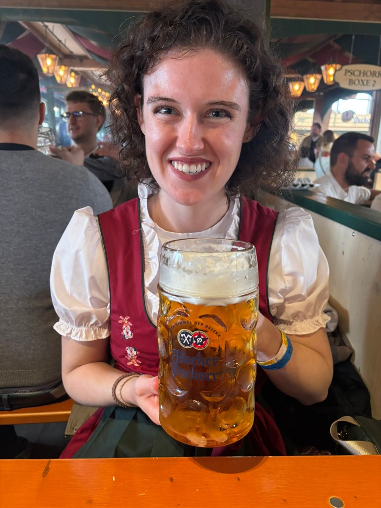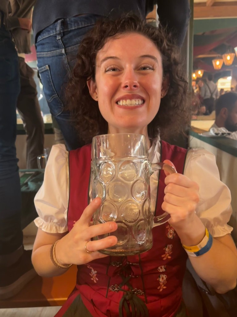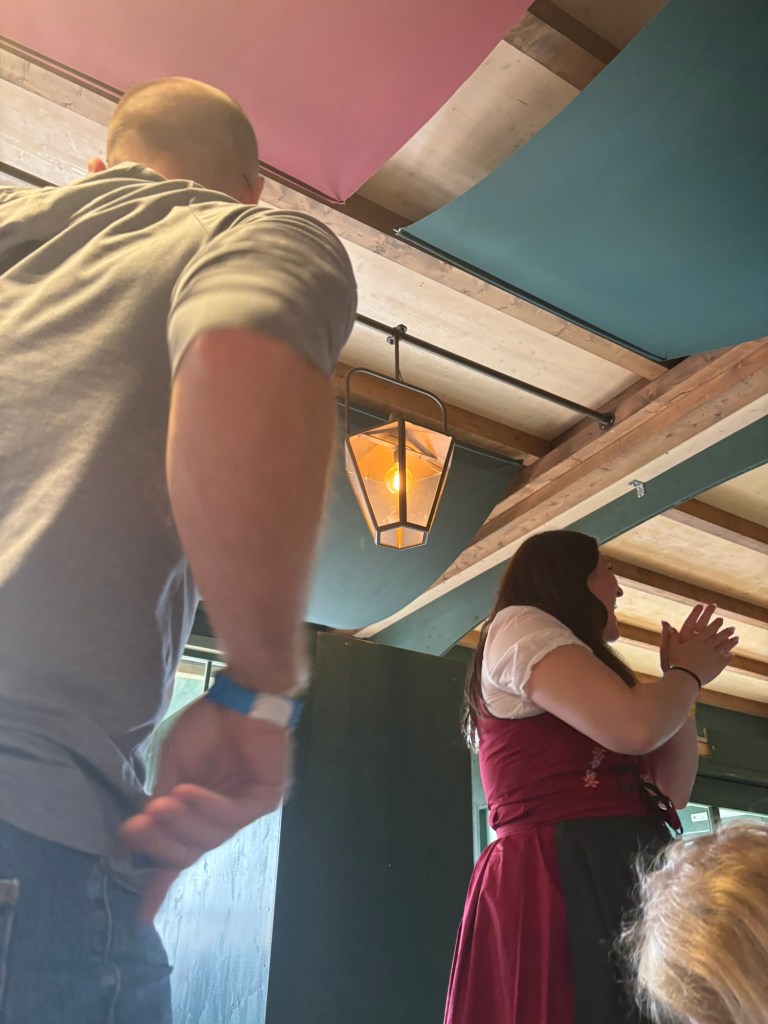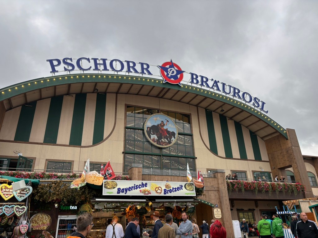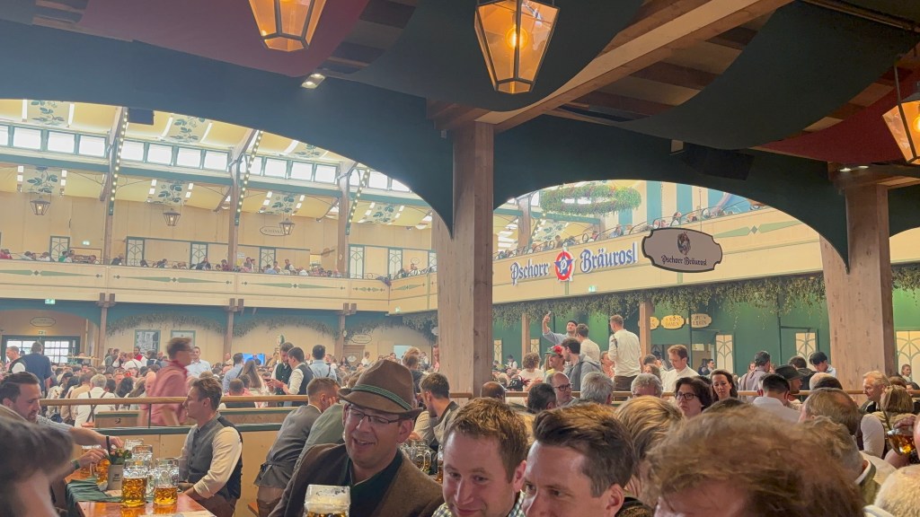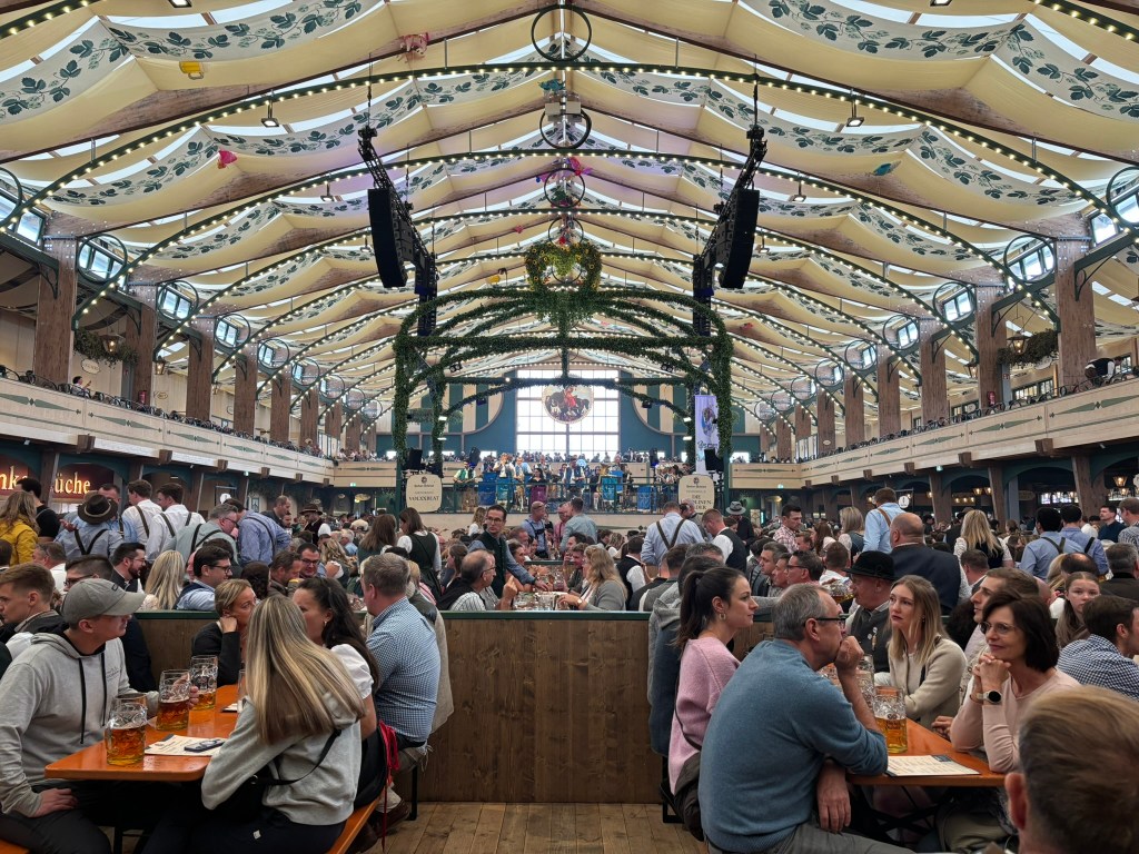 We had a reservation and headed to our tent, the Pshorr Braucosl tent, after running across some dray horses pulling barrels of beer and taking the necessary photos. Because of some mix-up, our table had been given away. However, we wandered around a bit and found multiple open ones, and we quickly settled into the new table and ordered our beer and food. My sister discovered that she really liked the German version of Radlers, a combination of beer and soda rather than the beer and lemonade combination we’re used to, so she consistently ordered Radlers for the duration of the trip, including at Oktoberfest. I got regular beers. My mom actively dislikes beer, but we convinced her to have a sip of each of my beers across the trip, and she even had a few sips of her own Radler before my sister and I helped her finish it. We are very proud of her for trying it and for having more than one sip of a beer-based drink at Oktoberfest. That is more than we expected from her because of her strong dislike for it, so we were very pleasantly surprised and impressed that she was playing along so well.
