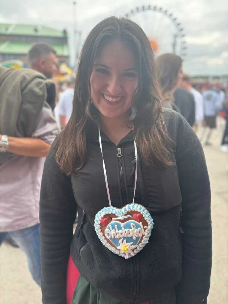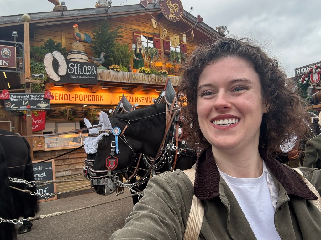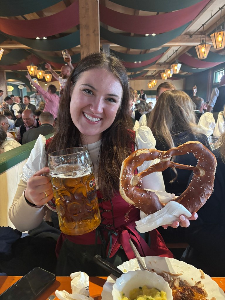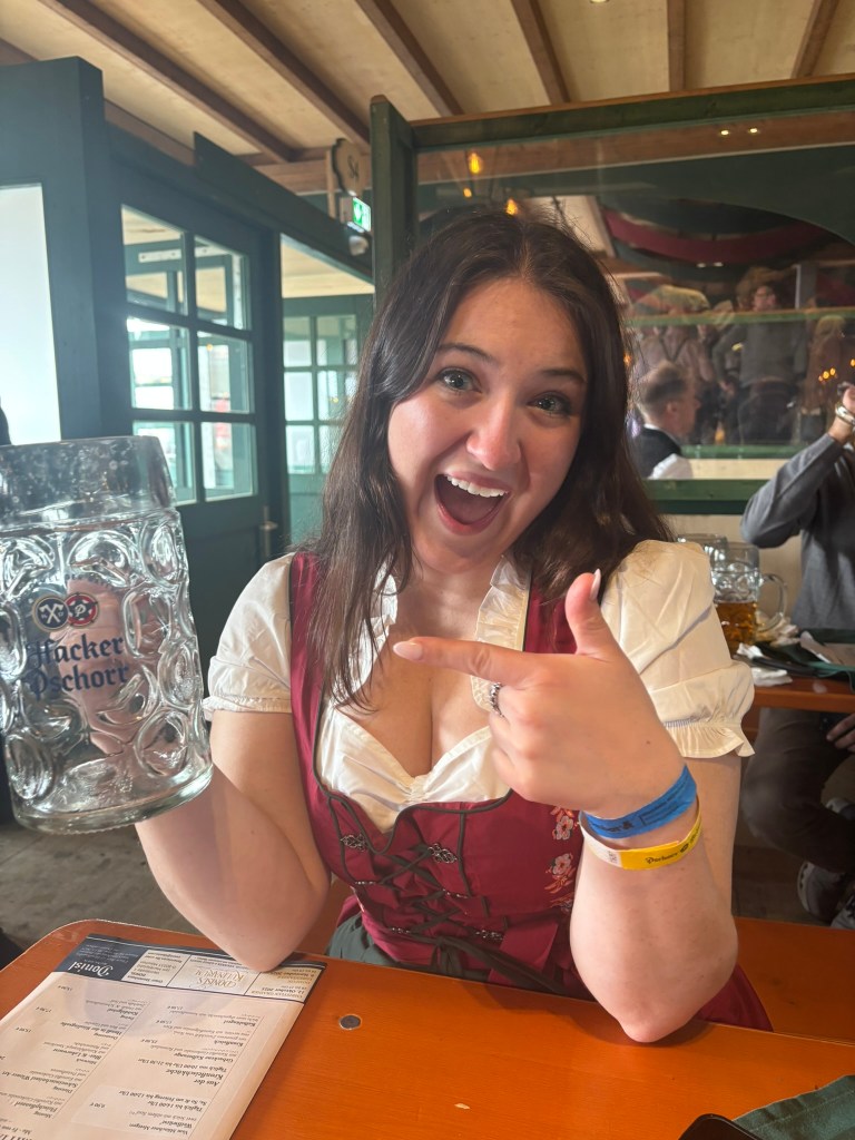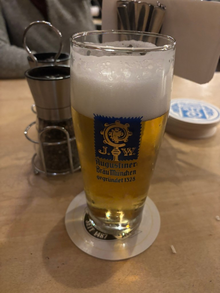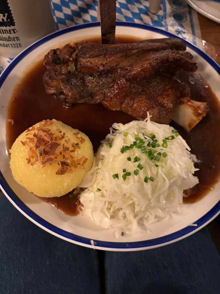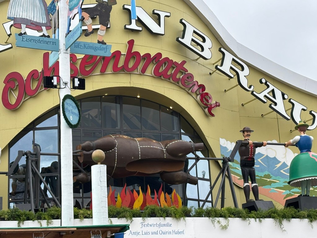We had a reservation and headed to our tent, the Pshorr Braucosl tent, after running across some dray horses pulling barrels of beer and taking the necessary photos. Because of some mix-up, our table had been given away. However, we wandered around a bit and found multiple open ones, and we quickly settled into the new table and ordered our beer and food. My sister discovered that she really liked the German version of Radlers, a combination of beer and soda rather than the beer and lemonade combination we’re used to, so she consistently ordered Radlers for the duration of the trip, including at Oktoberfest. I got regular beers. My mom actively dislikes beer, but we convinced her to have a sip of each of my beers across the trip, and she even had a few sips of her own Radler before my sister and I helped her finish it. We are very proud of her for trying it and for having more than one sip of a beer-based drink at Oktoberfest. That is more than we expected from her because of her strong dislike for it, so we were very pleasantly surprised and impressed that she was playing along so well.
