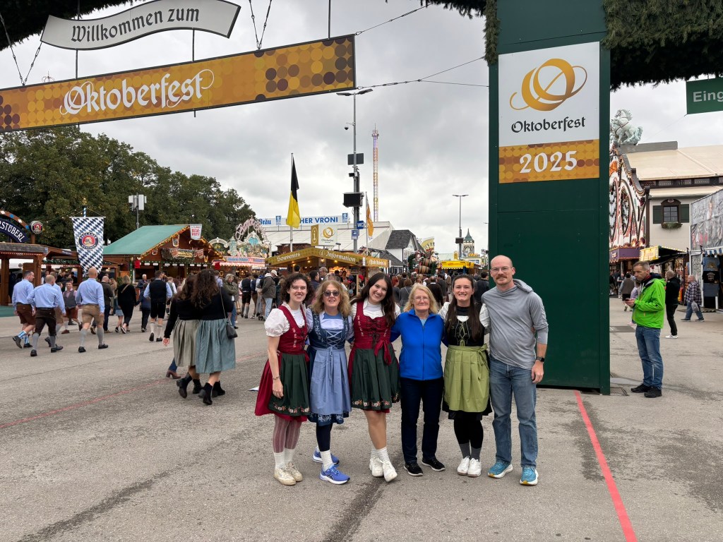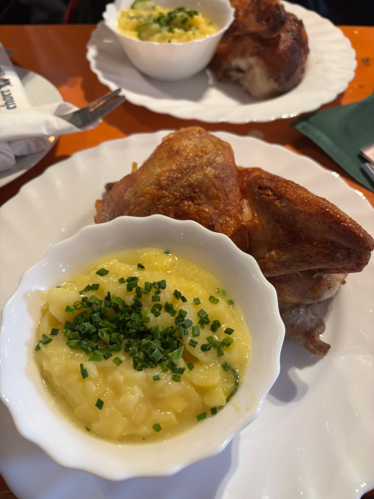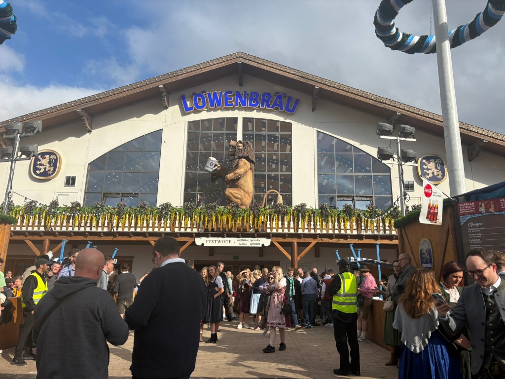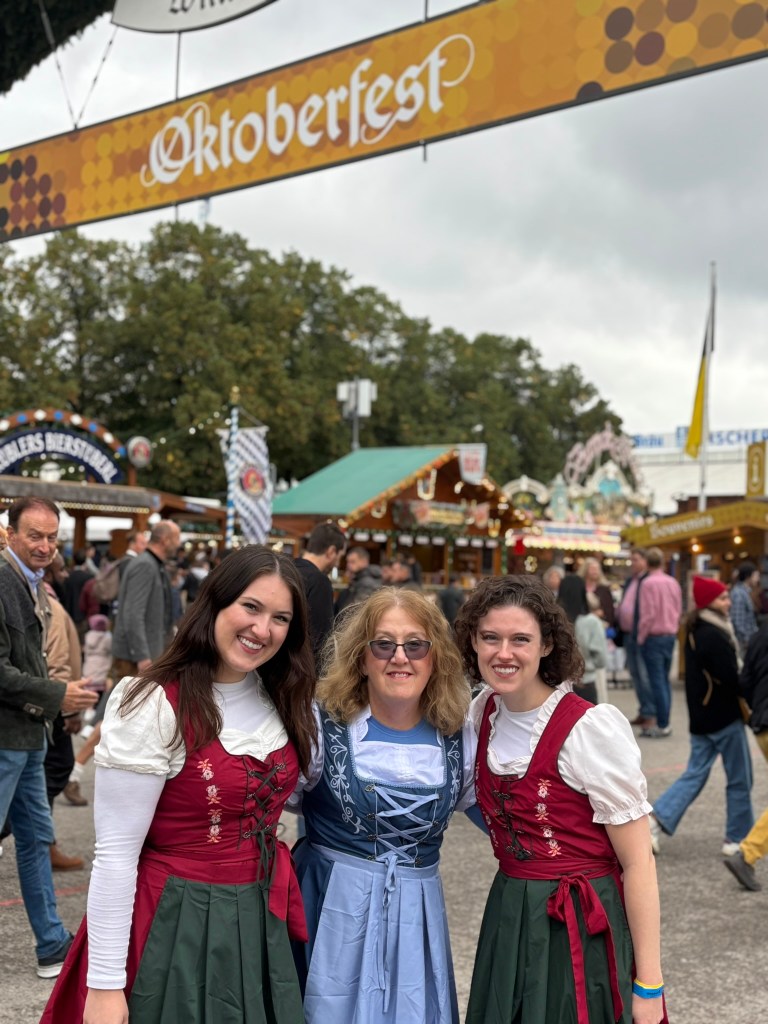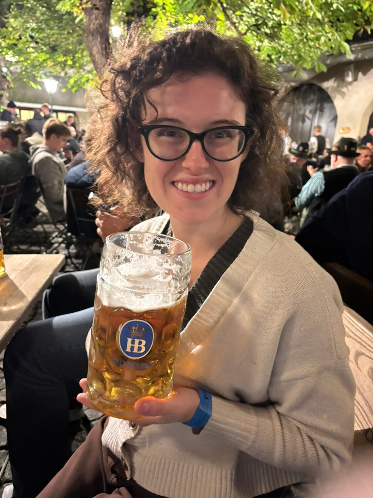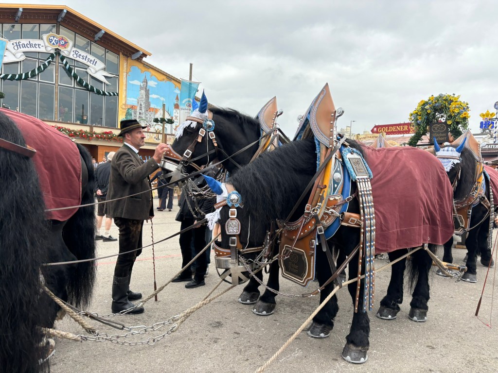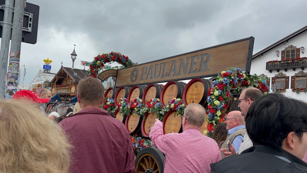 We had a reservation and headed to our tent, the Pshorr Braucosl tent, after running across some dray horses pulling barrels of beer and taking the necessary photos. Because of some mix-up, our table had been given away. However, we wandered around a bit and found multiple open ones, and we quickly settled into the new table and ordered our beer and food. My sister discovered that she really liked the German version of Radlers, a combination of beer and soda rather than the beer and lemonade combination we’re used to, so she consistently ordered Radlers for the duration of the trip, including at Oktoberfest. I got regular beers. My mom actively dislikes beer, but we convinced her to have a sip of each of my beers across the trip, and she even had a few sips of her own Radler before my sister and I helped her finish it. We are very proud of her for trying it and for having more than one sip of a beer-based drink at Oktoberfest. That is more than we expected from her because of her strong dislike for it, so we were very pleasantly surprised and impressed that she was playing along so well.