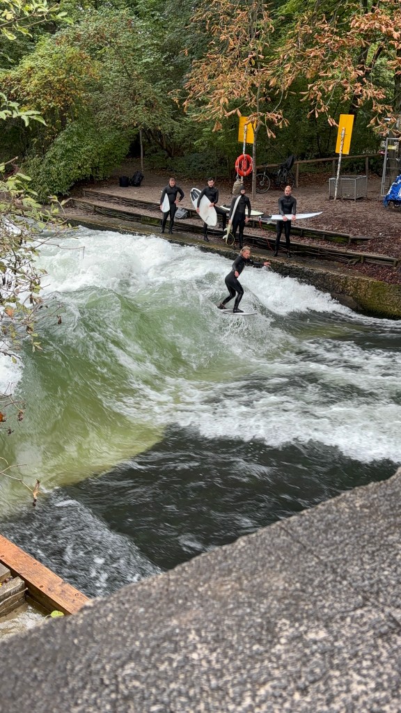We woke the next morning, a Friday, which was our dedicated day for Oktoberfest. We had a reservation for 11-5, so we picked up our tickets (stopping into an open church first) and then had some time to waste before the event. We decided to wander through the English gardens, one of the world’s largest urban parks. After wandering through the park, watching some surfers, and literally stopping to smell the roses, we hopped back on the train to the Oktoberfest grounds.