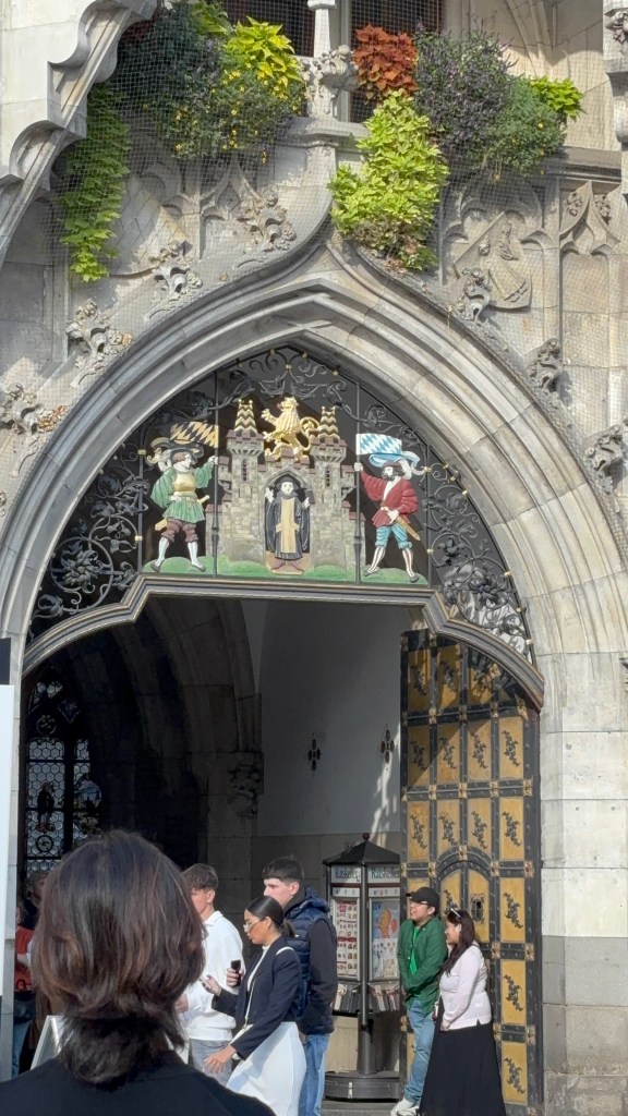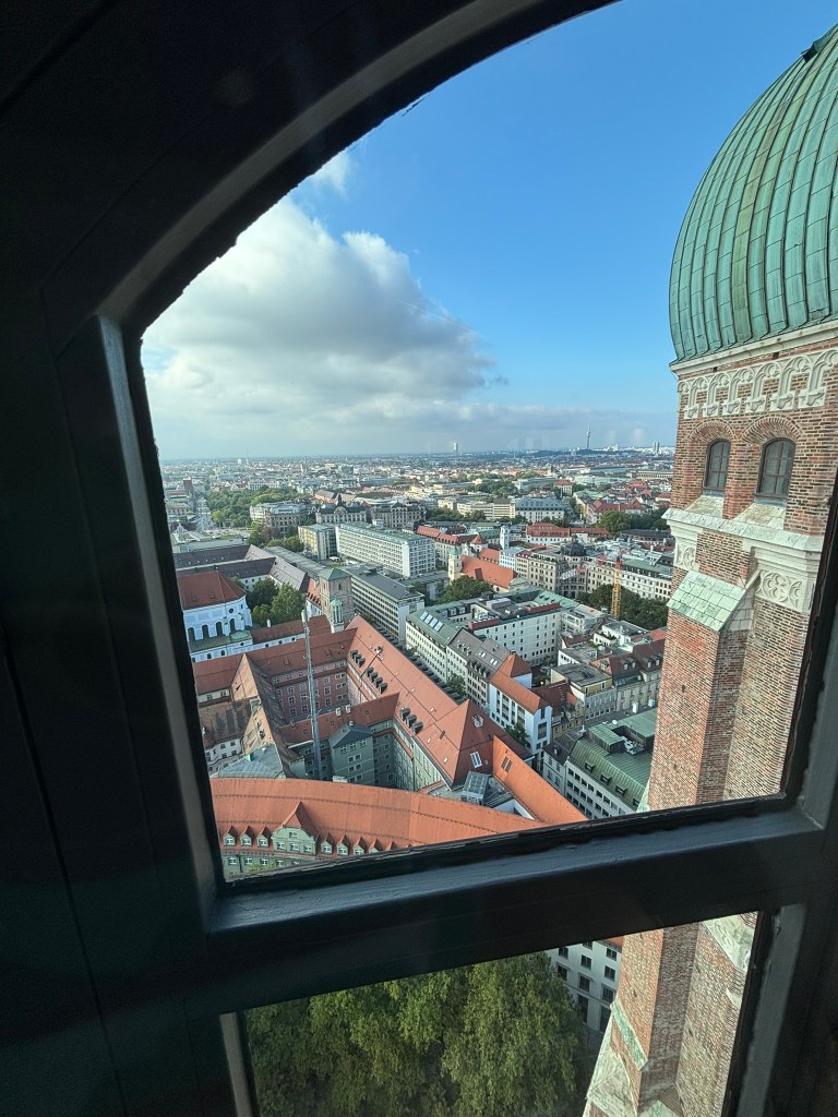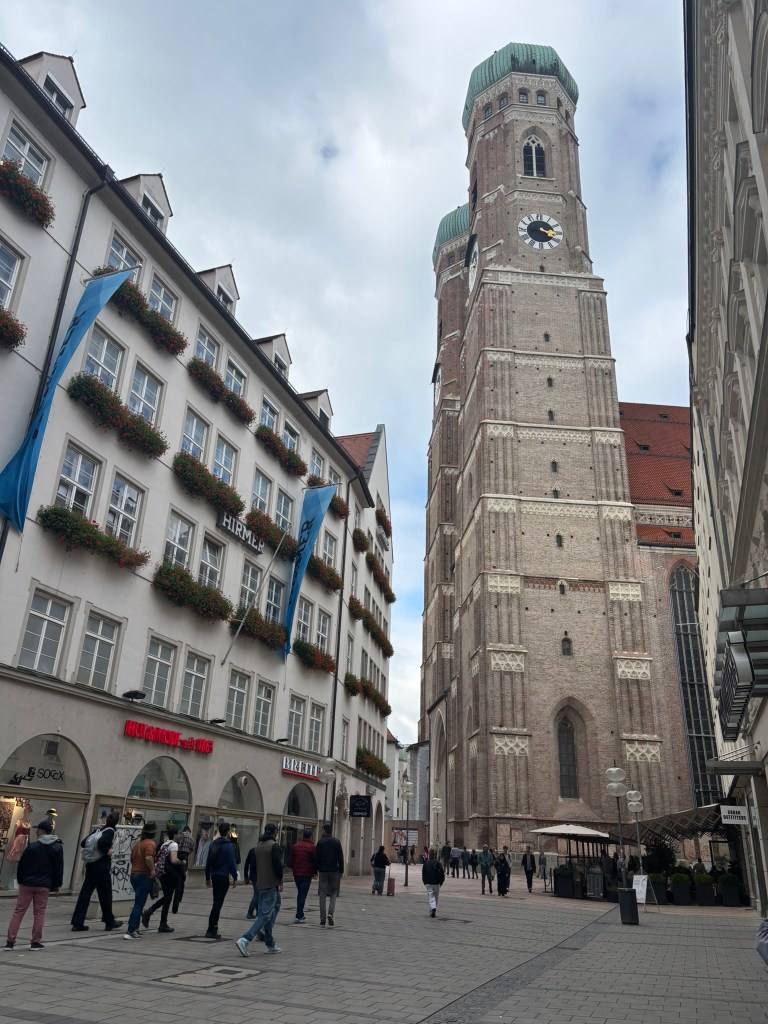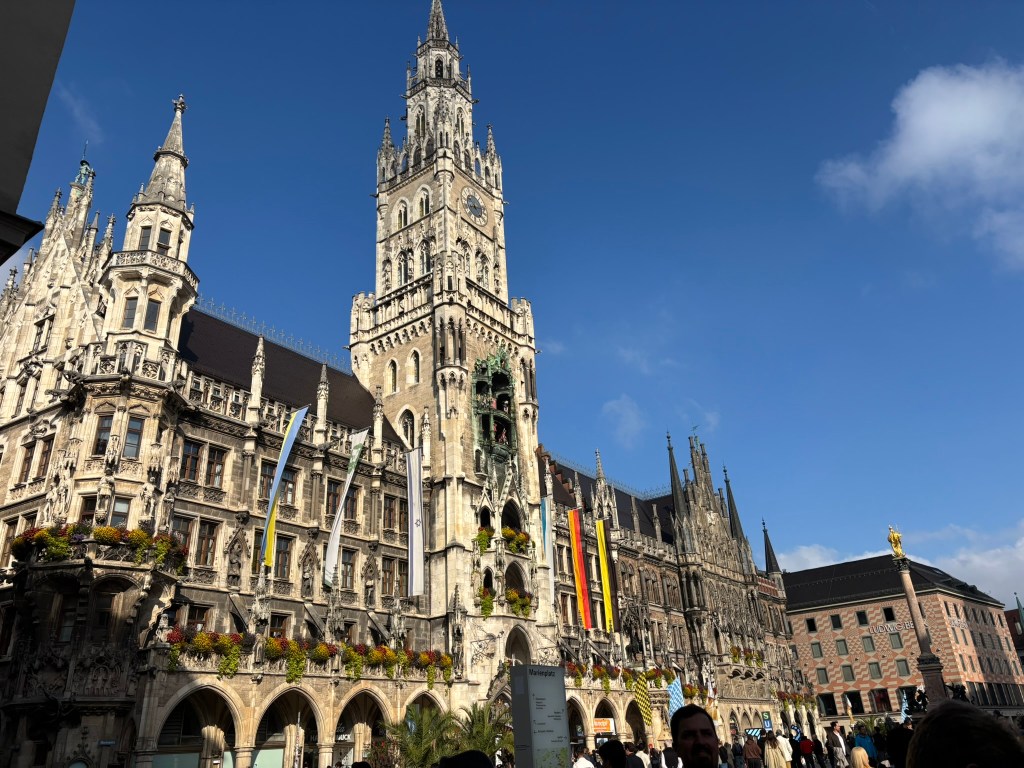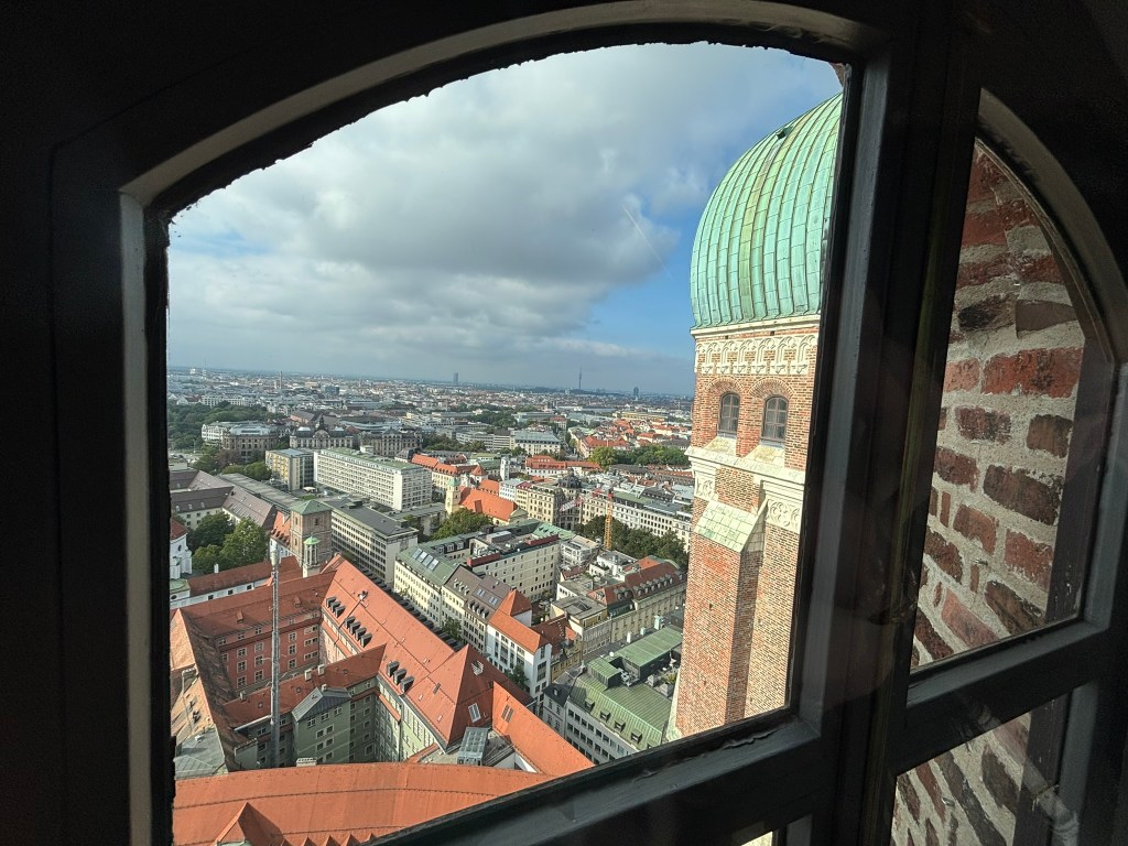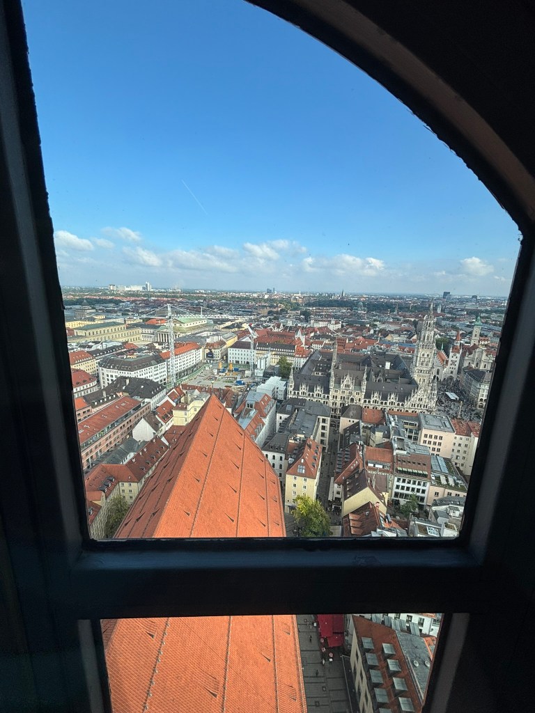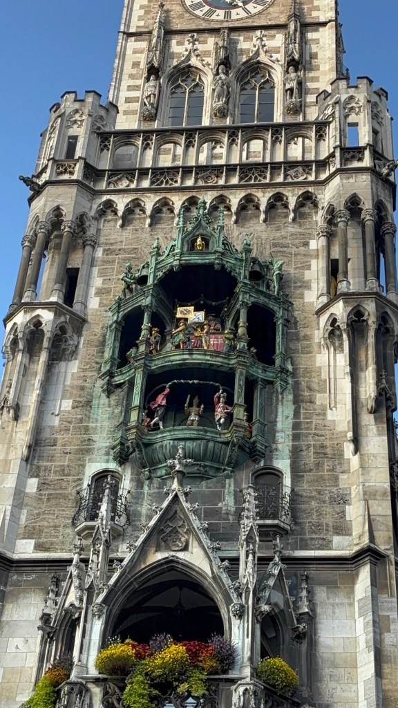 We hadn’t really spent much time in the center of the city, so we took the train and headed closer to where the old town area was. We visited the Munich Cathedral, wandering around inside and heading up for the rooftop views. From there, we wandered back through the streets, listening to street musicians, stepping into another church or two, and finally ending up in Marienplatz, the main town square, for the 5 PM showing of the clock show, which lasted around 10 minutes and showcased life-sized characters enacting scenes from munich’s history.