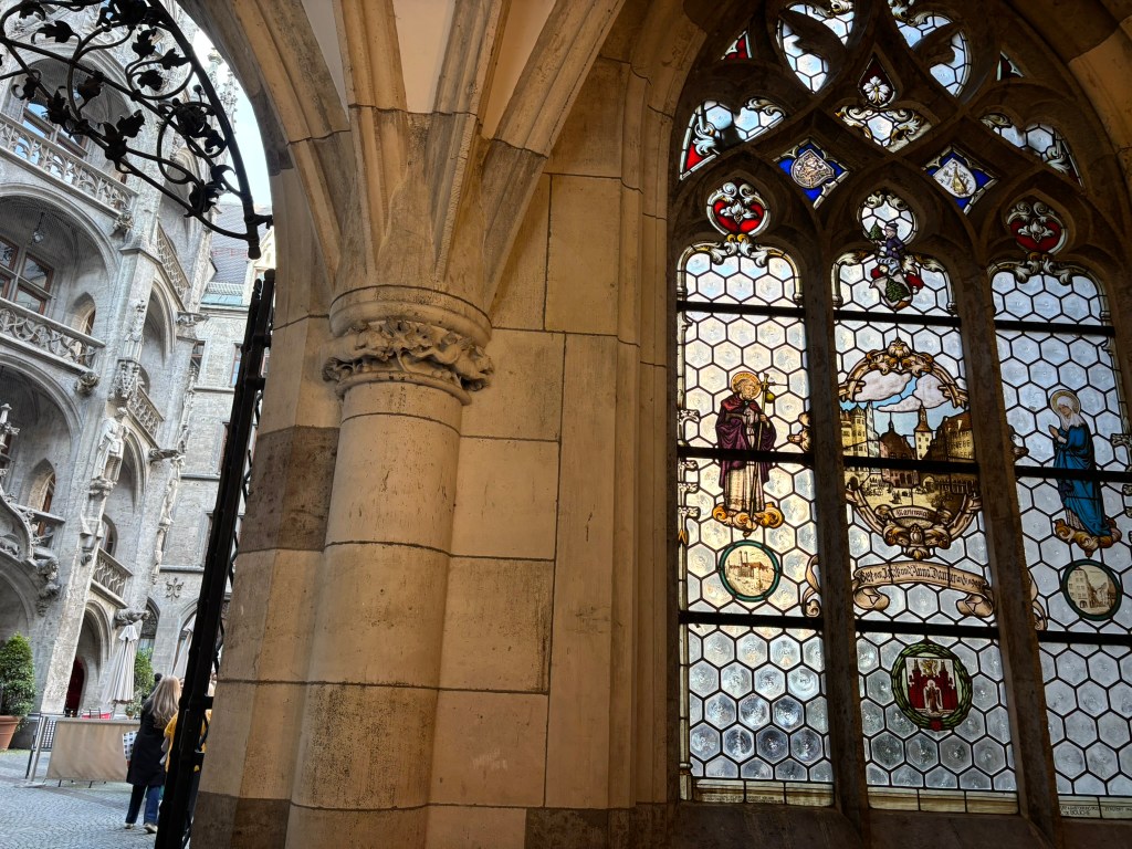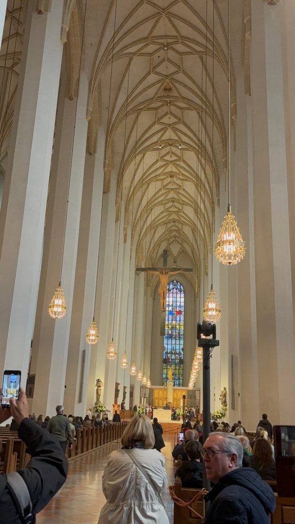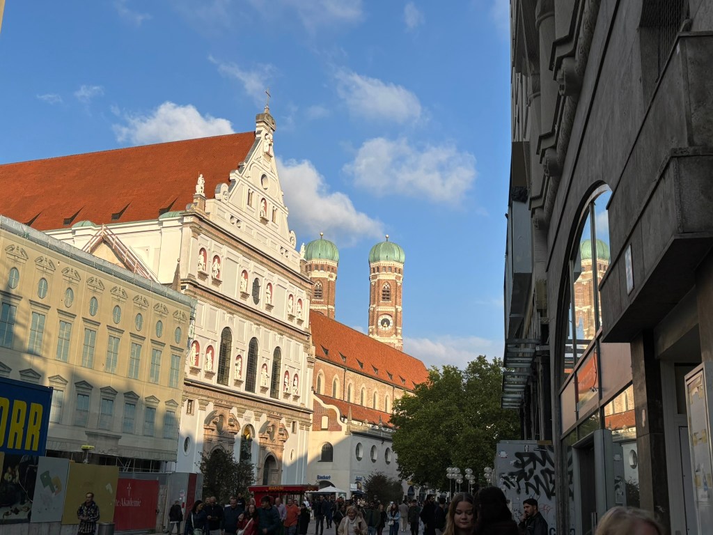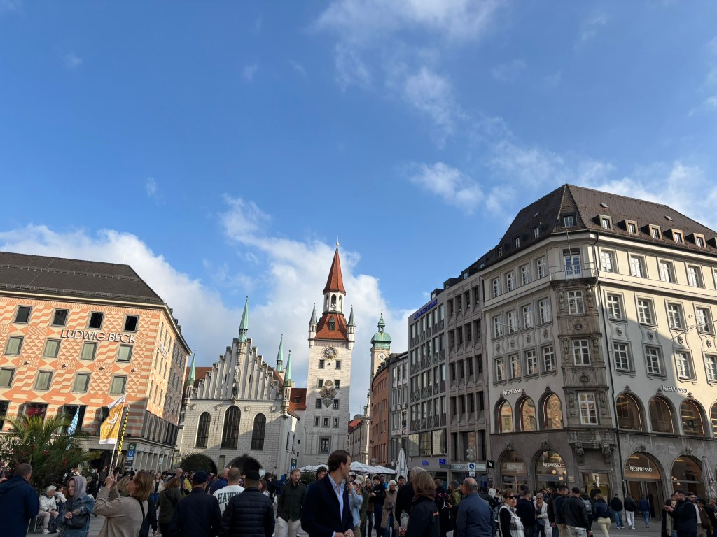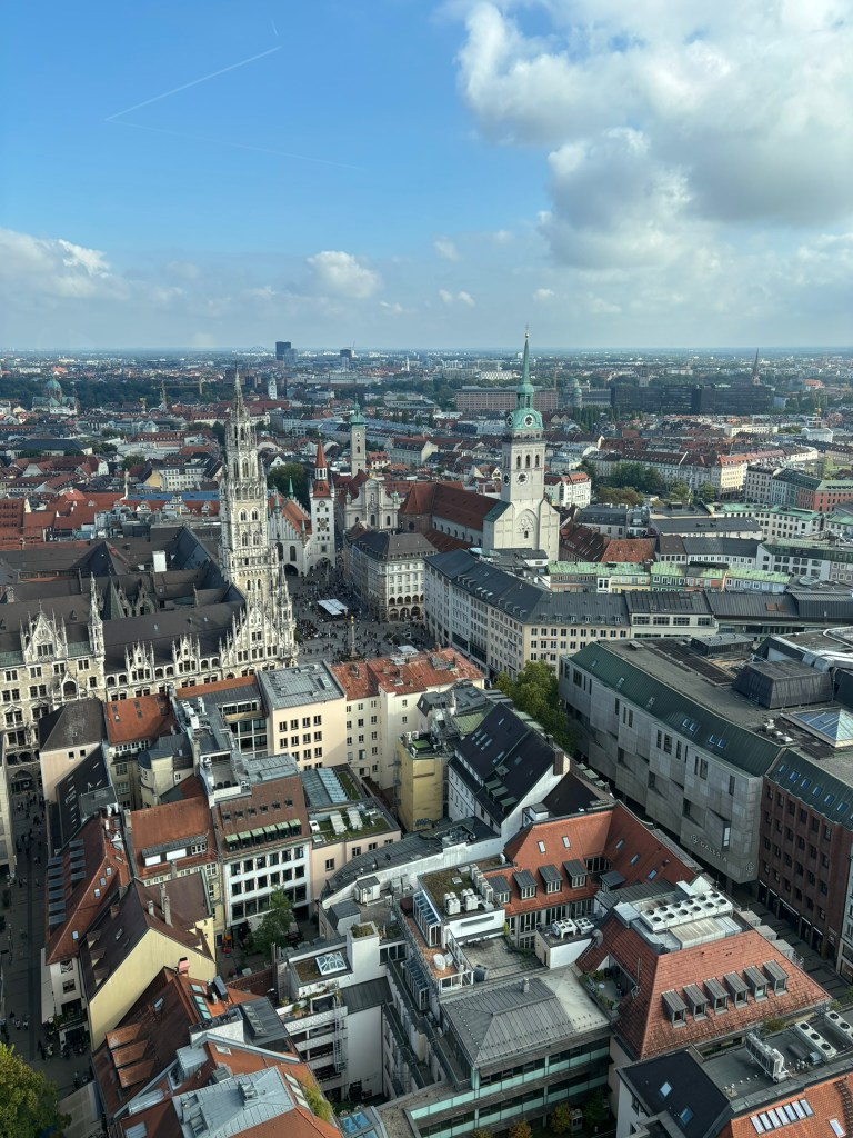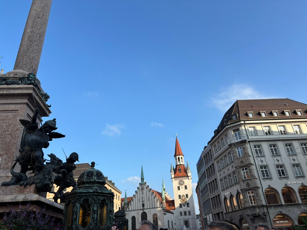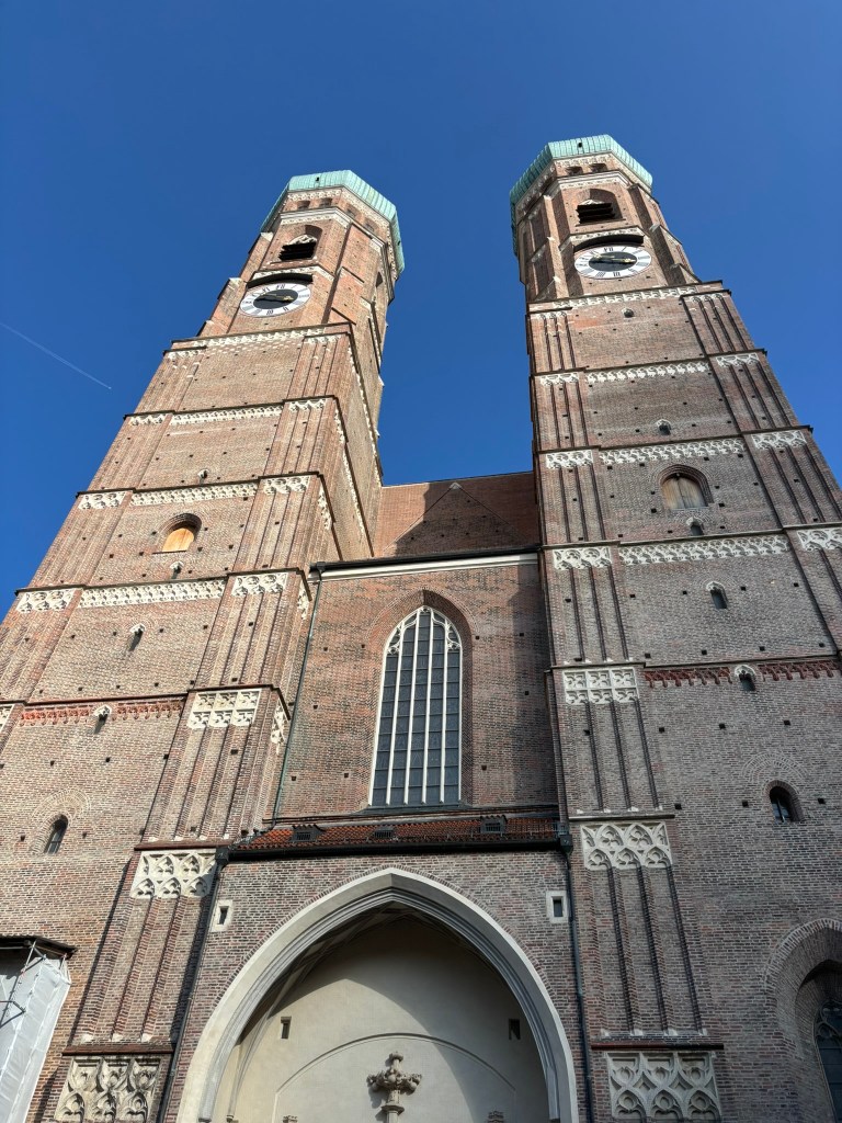 We hadn’t really spent much time in the center of the city, so we took the train and headed closer to where the old town area was. We visited the Munich Cathedral, wandering around inside and heading up for the rooftop views. From there, we wandered back through the streets, listening to street musicians, stepping into another church or two, and finally ending up in Marienplatz, the main town square, for the 5 PM showing of the clock show, which lasted around 10 minutes and showcased life-sized characters enacting scenes from munich’s history.