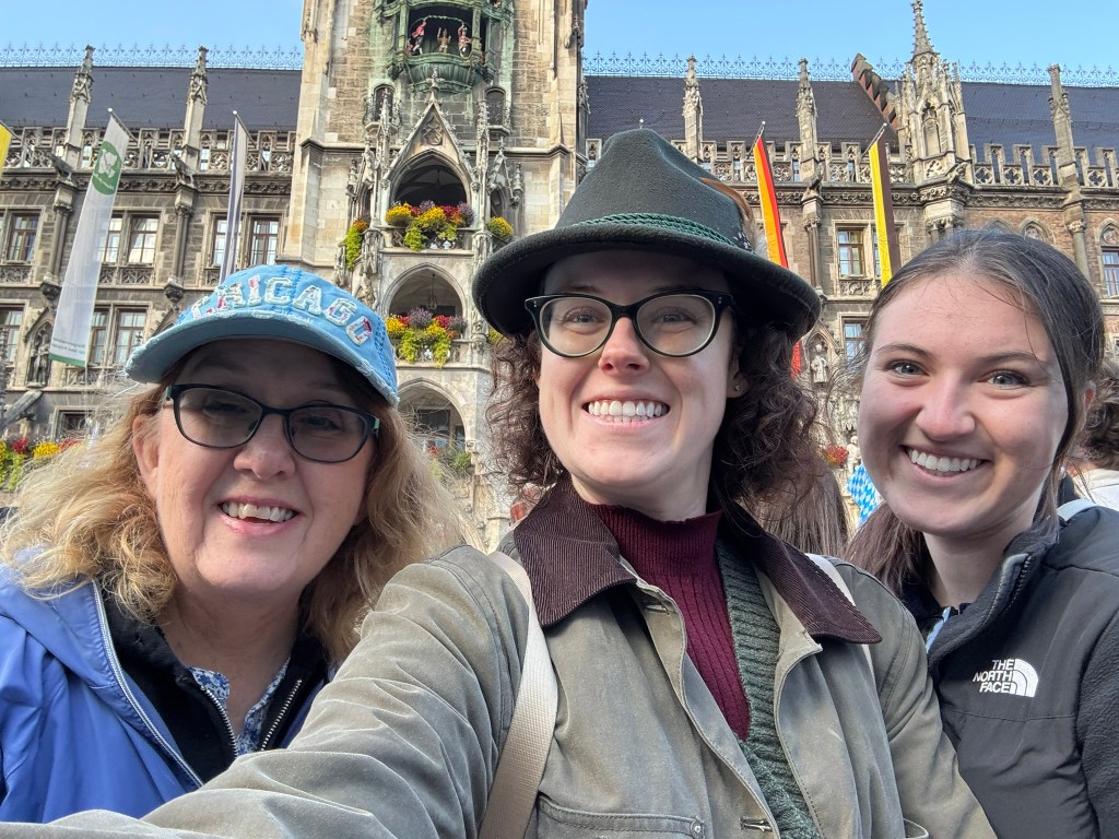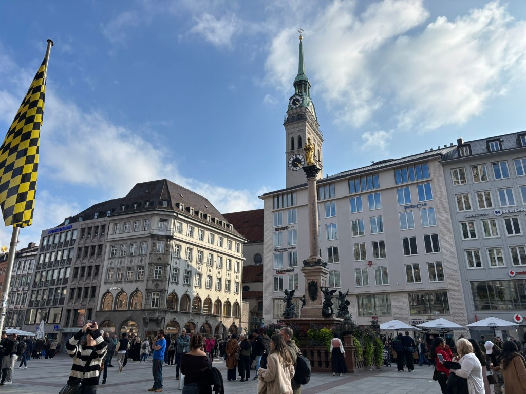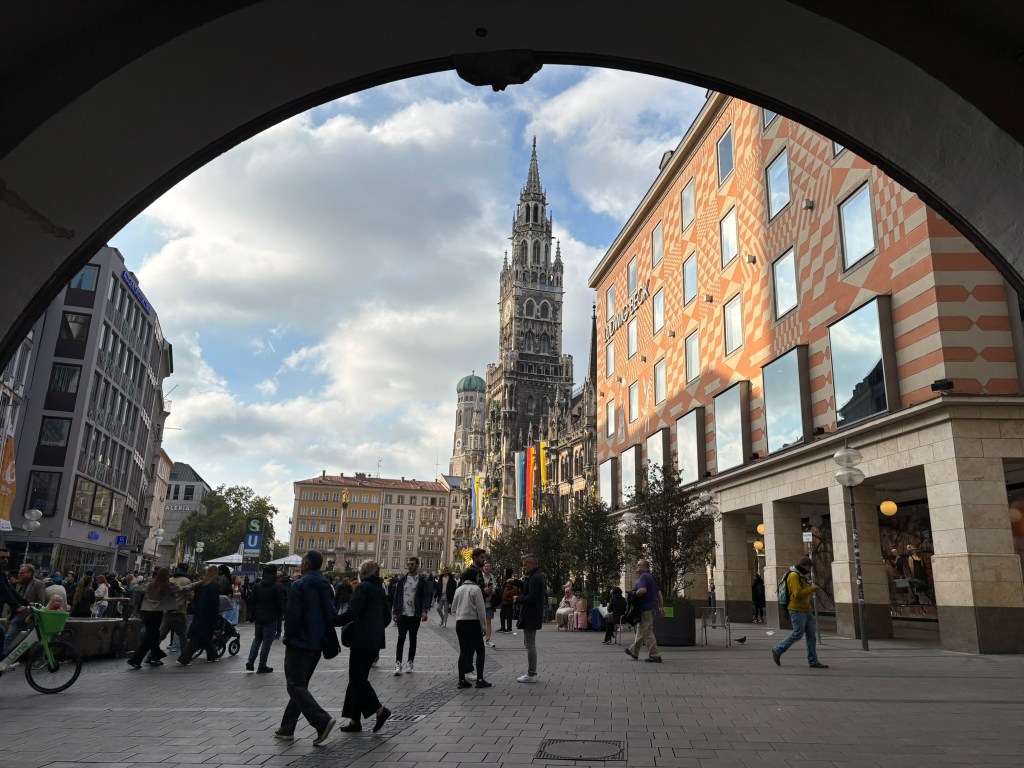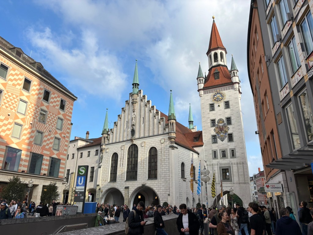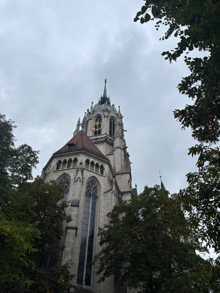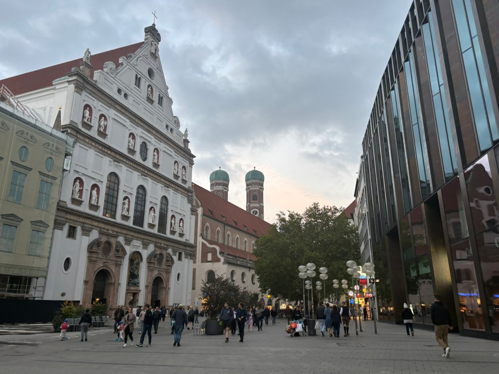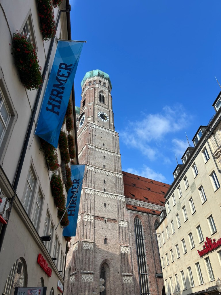 We hadn’t really spent much time in the center of the city, so we took the train and headed closer to where the old town area was. We visited the Munich Cathedral, wandering around inside and heading up for the rooftop views. From there, we wandered back through the streets, listening to street musicians, stepping into another church or two, and finally ending up in Marienplatz, the main town square, for the 5 PM showing of the clock show, which lasted around 10 minutes and showcased life-sized characters enacting scenes from munich’s history.