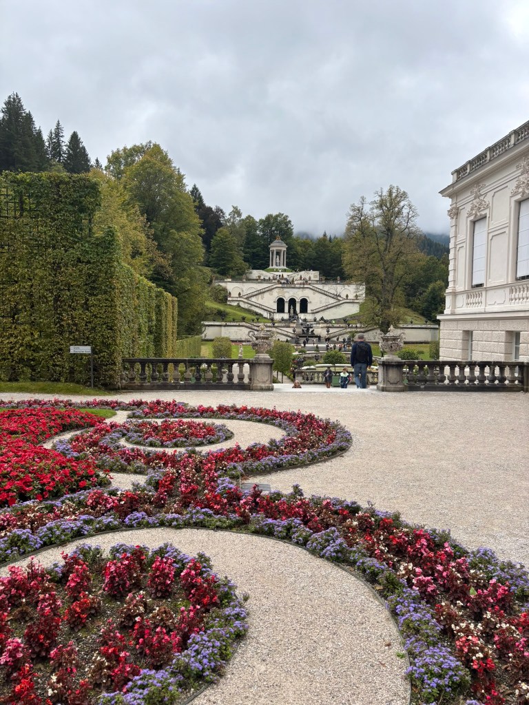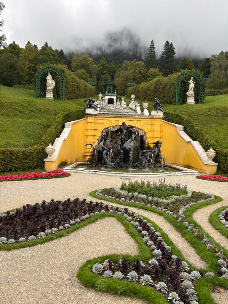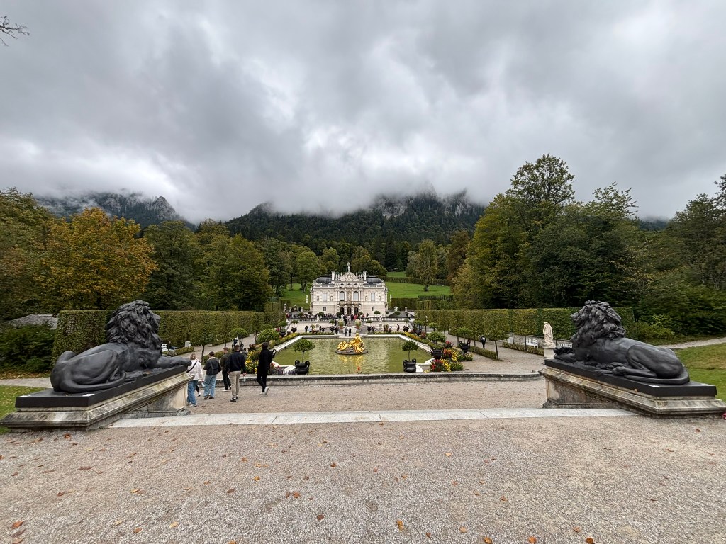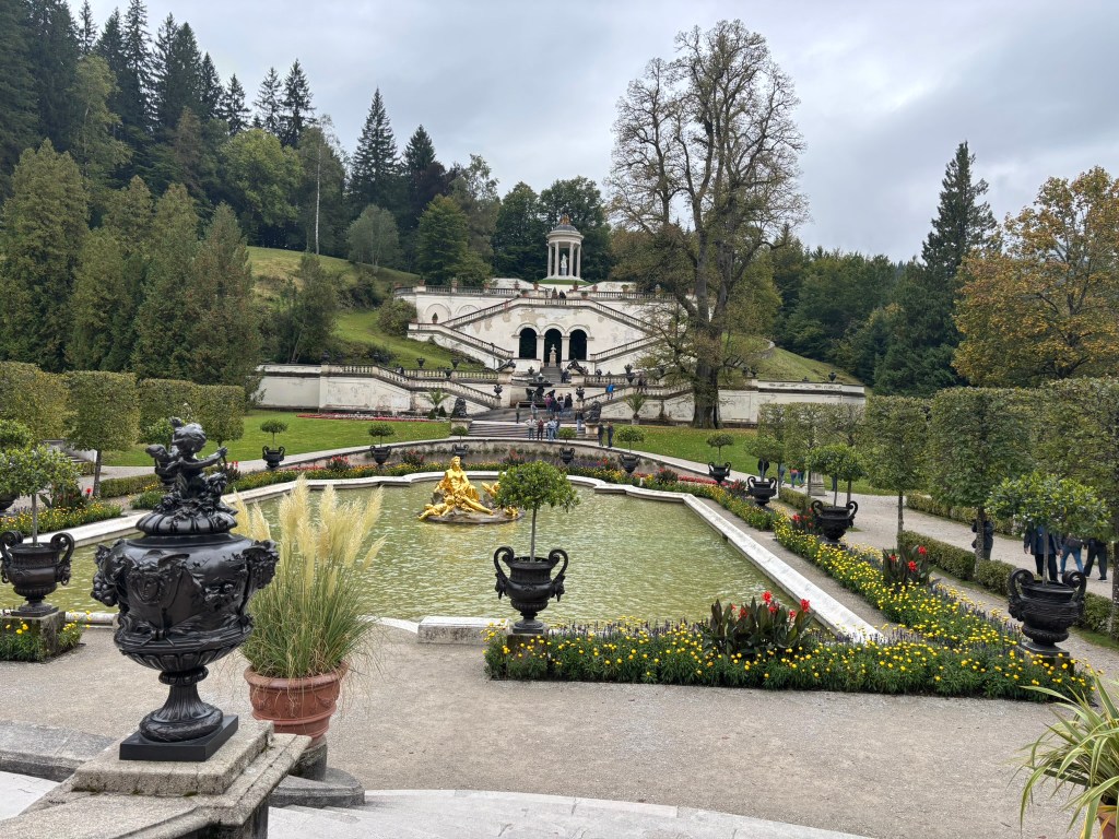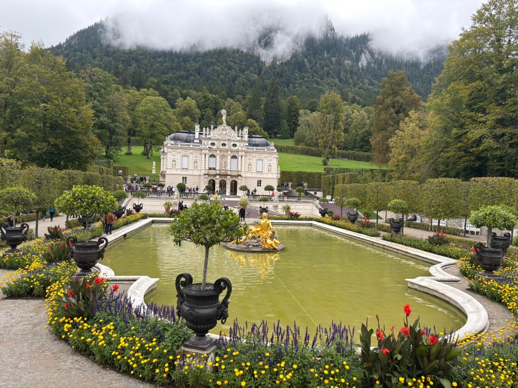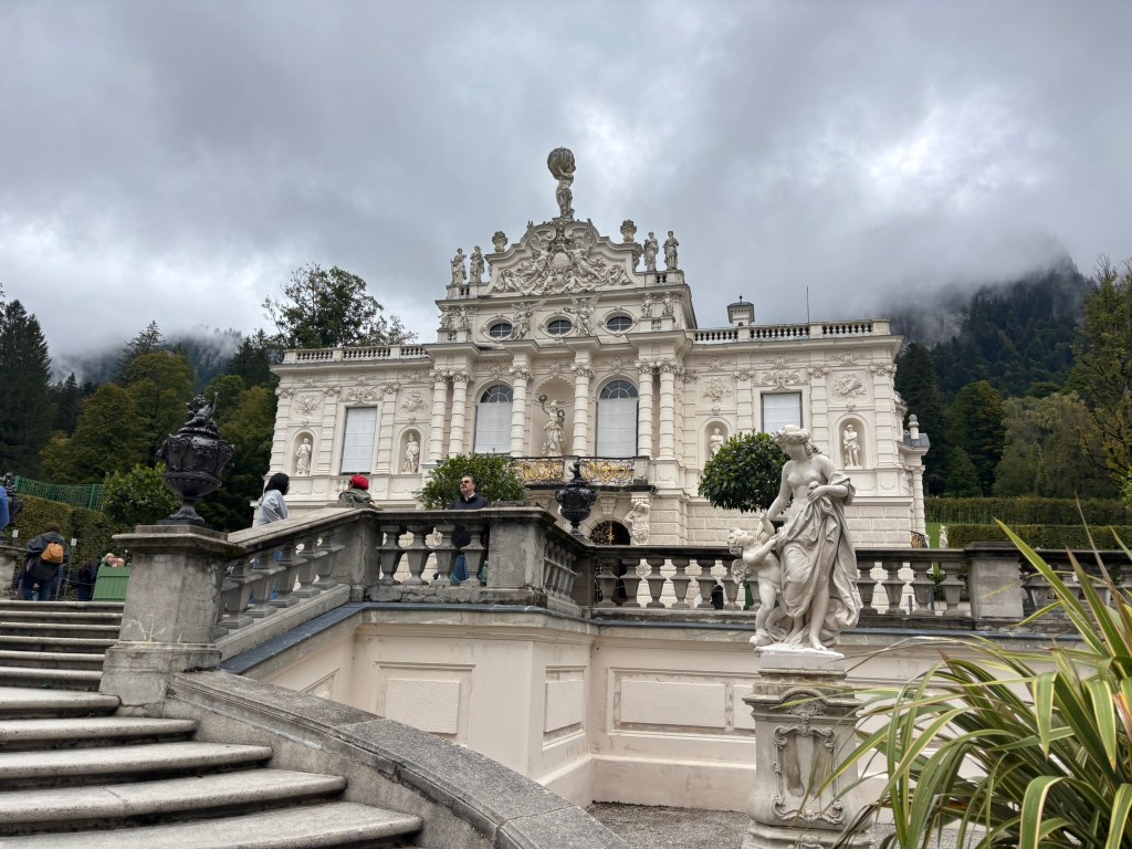 We stopped first at Linderhof, the only one of the castles King Ludwig II saw completed. It was created for just him to live in, and harkened back to the days of King Louis XVI of France, the Sun King, who was his idol. The small palace was designed to reference Versailles in numerous ways. We took a tour inside (there were no pictures allowed inside) and then wandered the grounds before heading back to our bus for the next part of our drive.