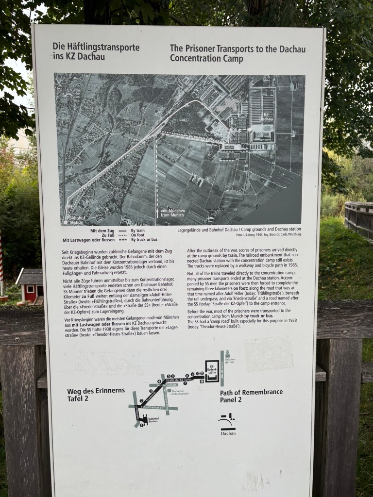 We left the hostel, took the train to the Dachau station, and then took a 40-ish minute walk to the concentration camp site. Along the way, we stumbled onto signs explaining the significance of each spot on the path to the rounding up and holding of Jewish and other populations within the camp.