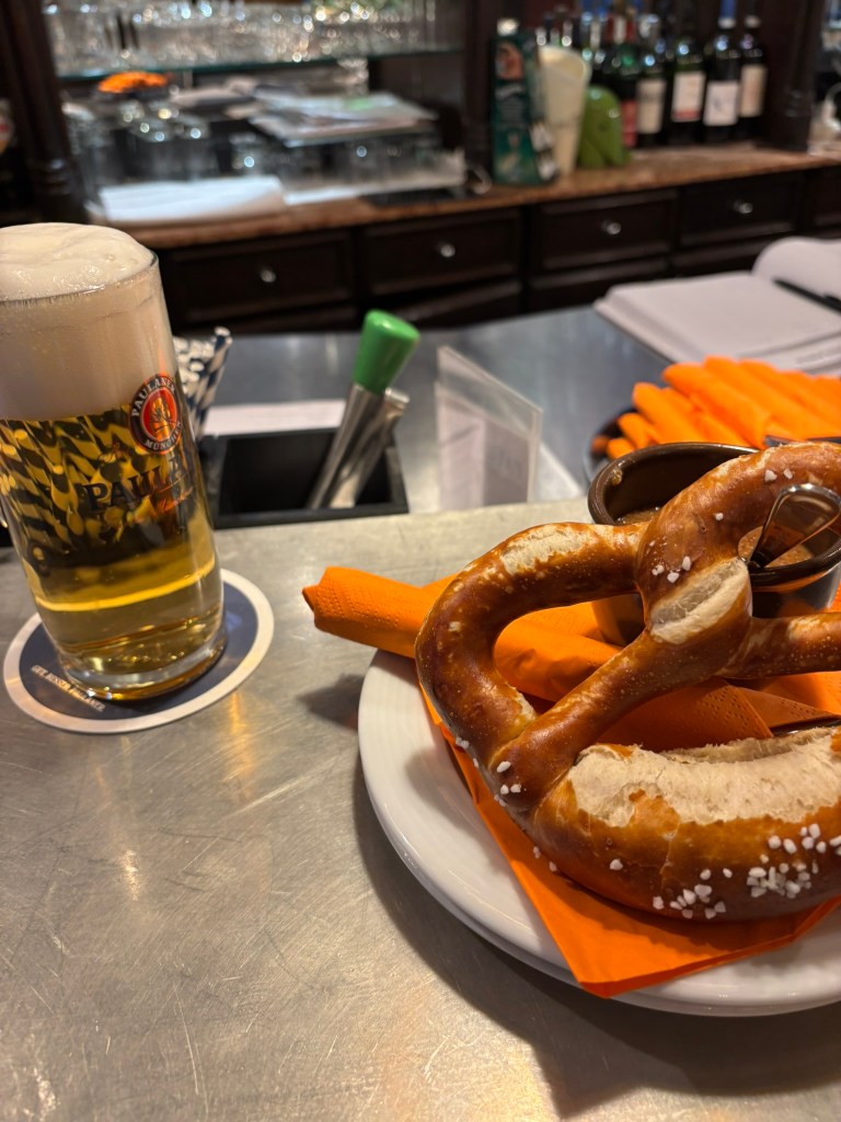 I walked back through the old town before heading to my hotel. I packed a bit, since I was heading out early the next morning. I then headed out to dinner. I went to a bar and got one last beer, sausage, and pretzel. I caught the sunset on the walk back and then finished packing before writing the rest of my first blog post and heading to bed.