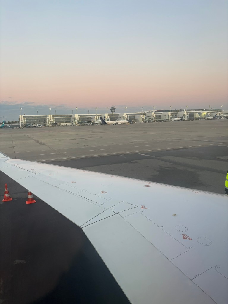 This has NEVER happened to me before, so a 4:10 AM realization in a taxi with a man who primarily spoke German was not the best mental health space I’d ever been in. I asked him to turn back, explaining that I had forgotten the passport. He understood and drove me back to the hotel. I tried to pay him when I was getting out of the taxi, but he insisted on waiting for me. I then had to buzz myself into the hotel, since it was still early enough that the doors were locked. I managed to be buzzed in, but the hotel staff was not at the desk when I got in, so I had to ring the bell to summon her. I explained I’d left the passport in the room and had already turned in the key. She returned the key to me and remarked that it had confused her. Then, I quite literally RAN down the hallway to the room. I got the passport and secured it back where it belonged, safely around my neck. I checked to see if I had any more Euros, but I didn’t. I asked a different staff member who was cleaning if there was an ATM around and open in the hotel (since Google Maps said in the car that there was), but she told me it wasn’t open. So I had to go check with the taxi driver, who had waited at this point over 10 minutes for me, if he accepted credit cards. He did, so I was set. I hopped back into the taxi and started the drive, arriving shortly after 5 AM. I paid the driver the cost of the ride (far less than I anticipated, considering the wait) and gave him all my remaining cash as a tip. Then I headed into the airport. I checked my bag, went through security. I had the chance to go to the bathroom before the plane loaded. After we took off, I caught the sunrise on the hour-long flight back to Munich.